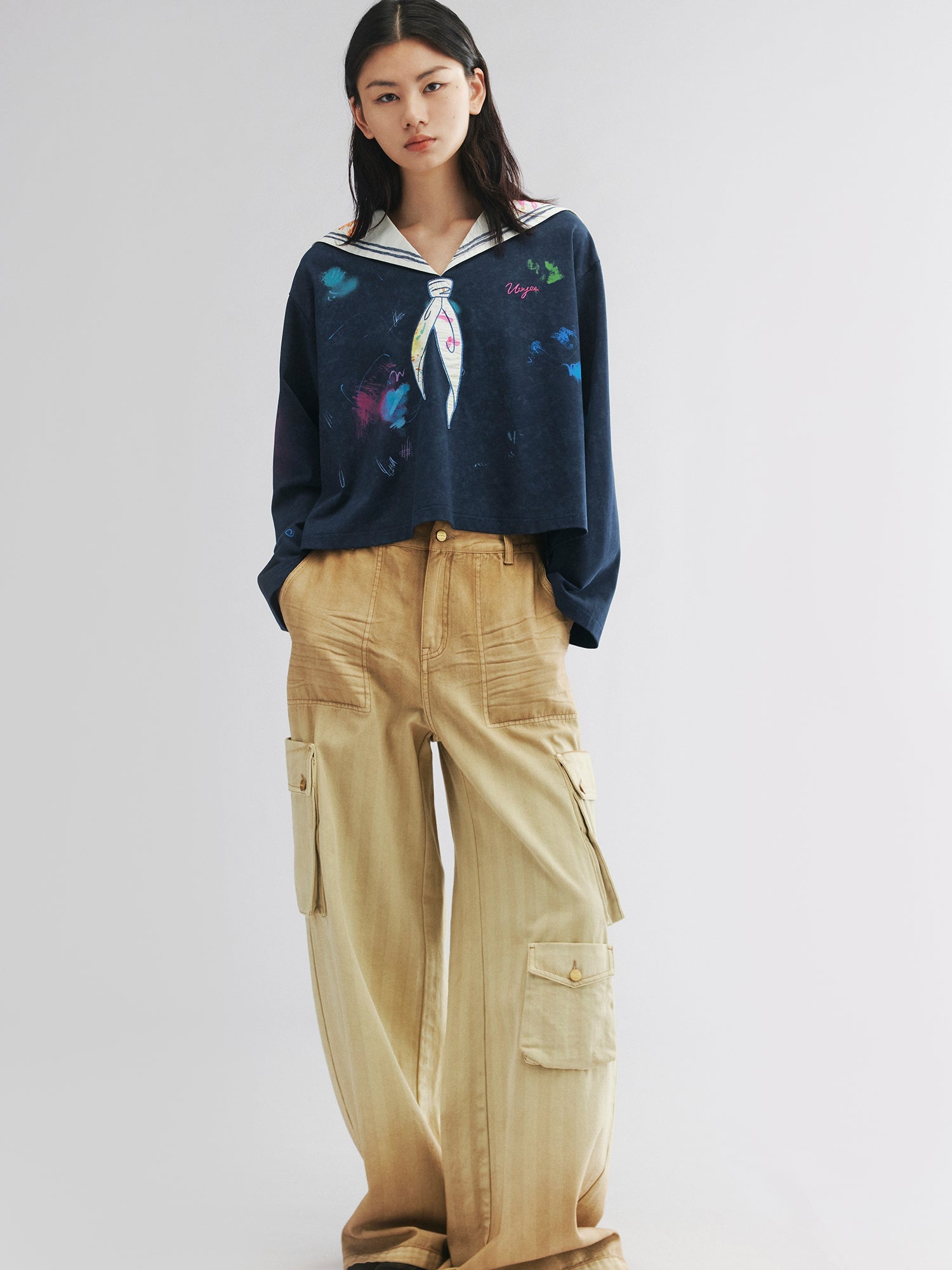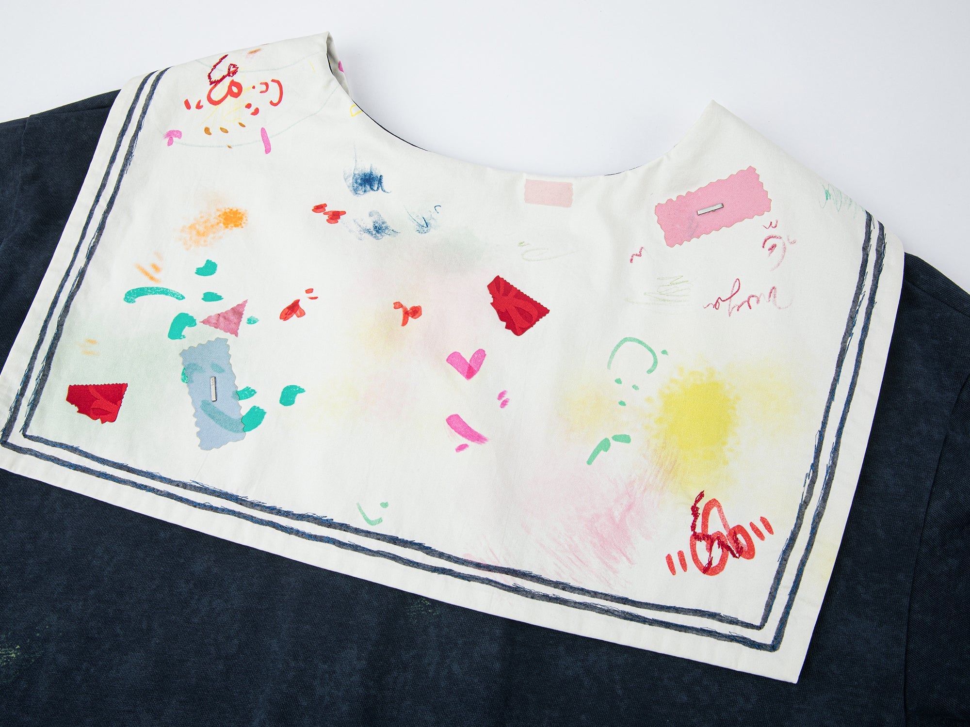 Adds graffiti prints and stapled fabric scraps in a remake approach to reinterpret the classic sailor collar tee. Cropped length boosts playfulness.