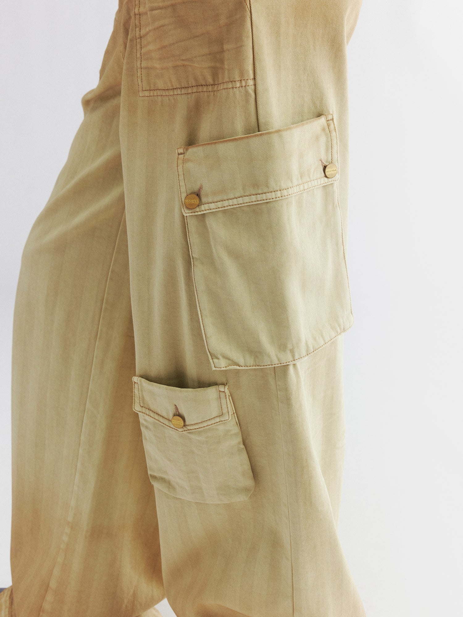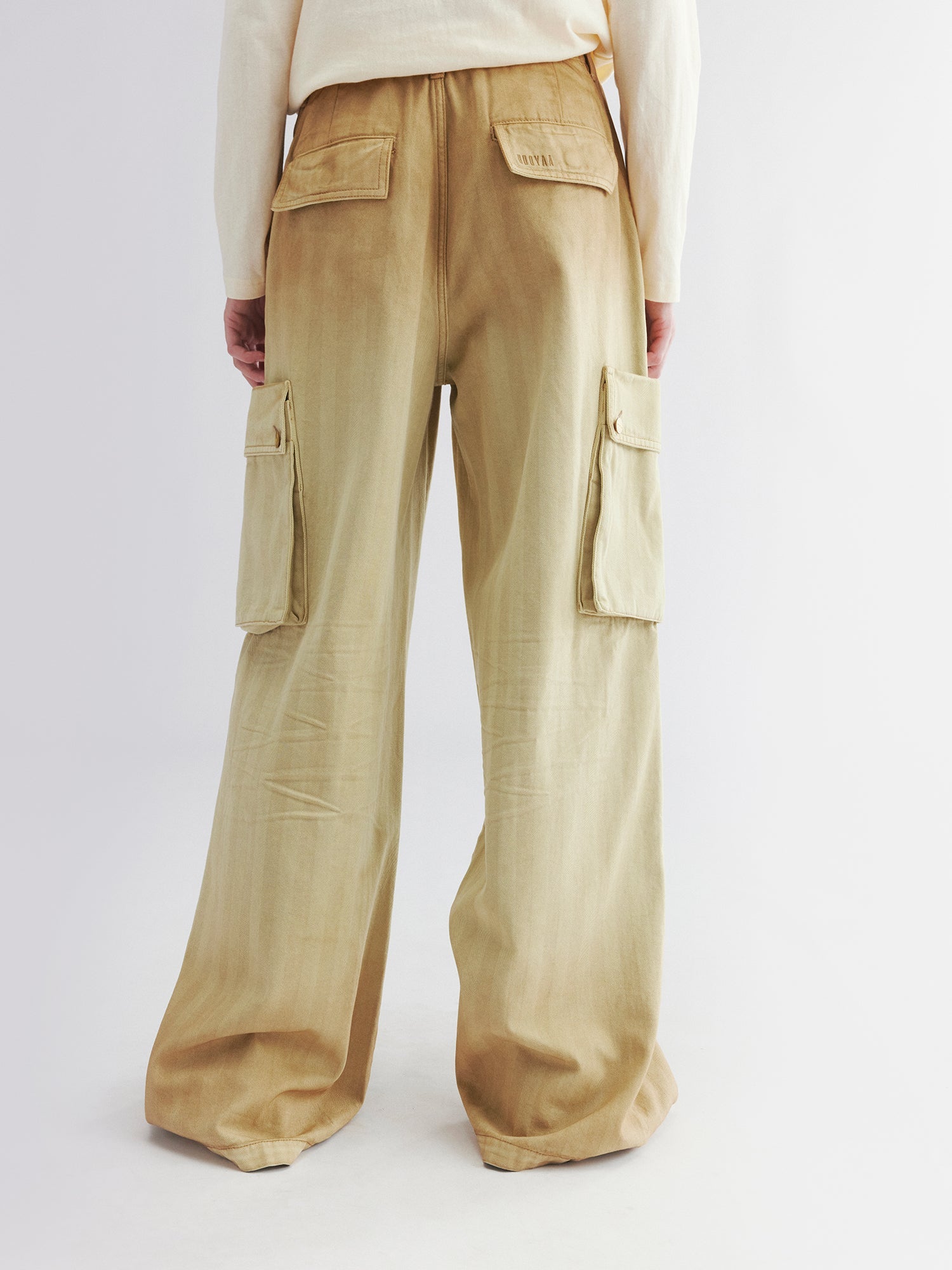 Features gradient khaki spray finish and distressed whiskers for dimension. Irregular pockets add style and function. Straight-leg shape fits loosely.