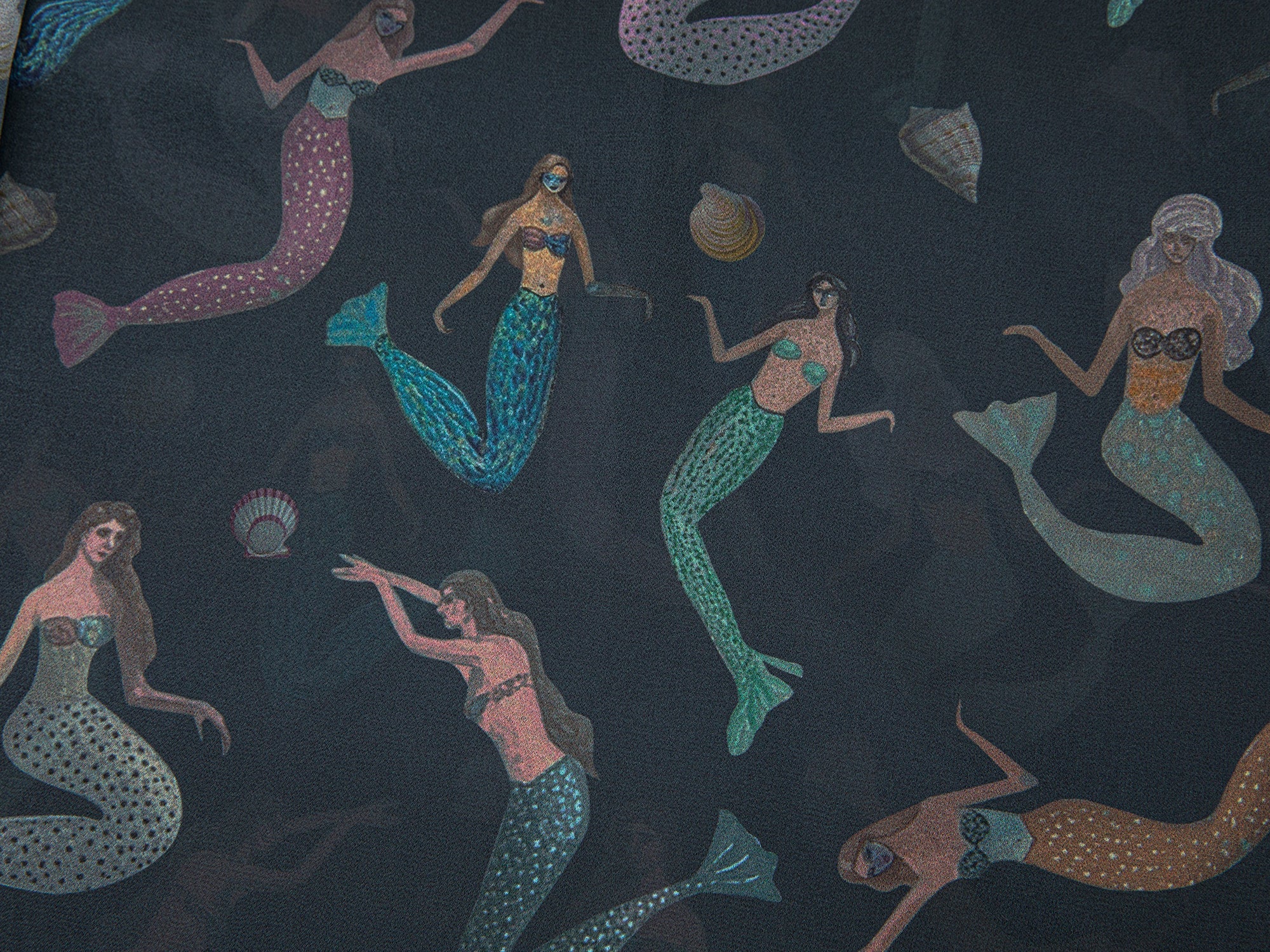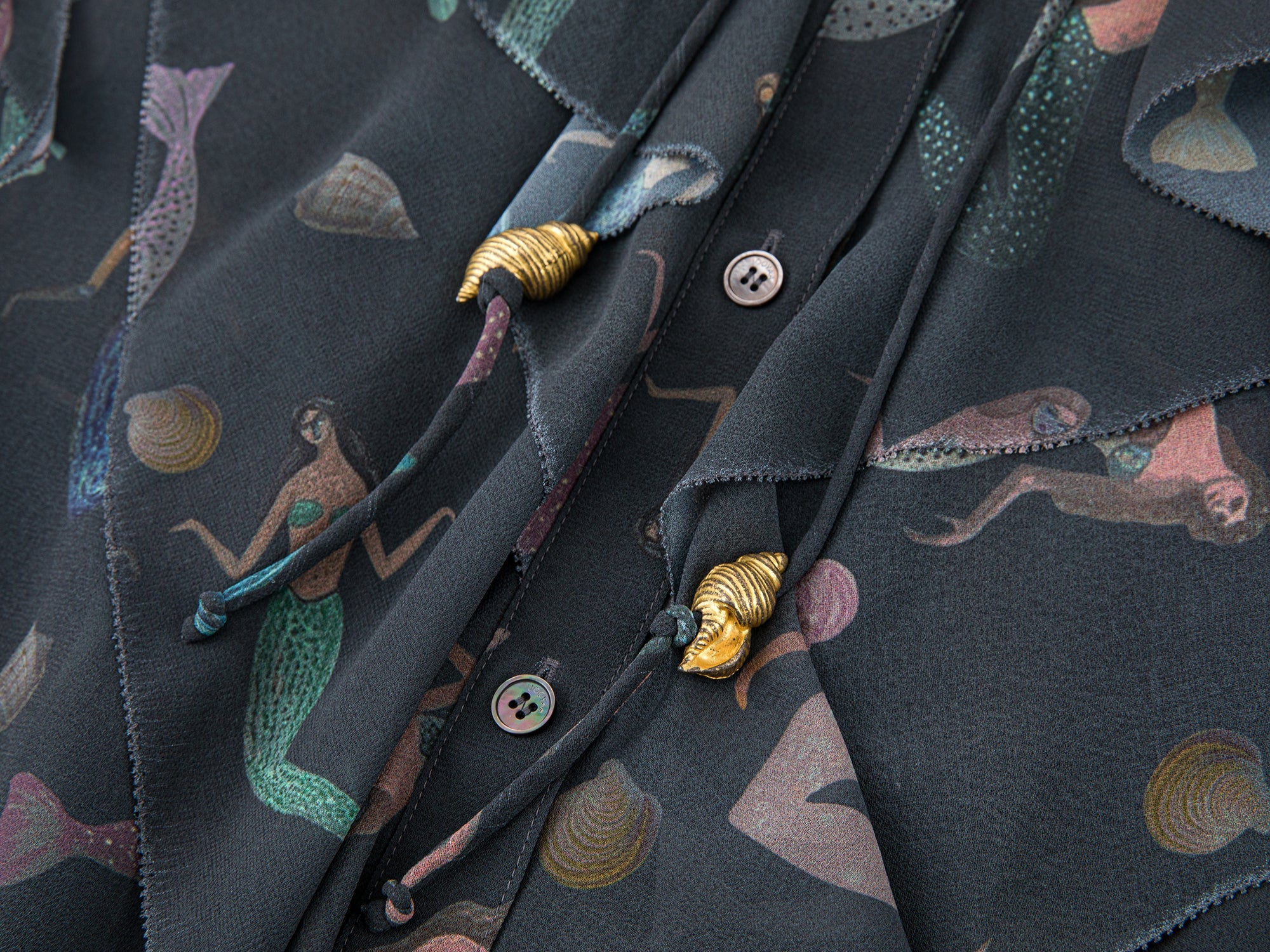 Mermaid prints give this ruffle-collared blouse a dream-like charm with a hint of whimsy.