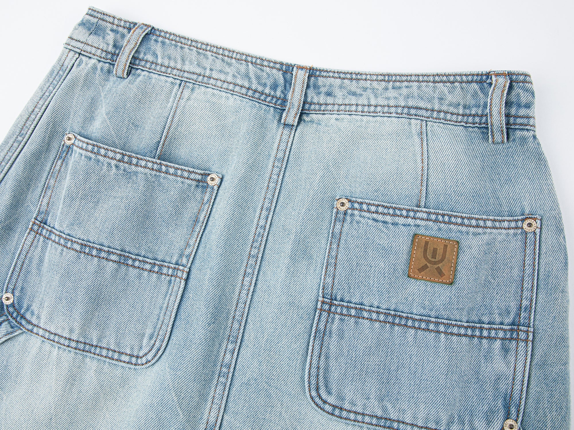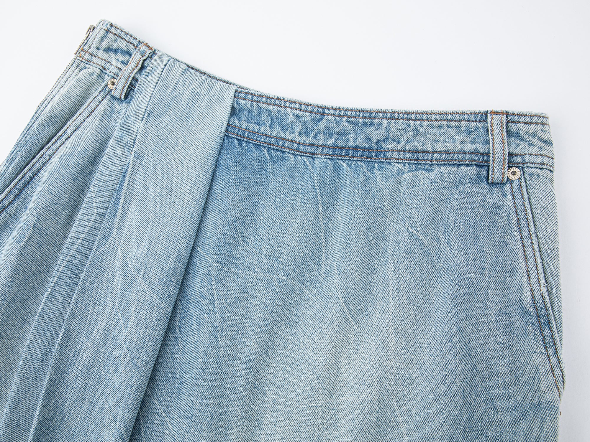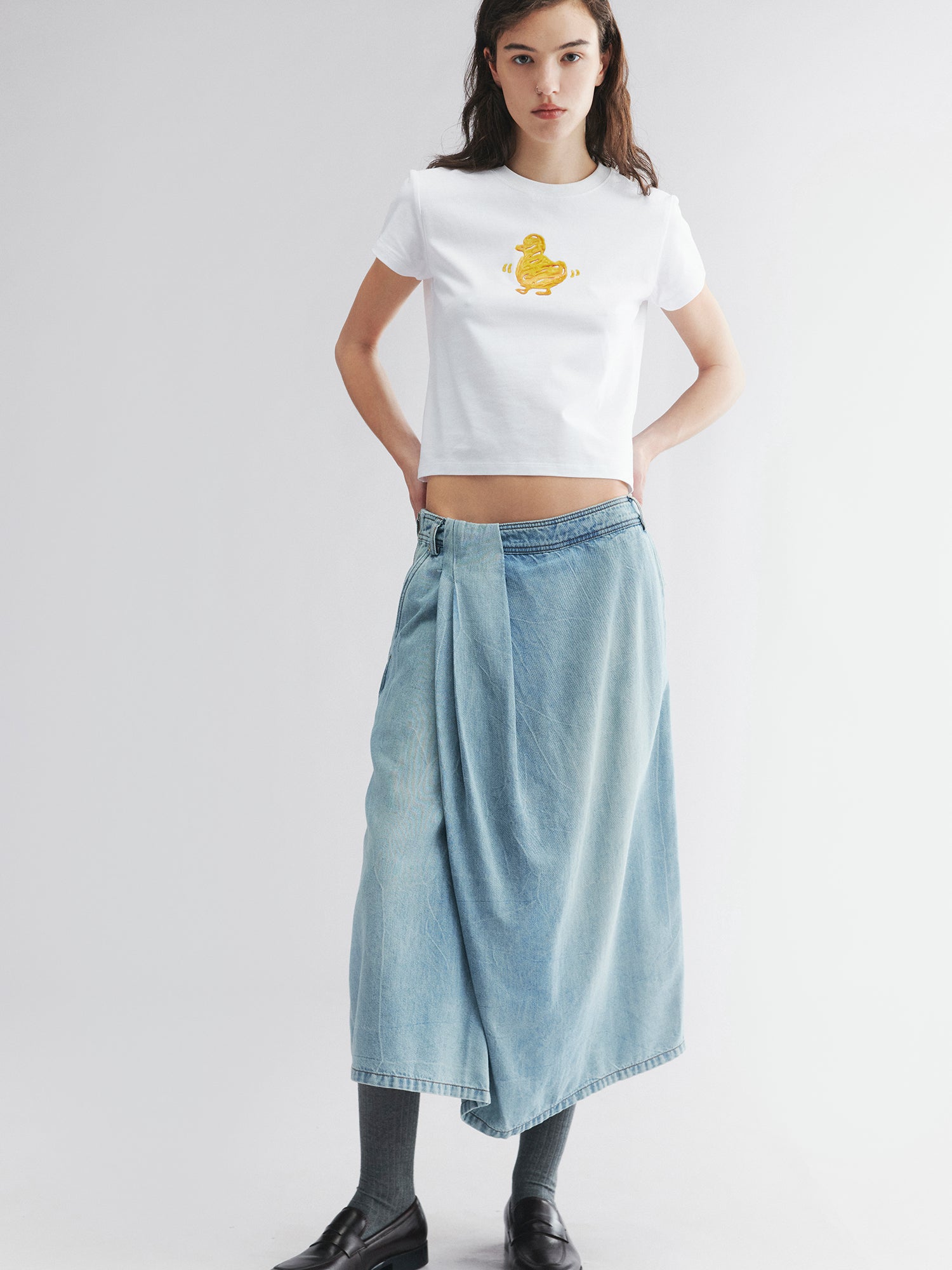 A wrap-style skirt mimics a tucked-in shirt corner for a relaxed, workwear-inspired look.