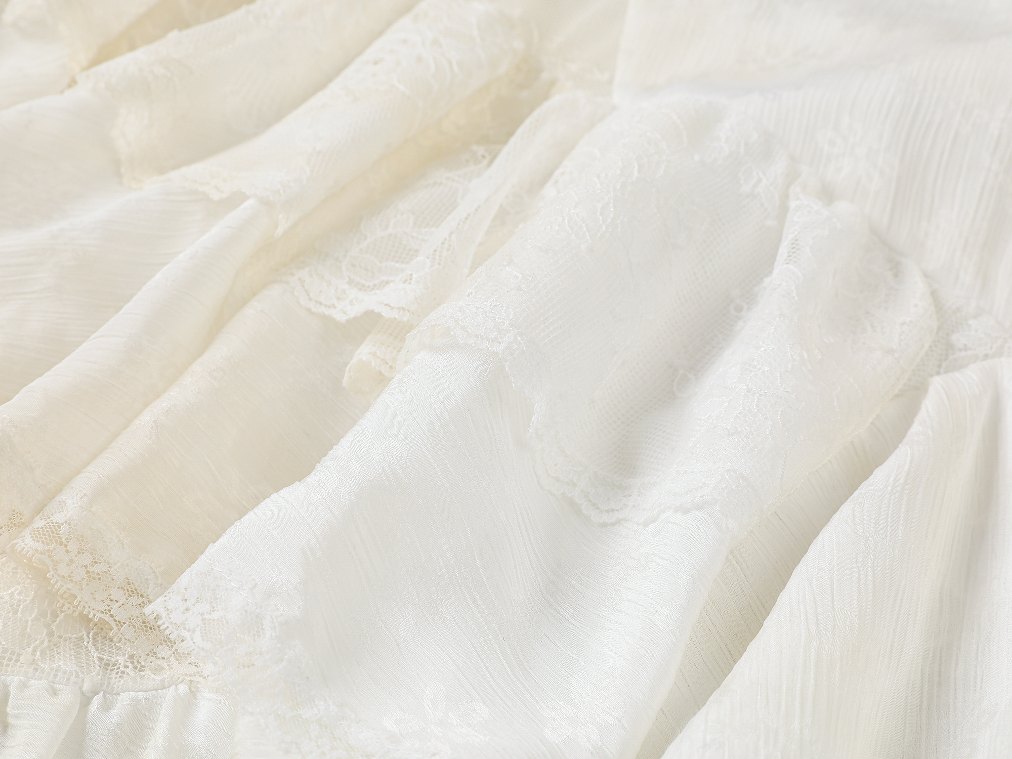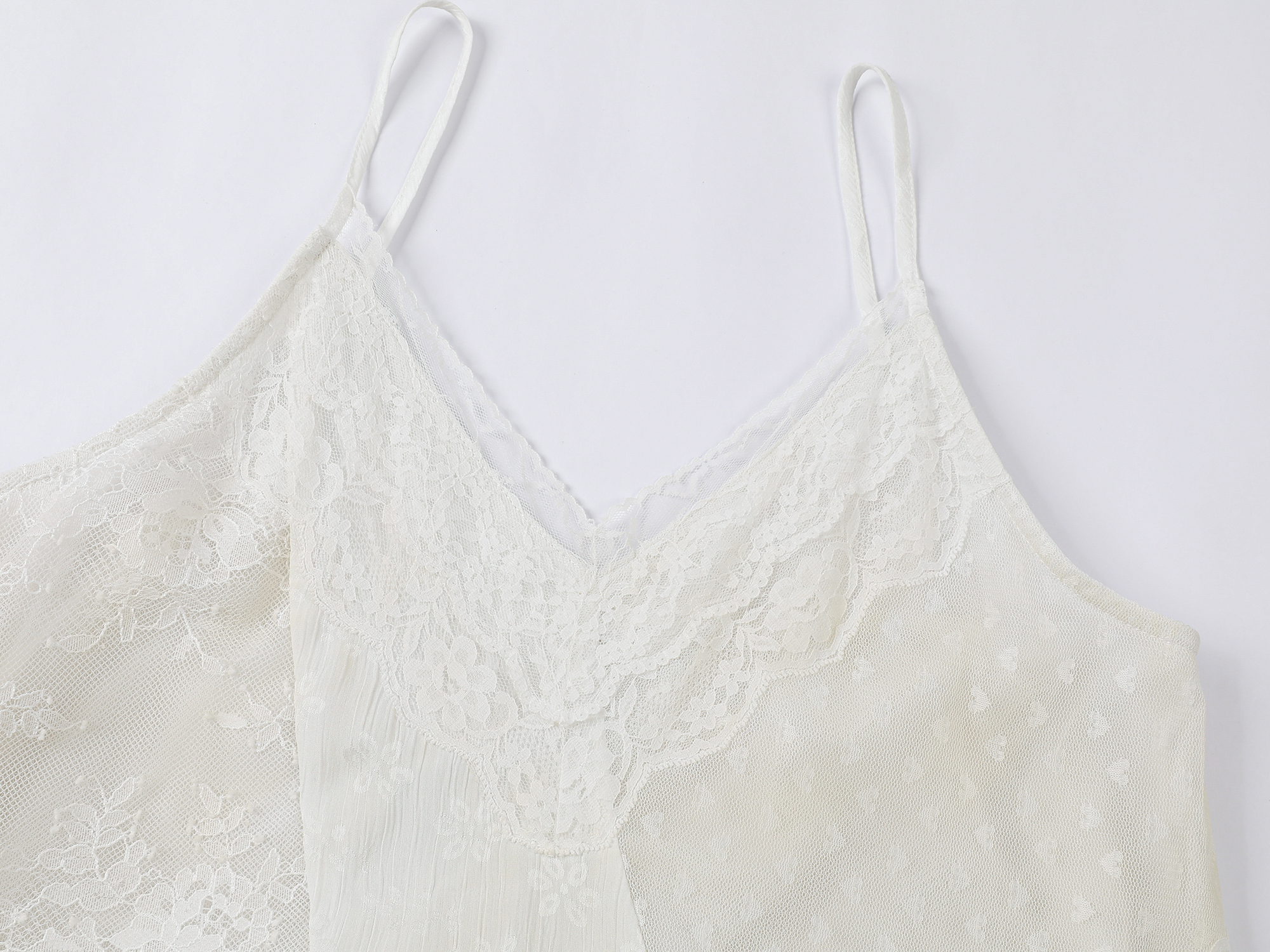 Blends two lace fabrics with two trims in layered panels. The construction is complex yet lightweight, offering comfort with a romantic, relaxed feminine vibe.