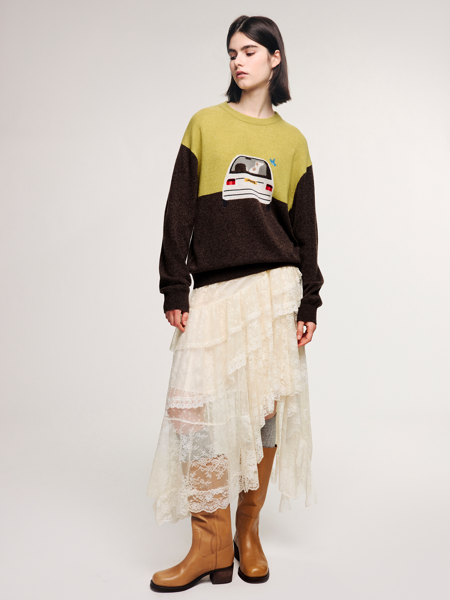 Blends two lace fabrics with two trims in layered panels. The construction is complex yet lightweight, offering comfort with a romantic, relaxed feminine vibe.Fabric: