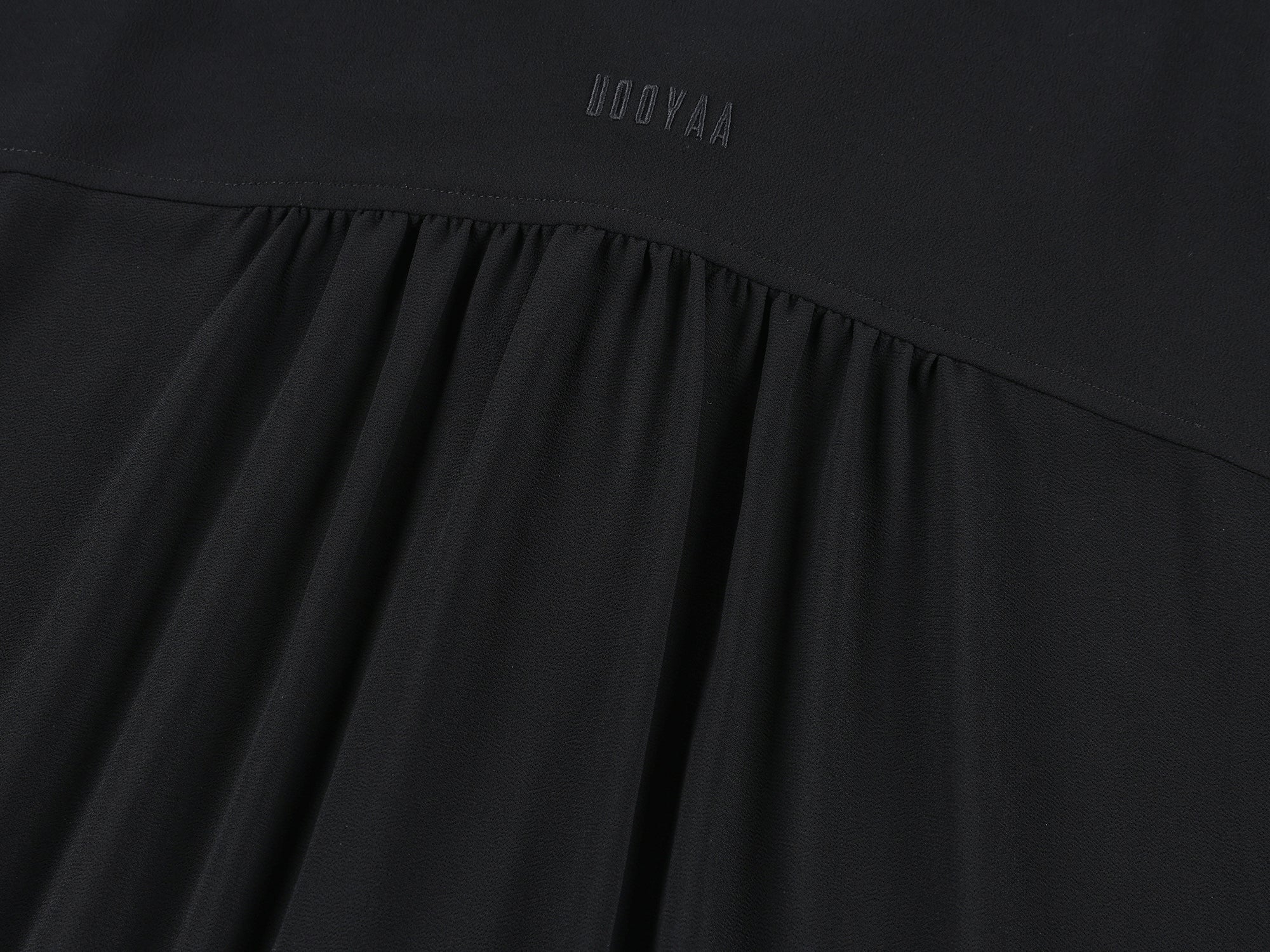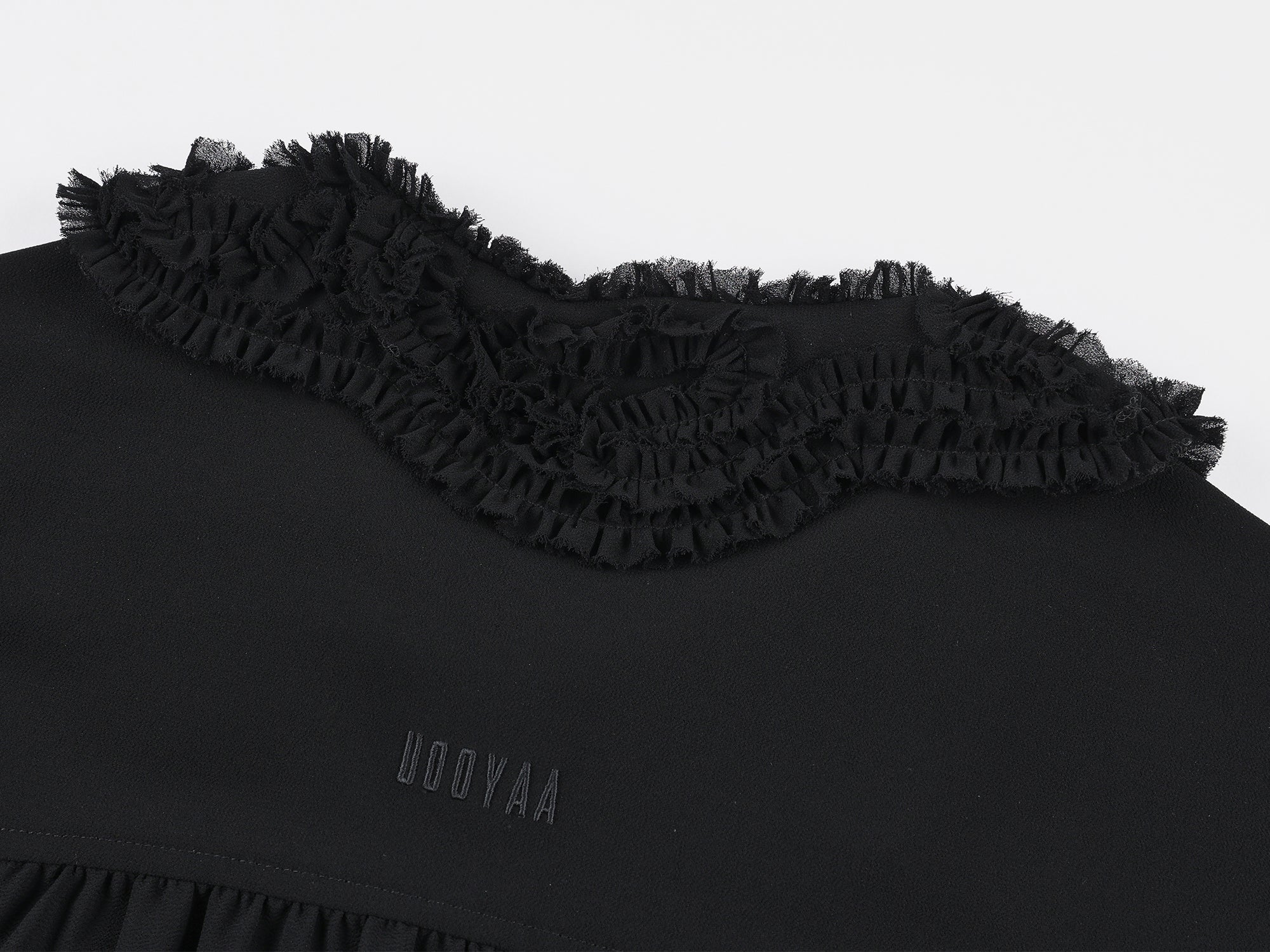 This sheer chiffon blouse features romantic ruffle trims, a tied neckline, and balloon sleeves with elastic cuffs, offering a relaxed yet elegant silhouette.