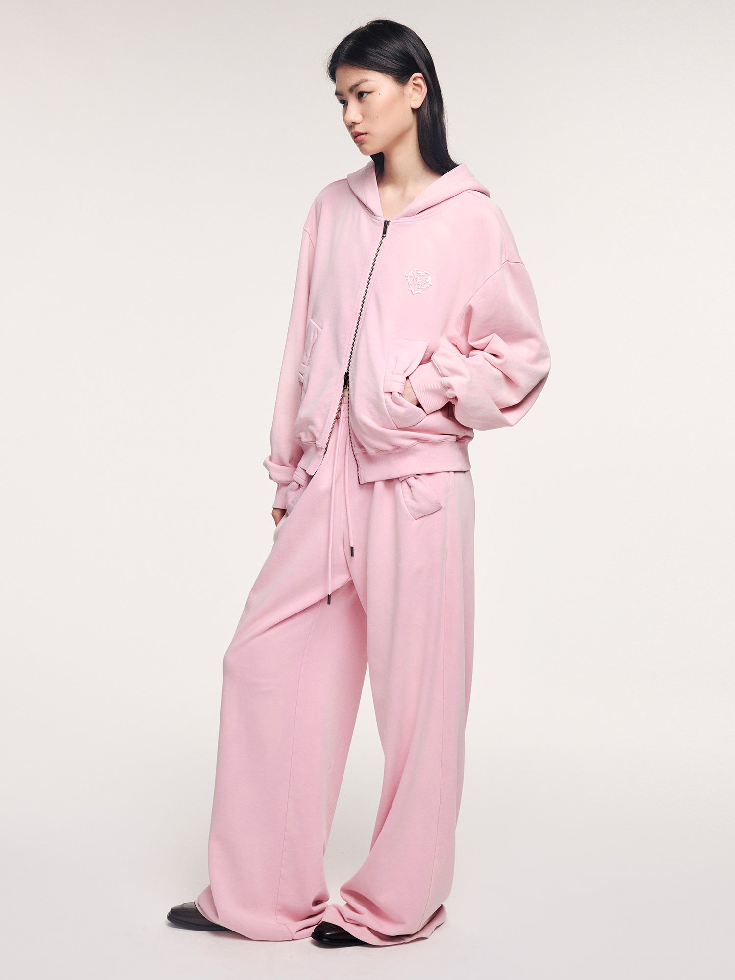 This cropped hoodie is accented with bow-shaped pockets and a soft pink wash finish, giving it a playful and youthful energy.