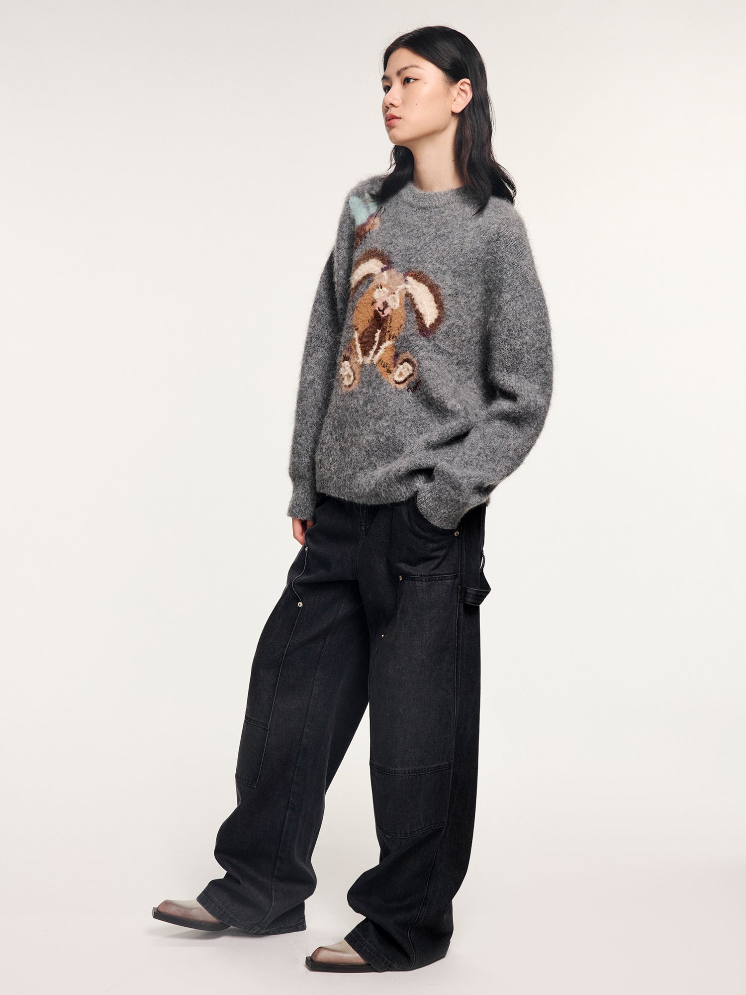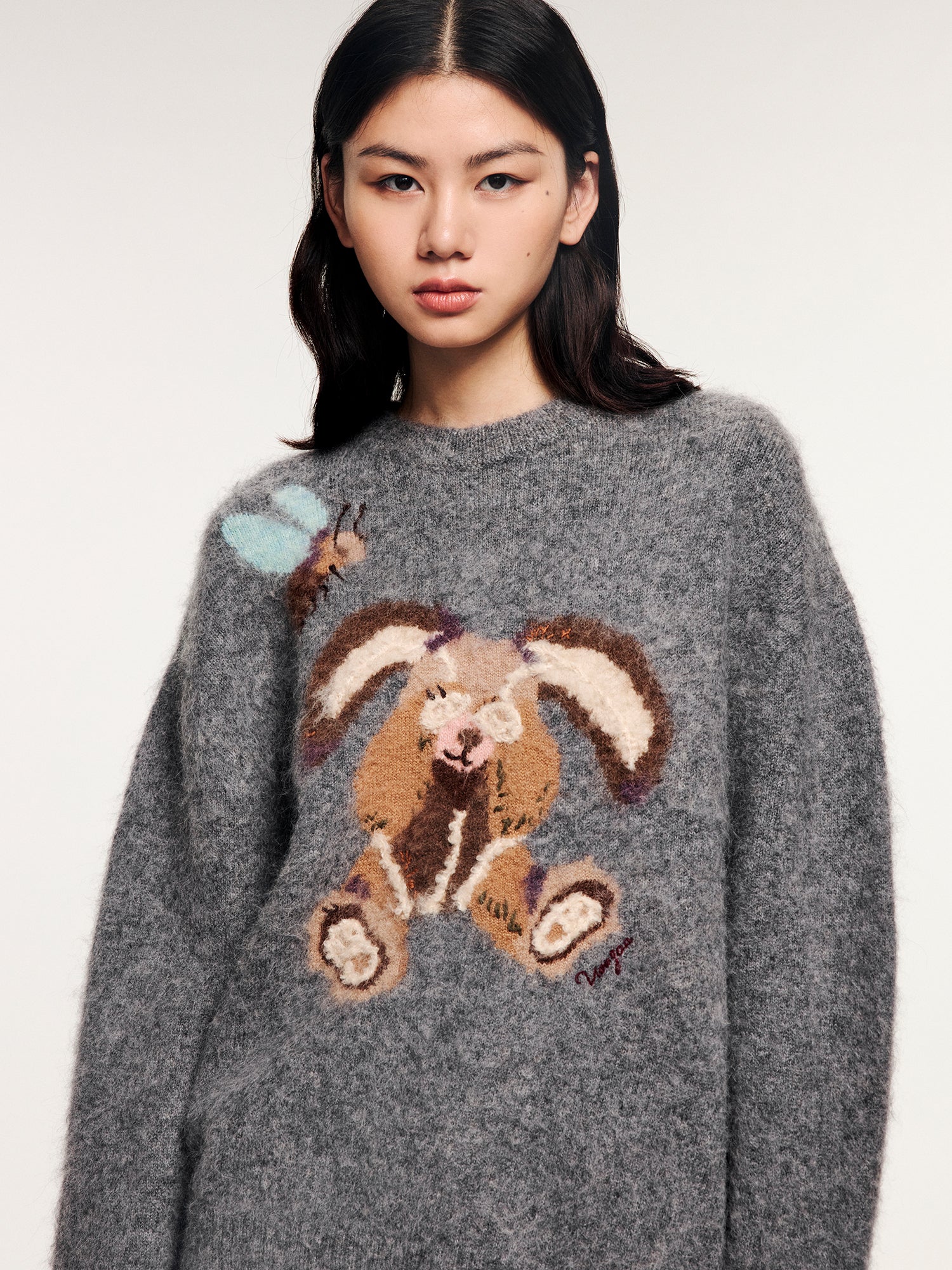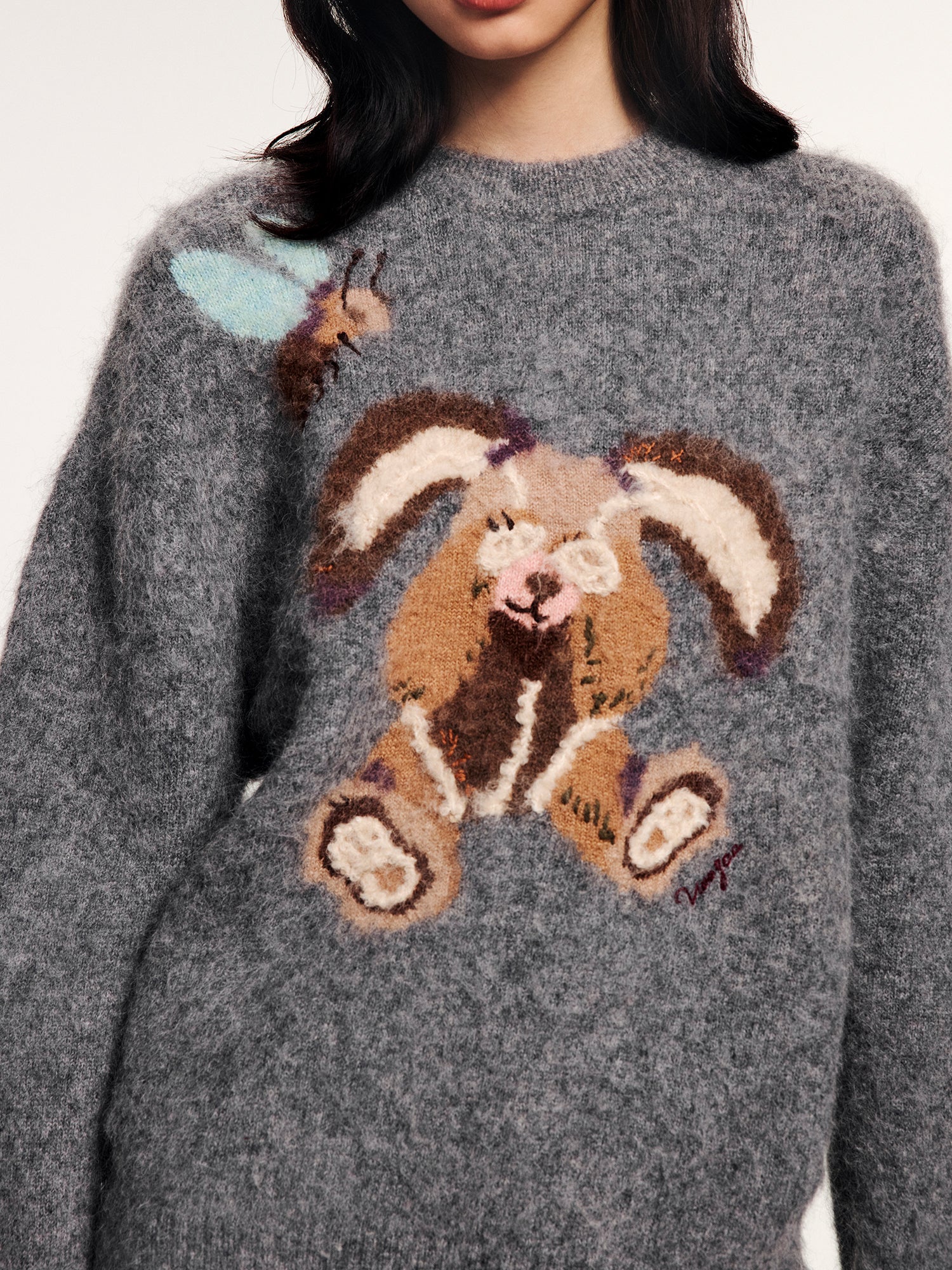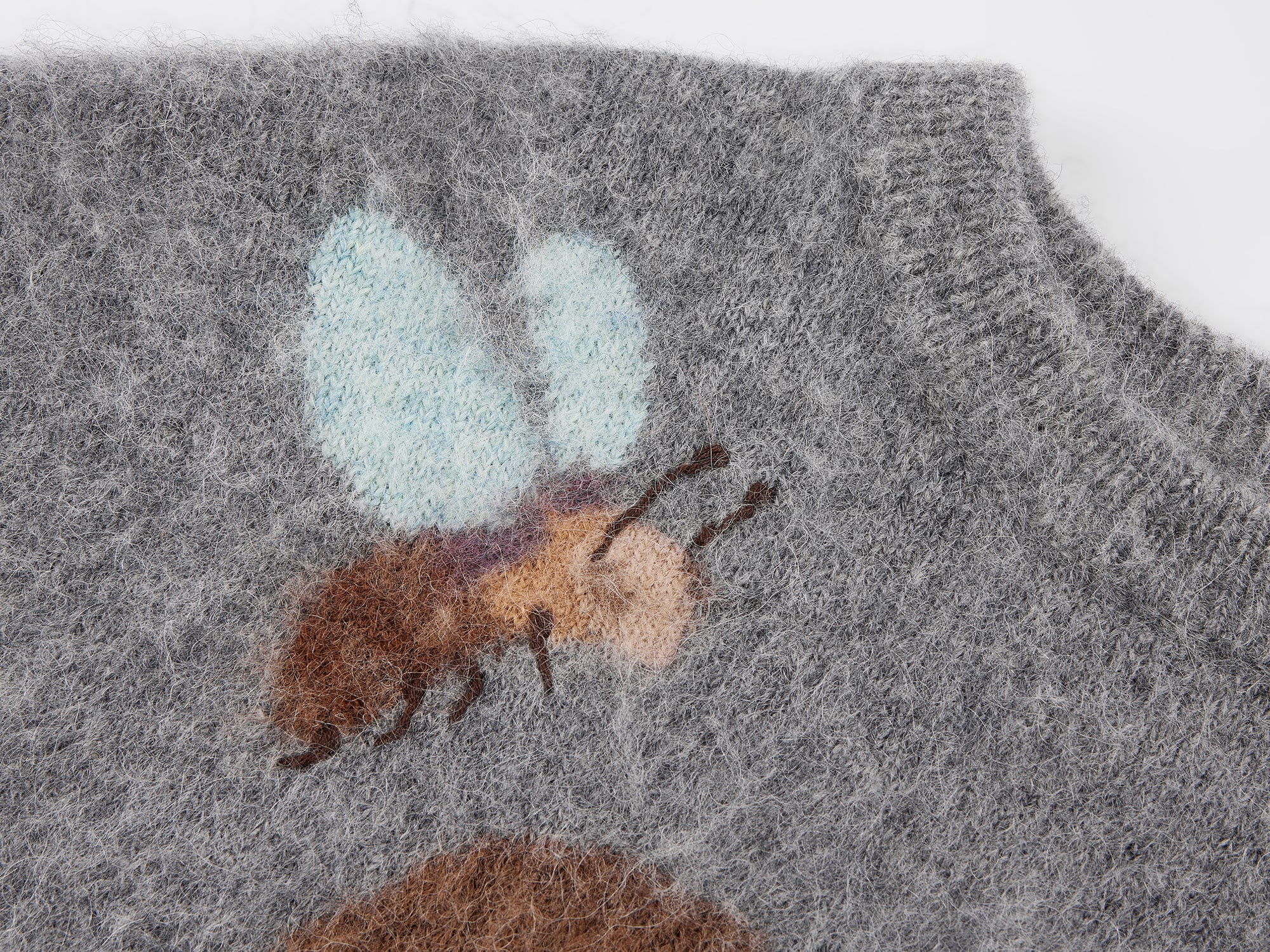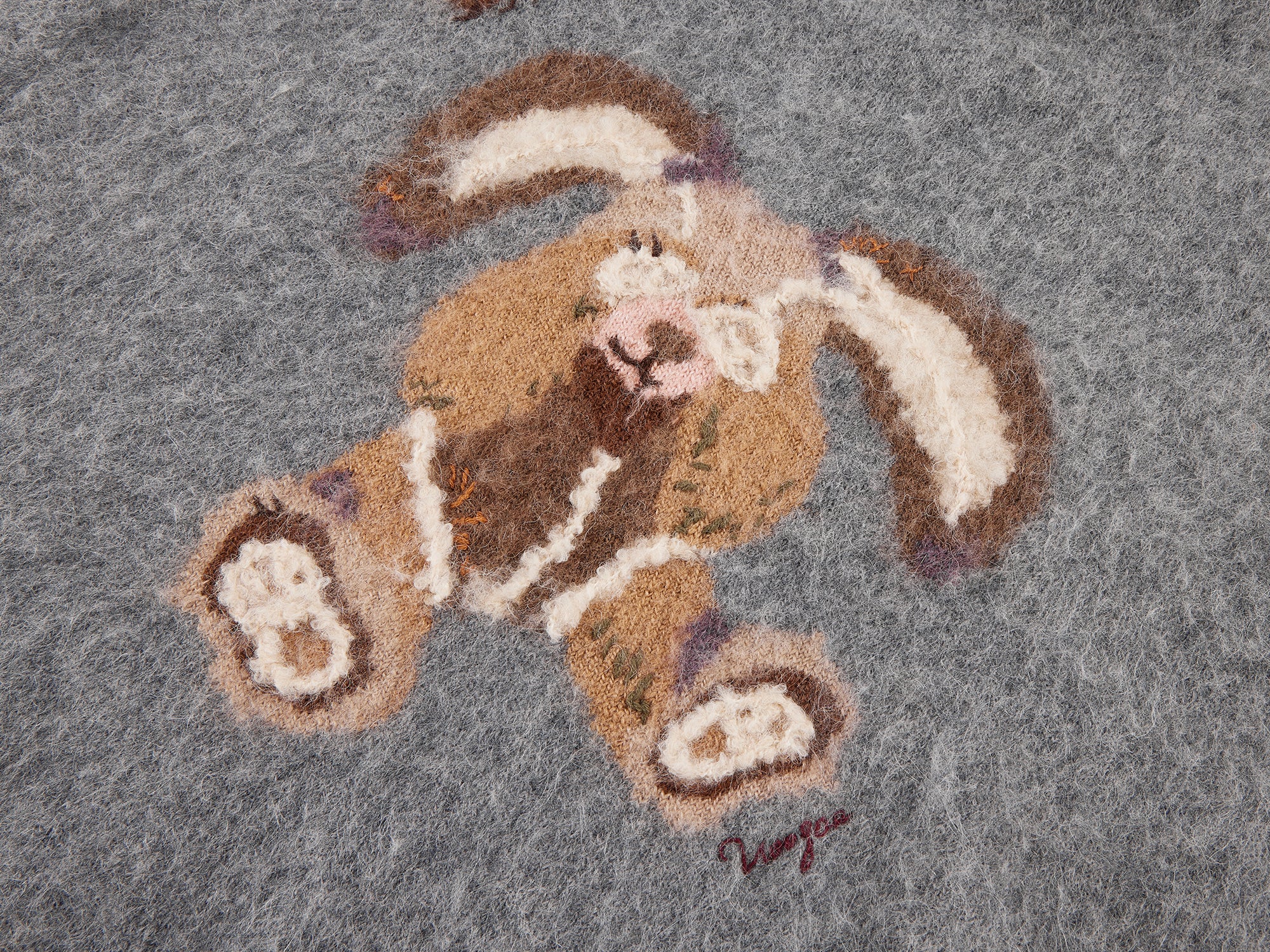 Features a playful elf bunny and bee motif covering its eyes. Knitted with mixed-texture yarns for a unique handfeel that delivers warmth and a lighthearted vibe.