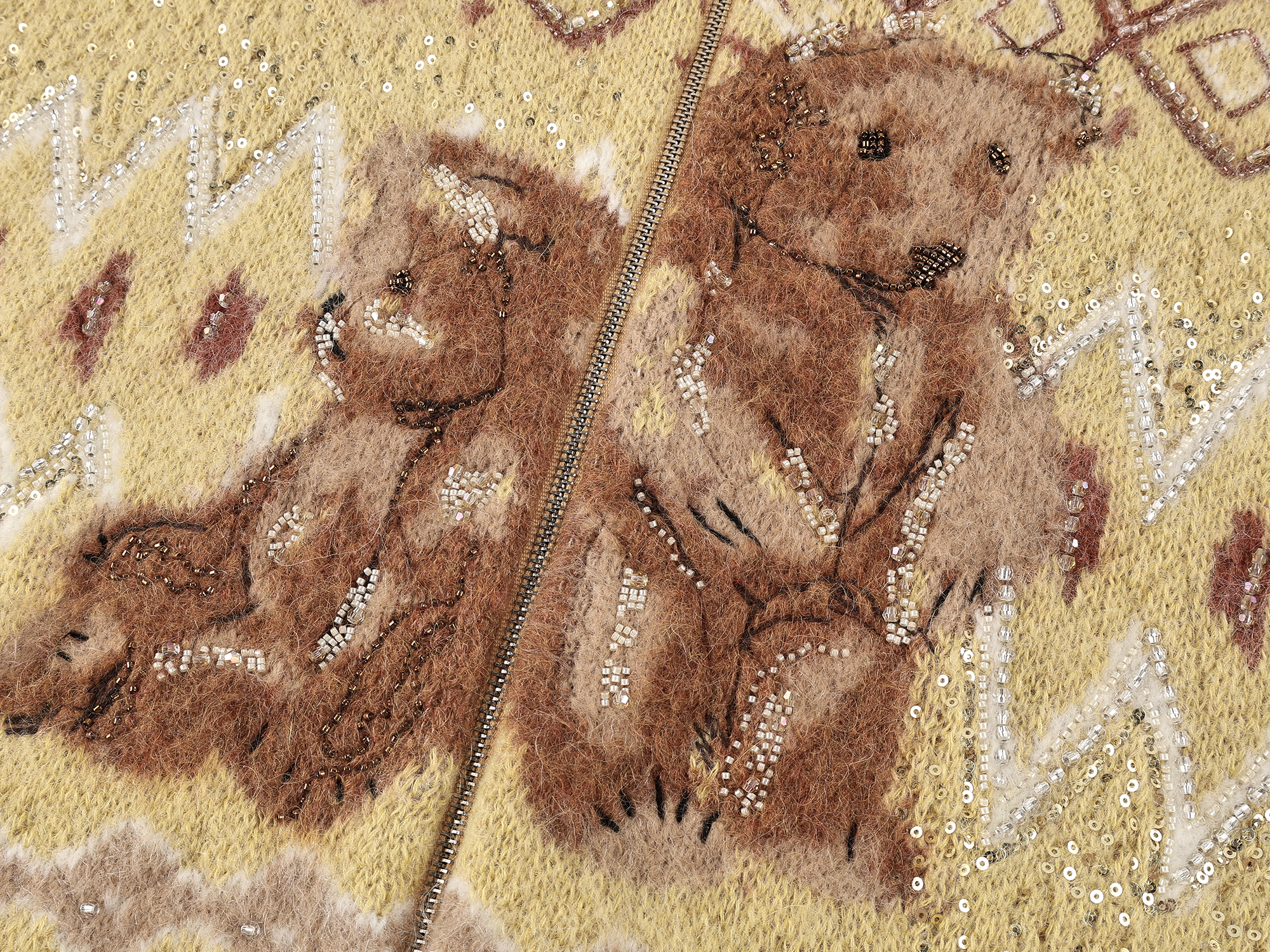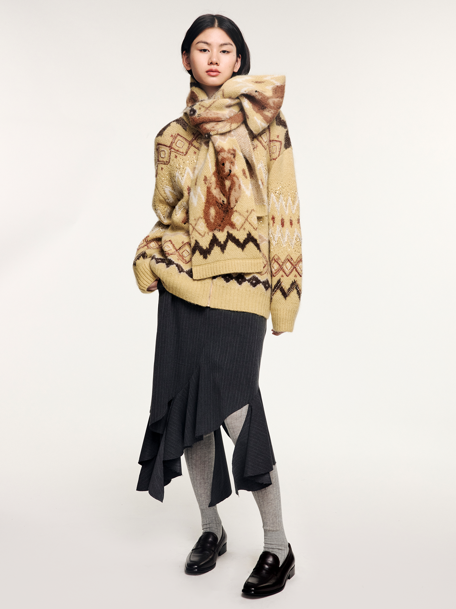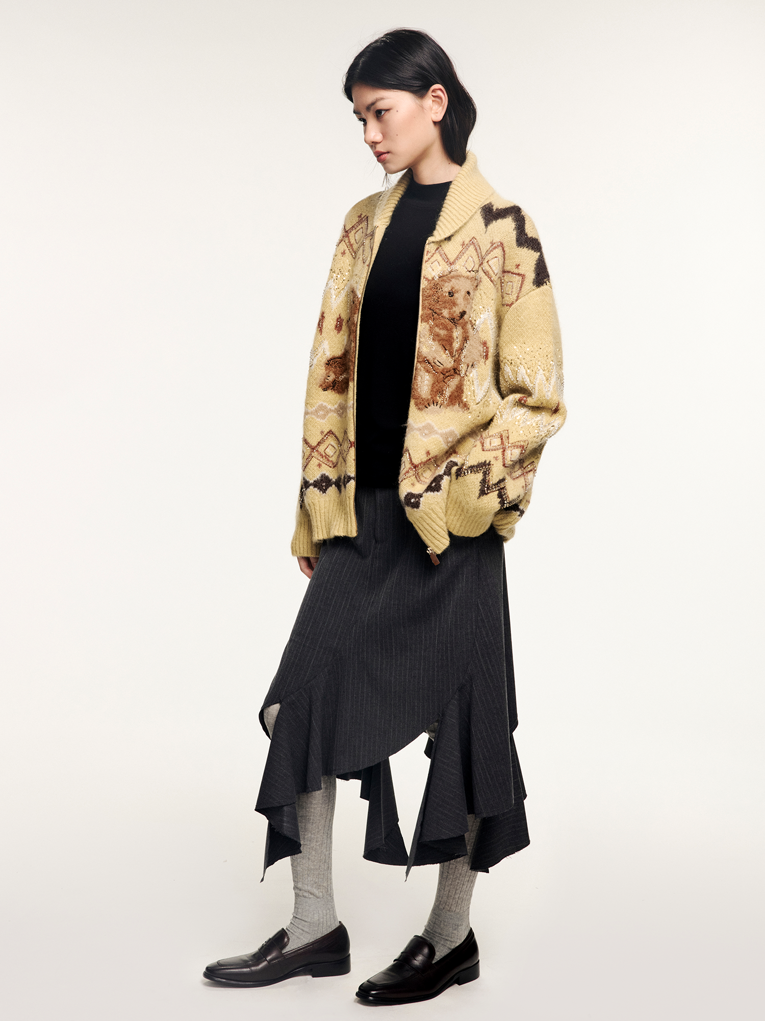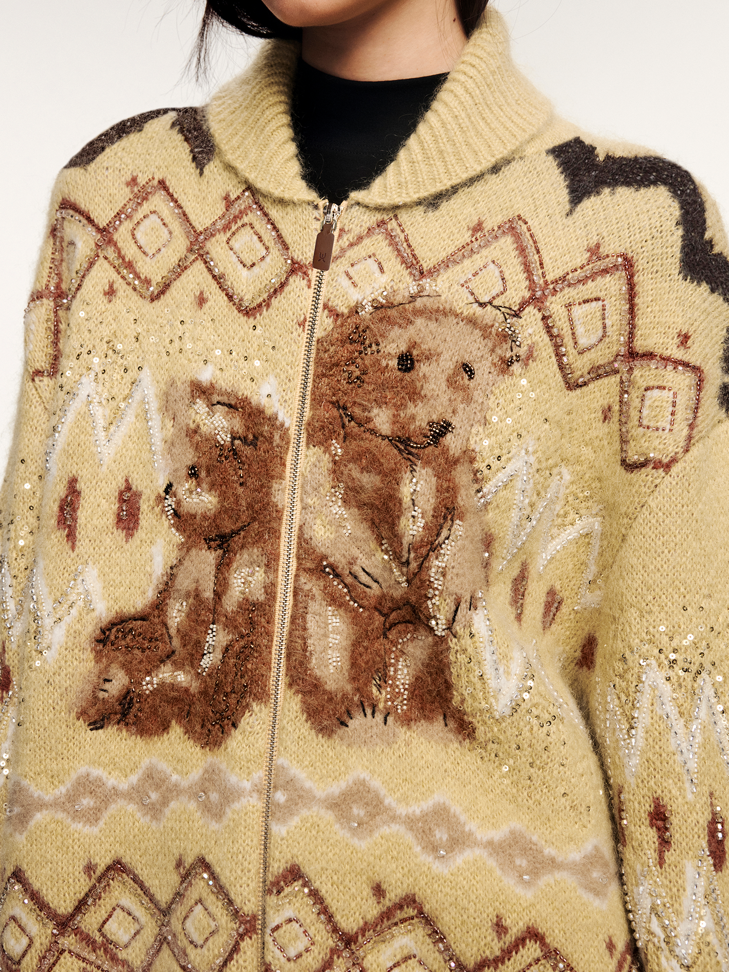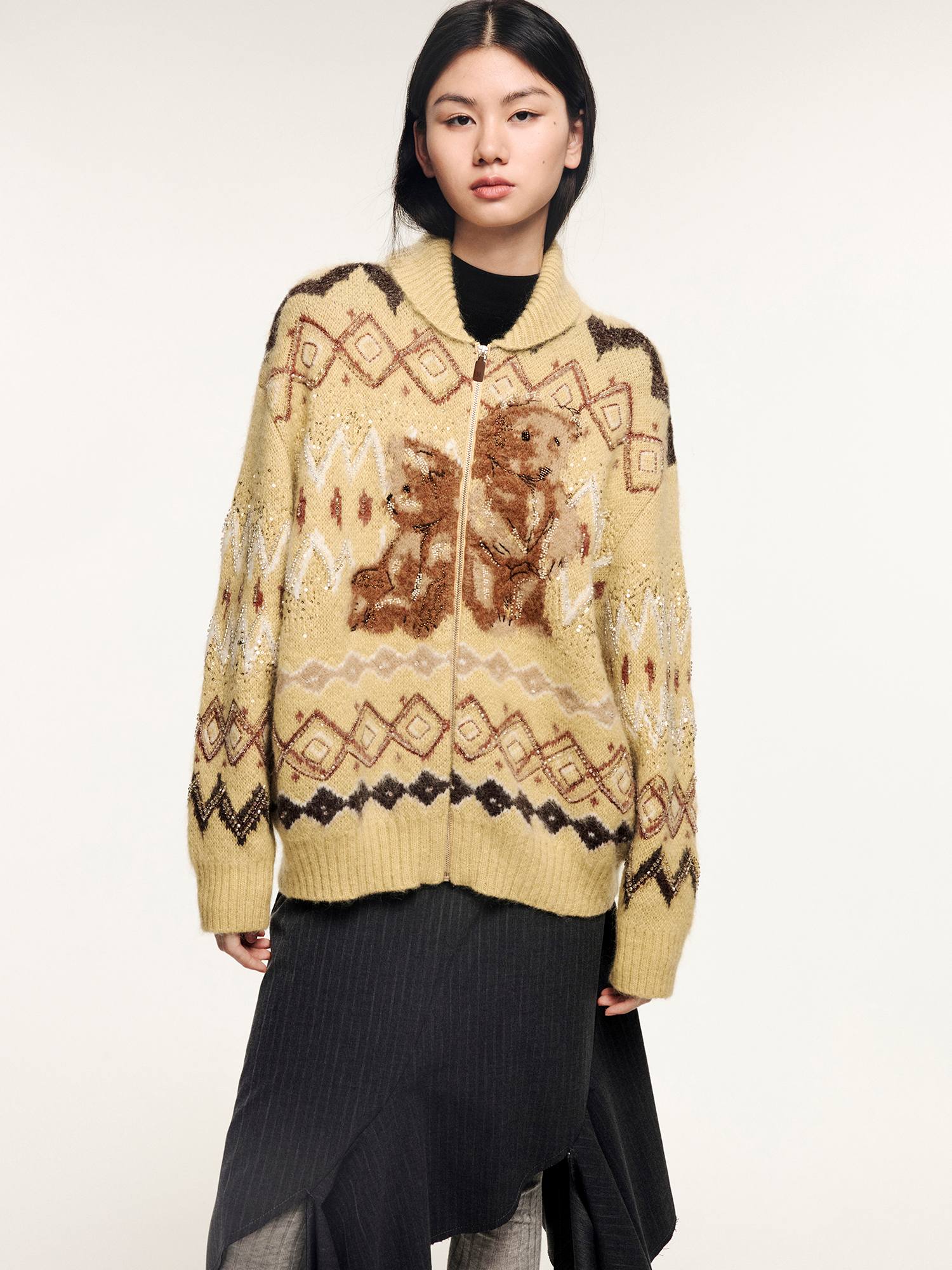A vintage sled-neck cardigan in classic Fair Isle pattern, decorated with back-to-back sad bear motifs for a comforting touch.