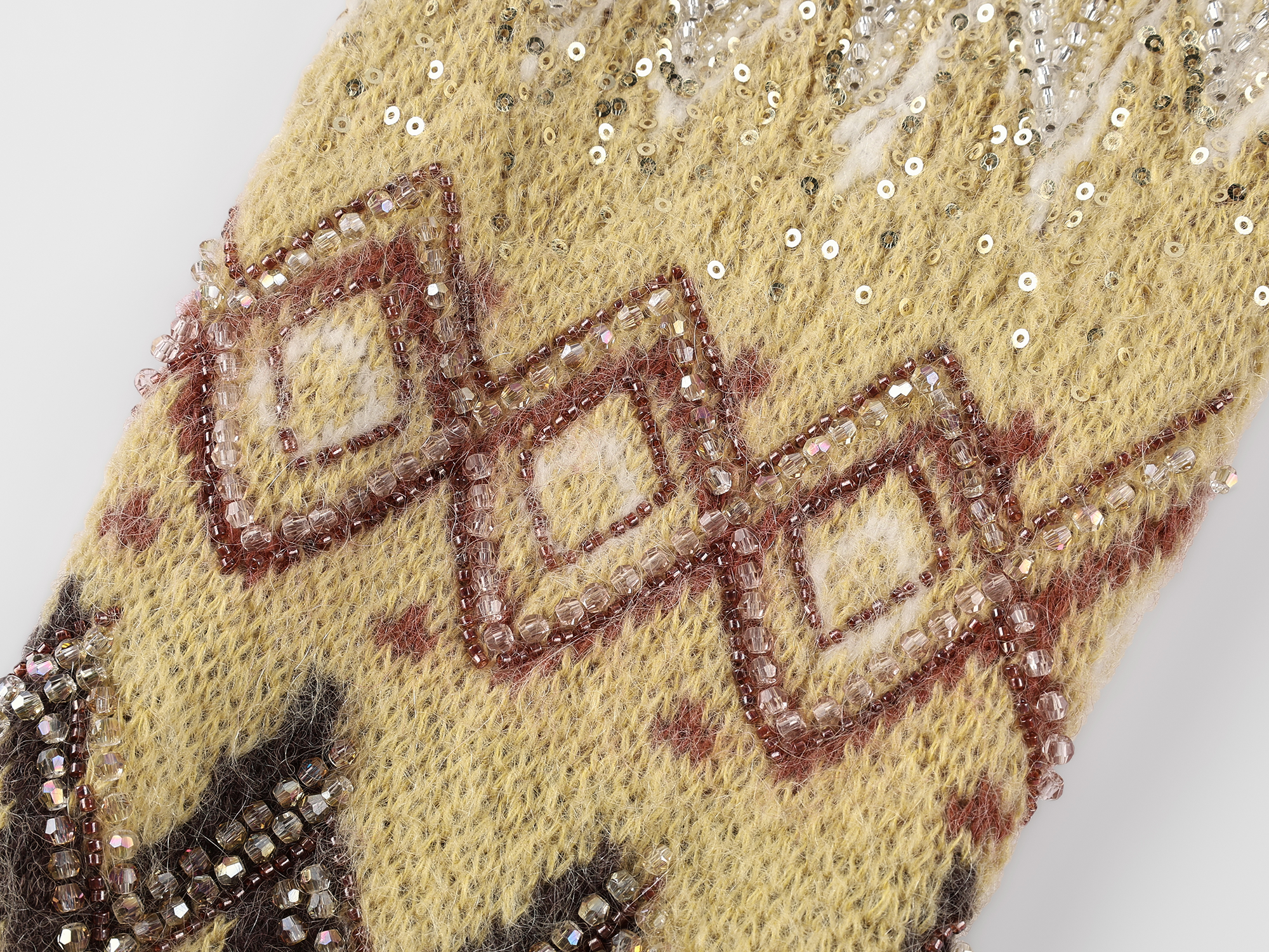 The body is decorated with elaborate bead embroidery for a refined and luxurious touch, paired with vintage ginger yellow to brighten winter styling.Fabric: