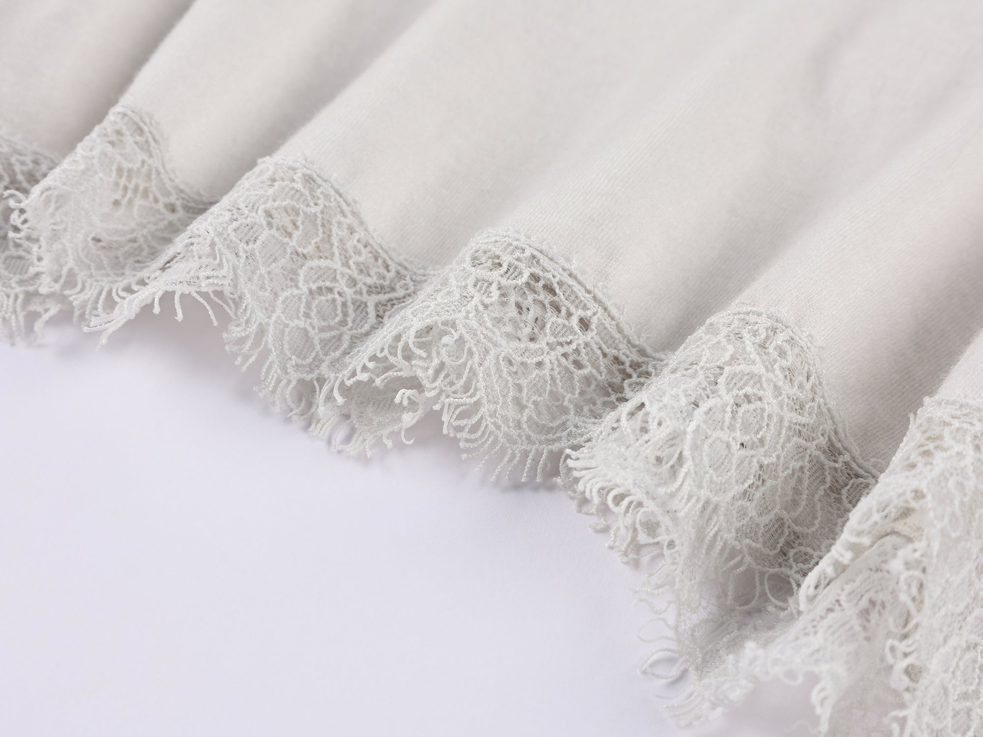 A long-sleeve t-shirt combined with an irregular lace-hem skirt, crafted in lightweight cotton-linen blend fleece, offering a relaxed fit with natural drape and ease of movement.Fabric: