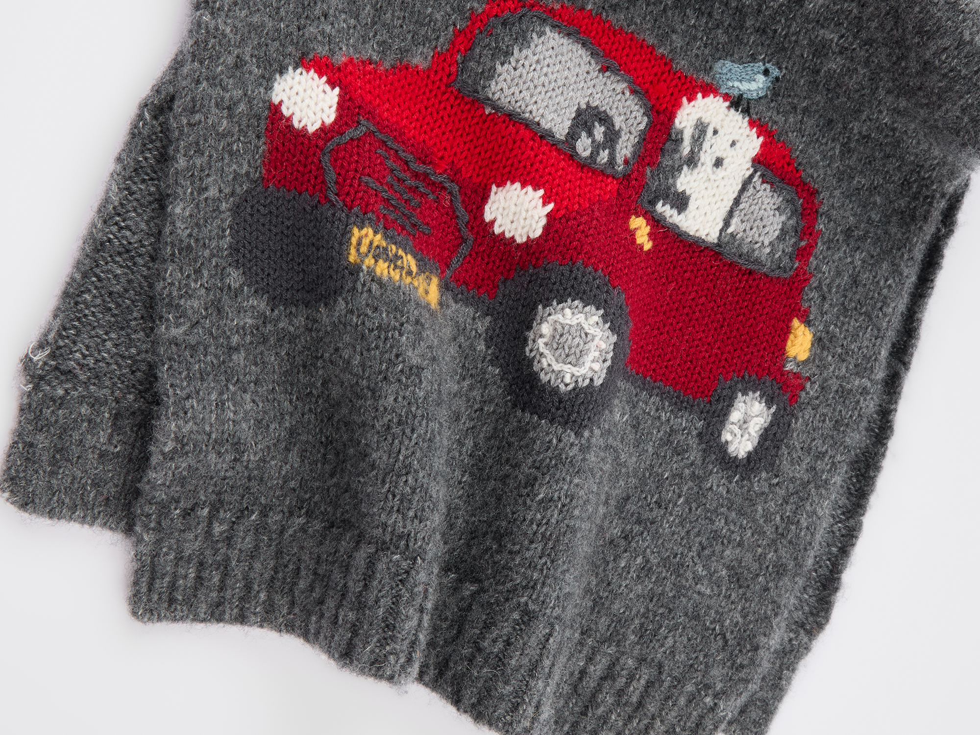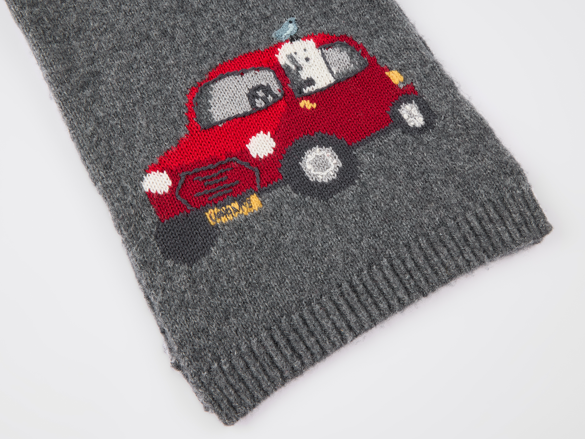 A playful road trip with a puppy is captured in crochet-style knit embroidery on the hat bringing joy to life's little scenes.