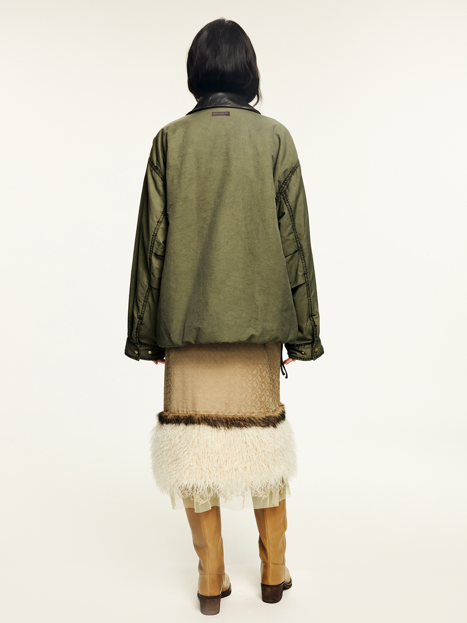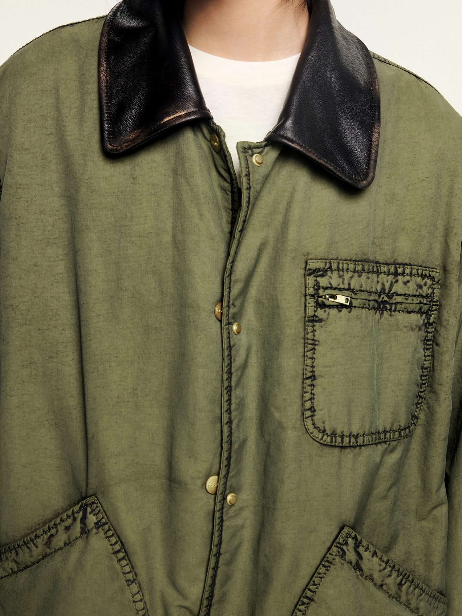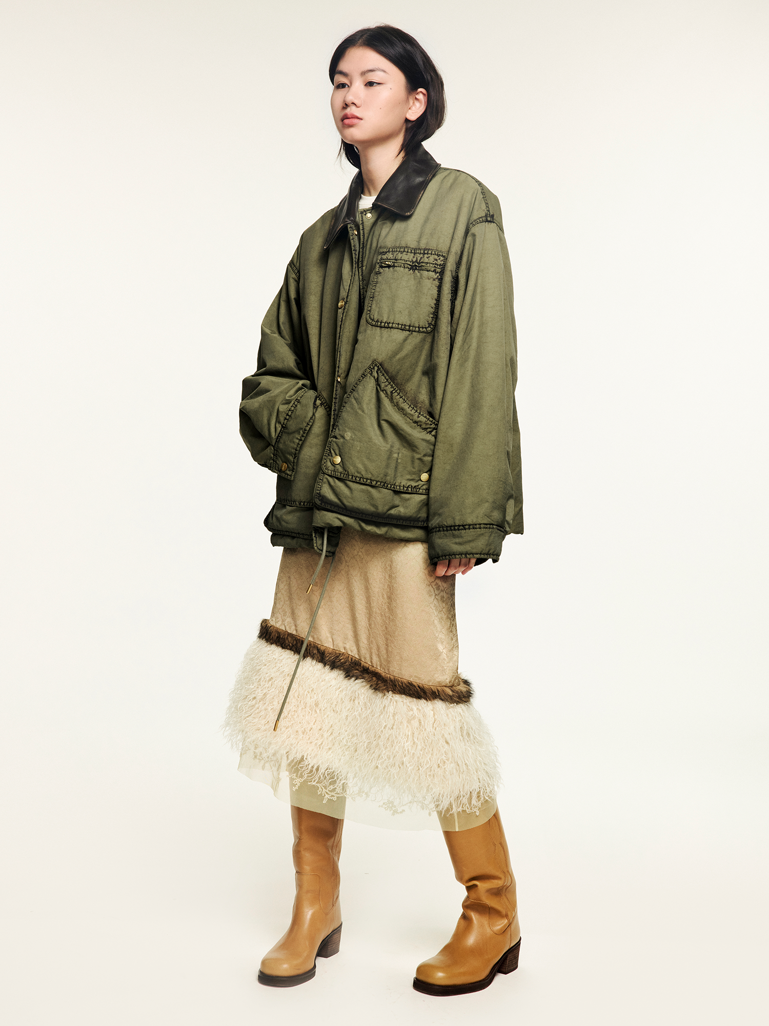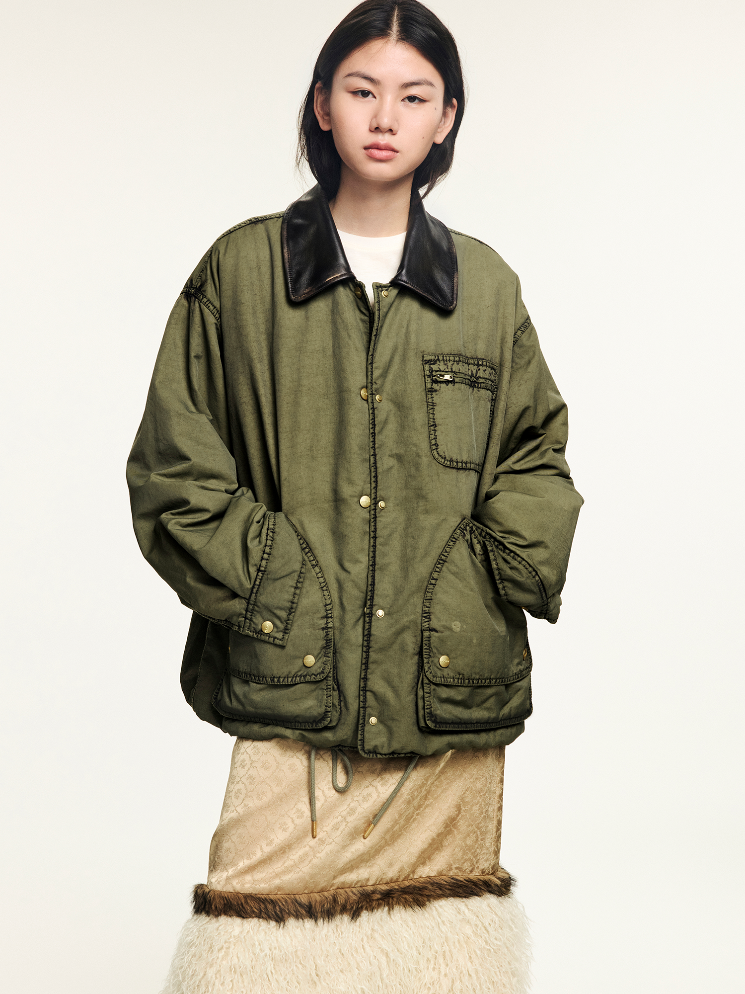 A hunting jacket in O-shape silhouette with military green washed effect, adding a vintage fantasy touch.
