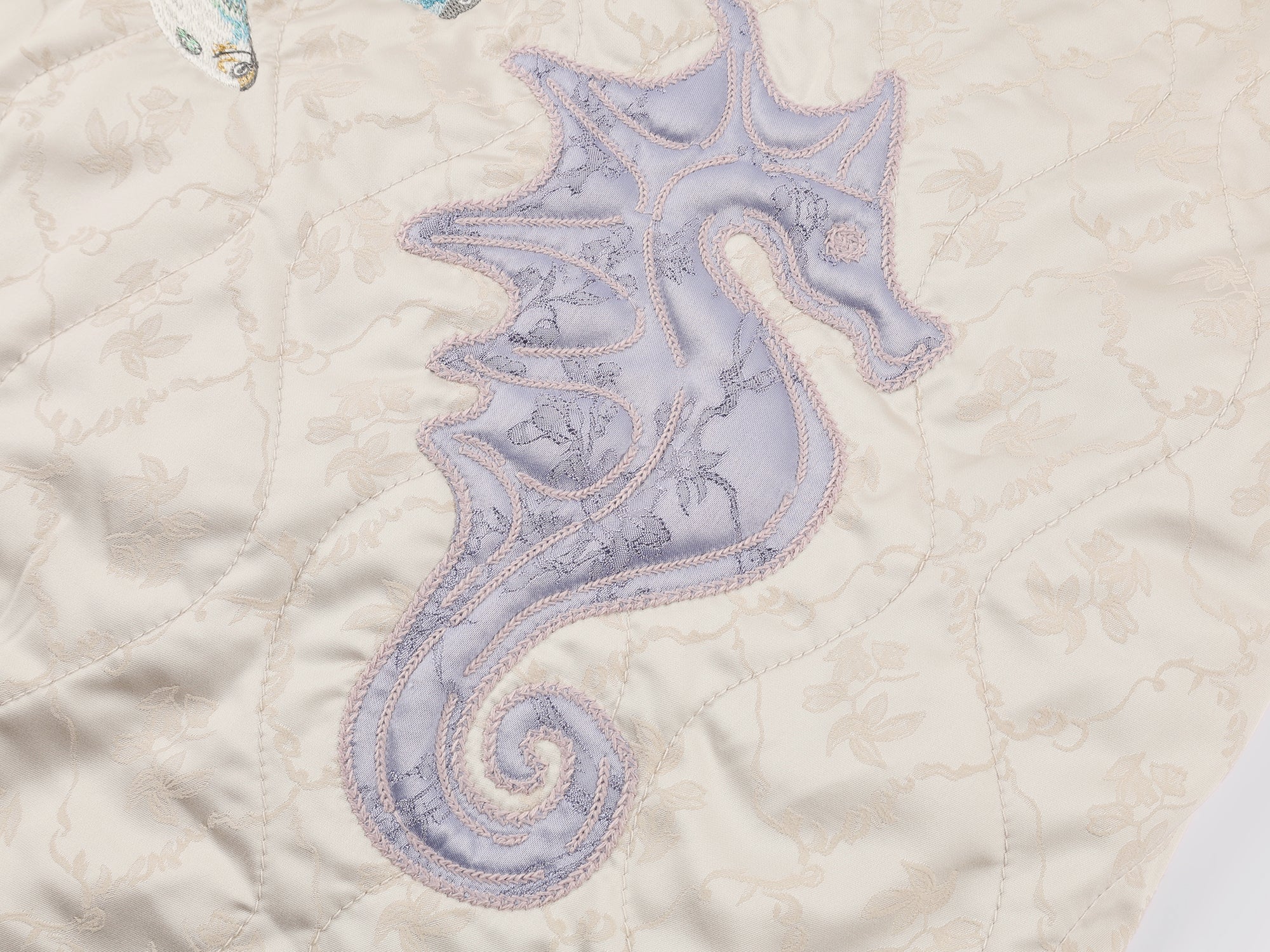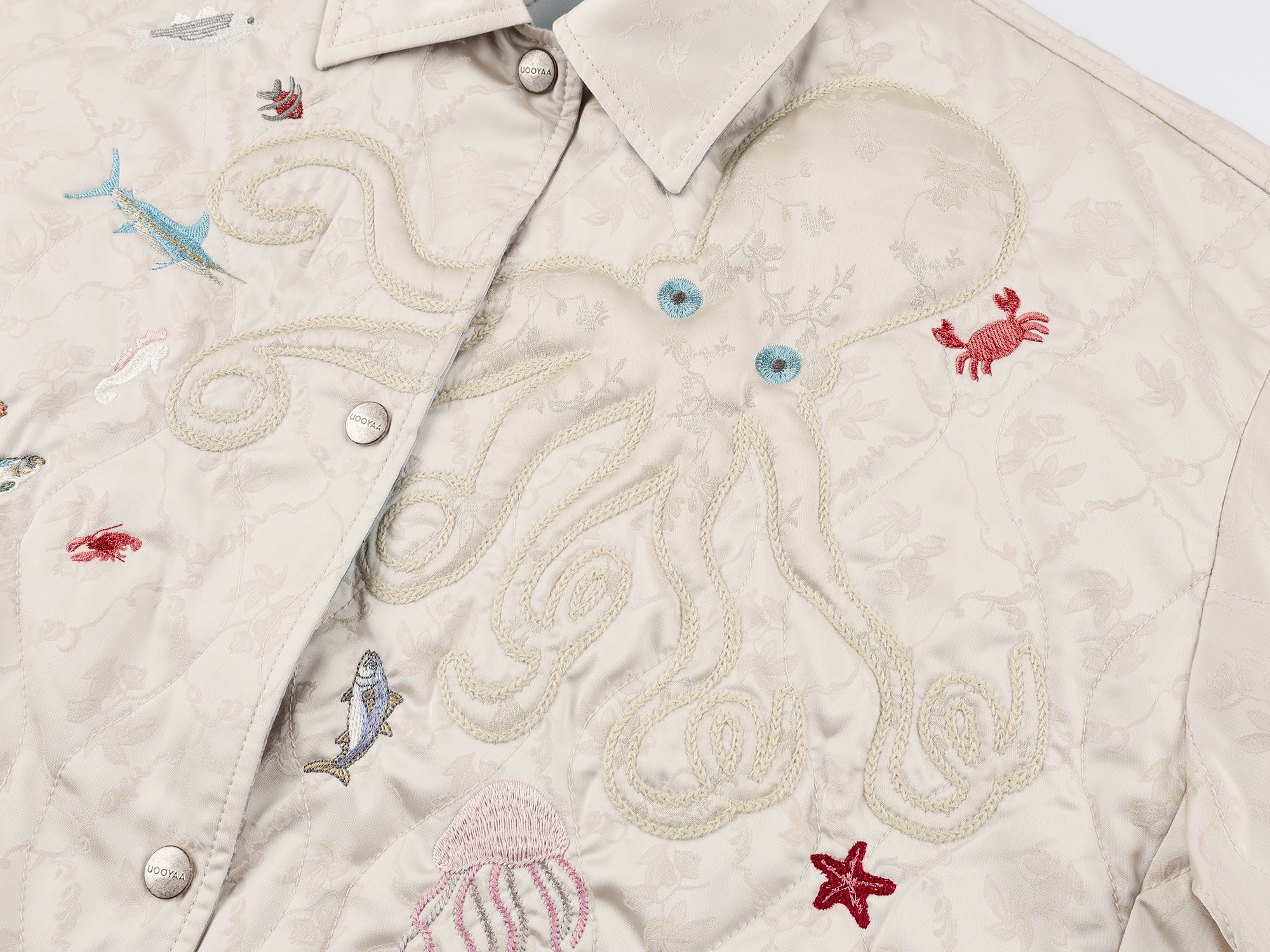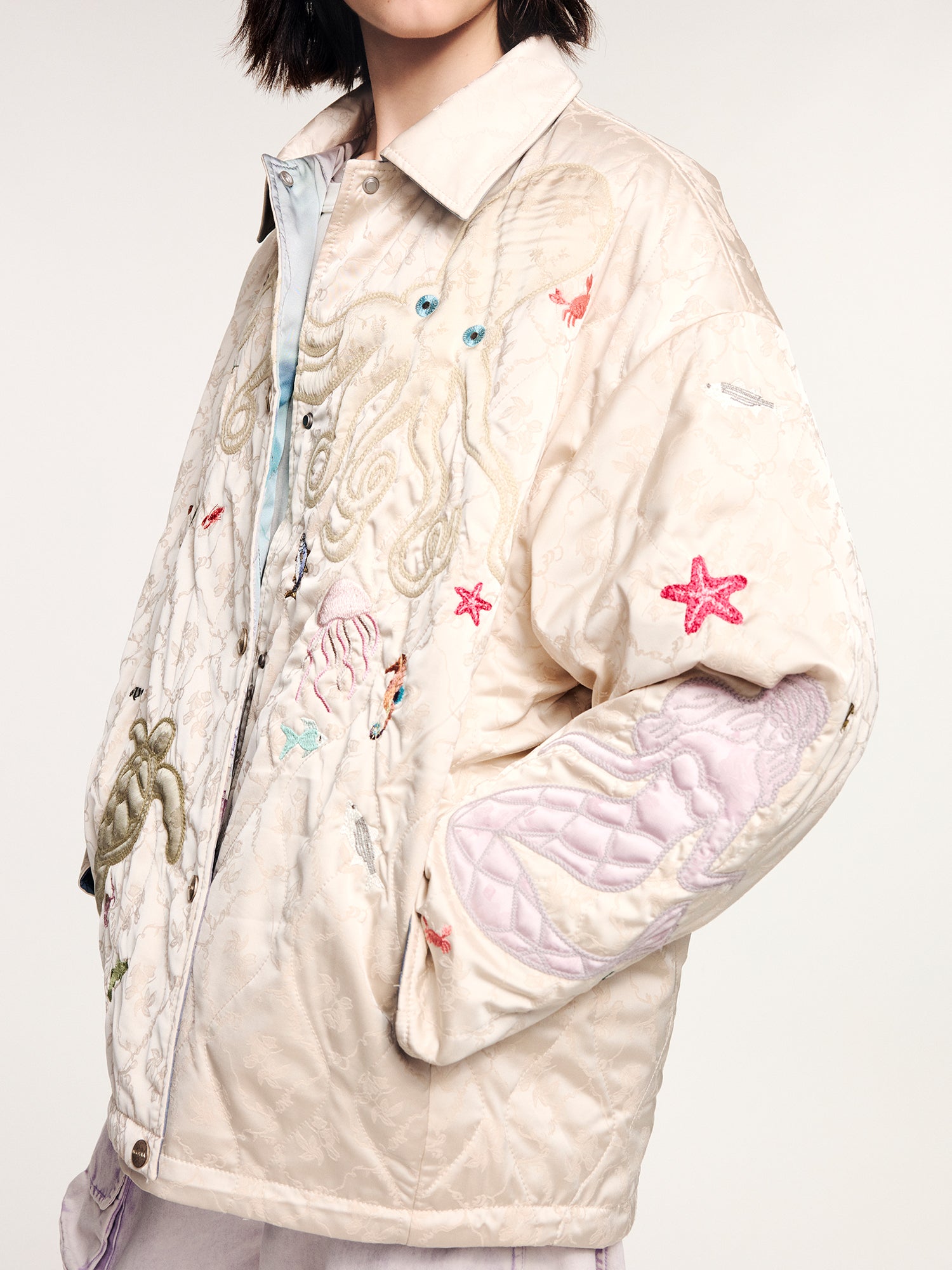 Reversible padded overshirt. Side A: Classical jacquard with complex appliqué. Side B: Surreal undersea satin print.