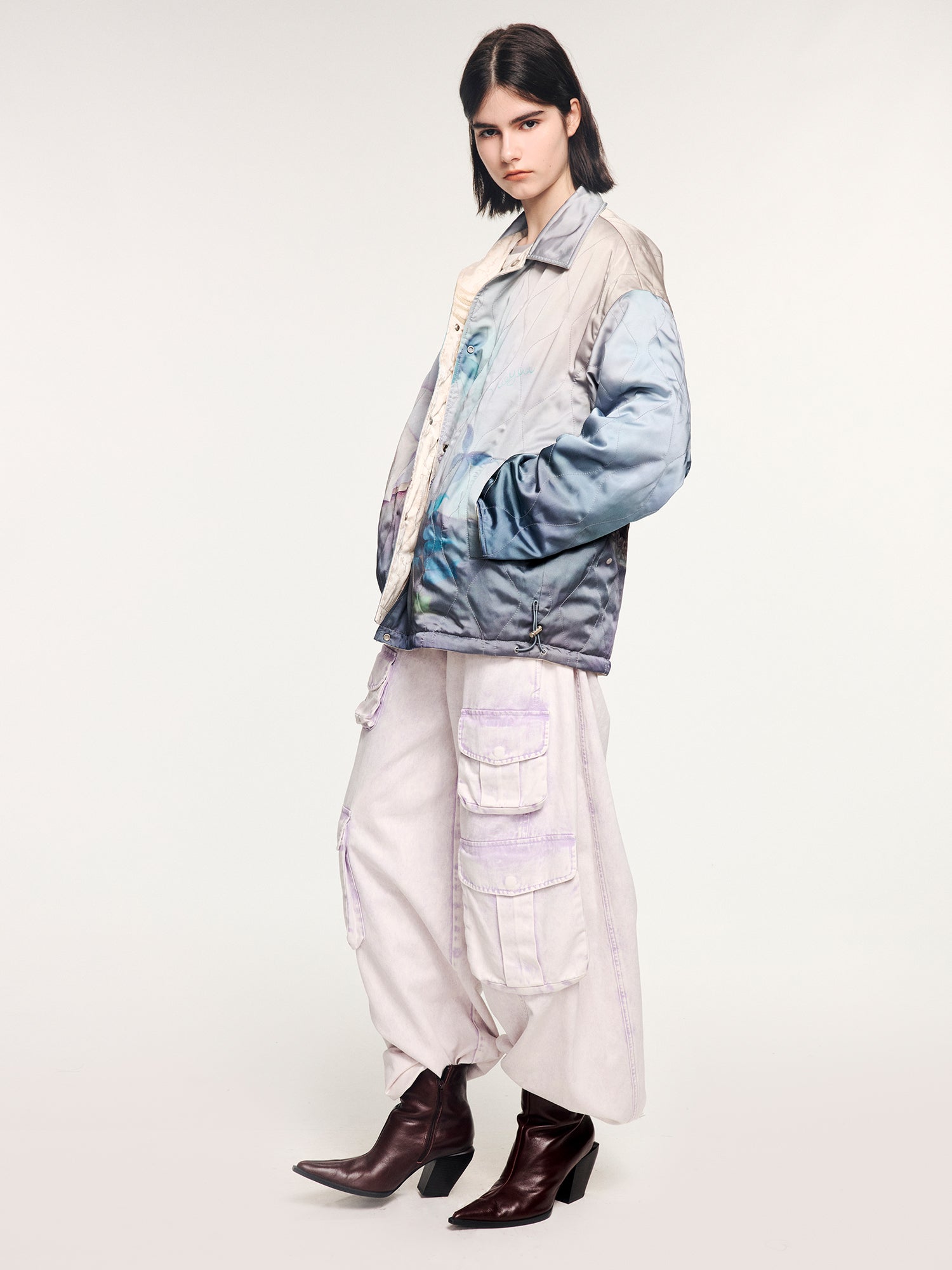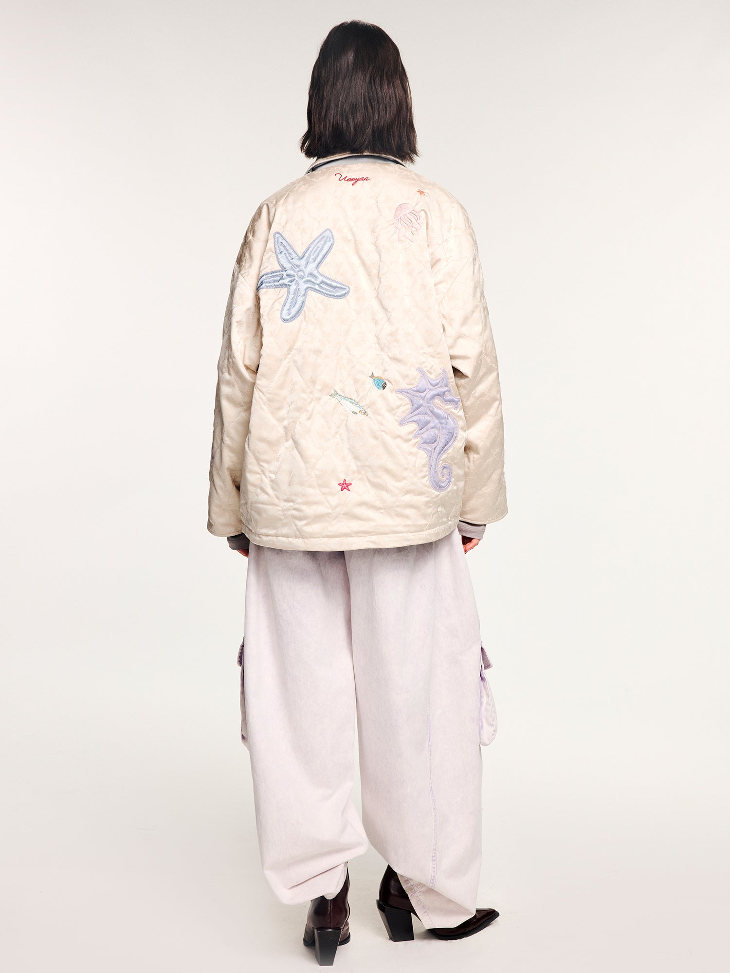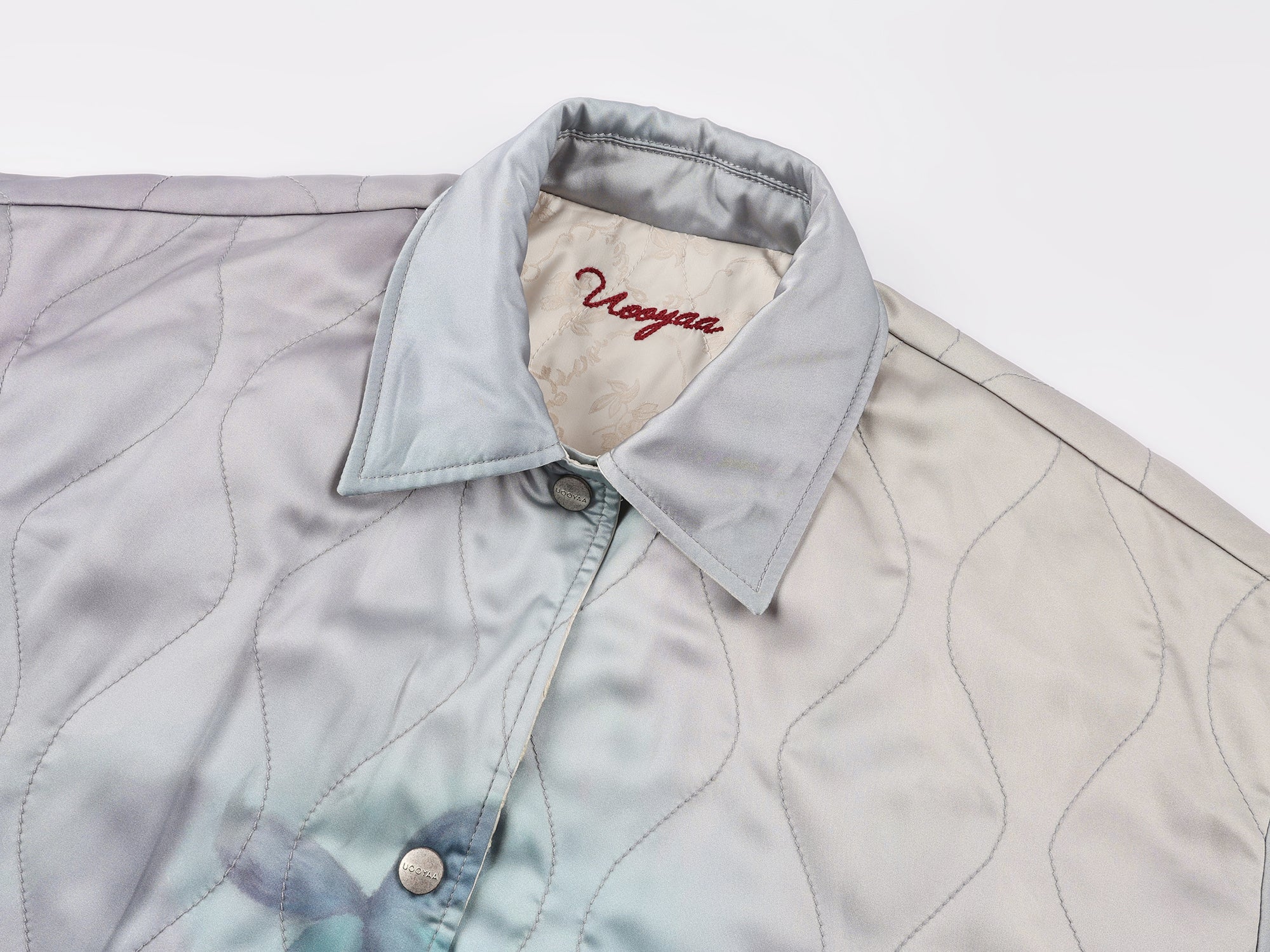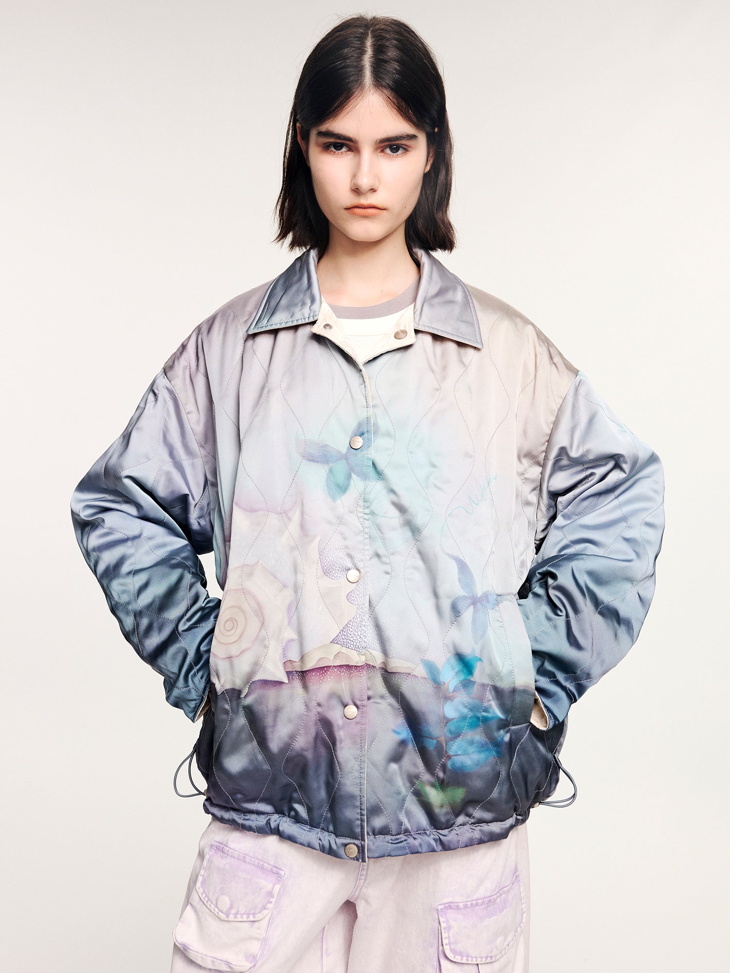 Reversible padded overshirt. Side A: Classical jacquard with complex appliqué. Side B: Surreal undersea satin print.