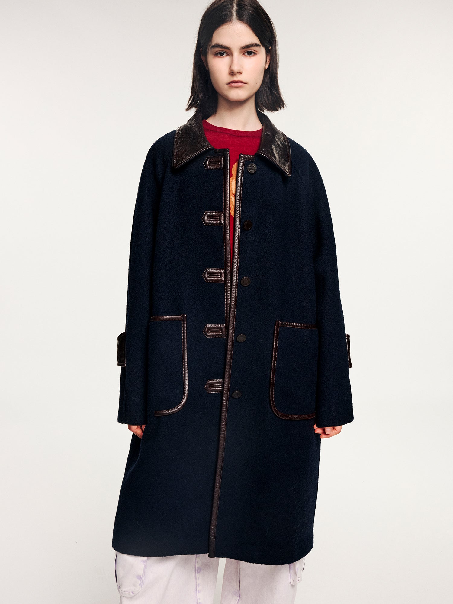 A classic Balmacaan coat crafted from textured wool-blend fabric, finished with a contrast sheepskin leather collar and trims¡ªmerging vintage charm with a refined, luxe feel.