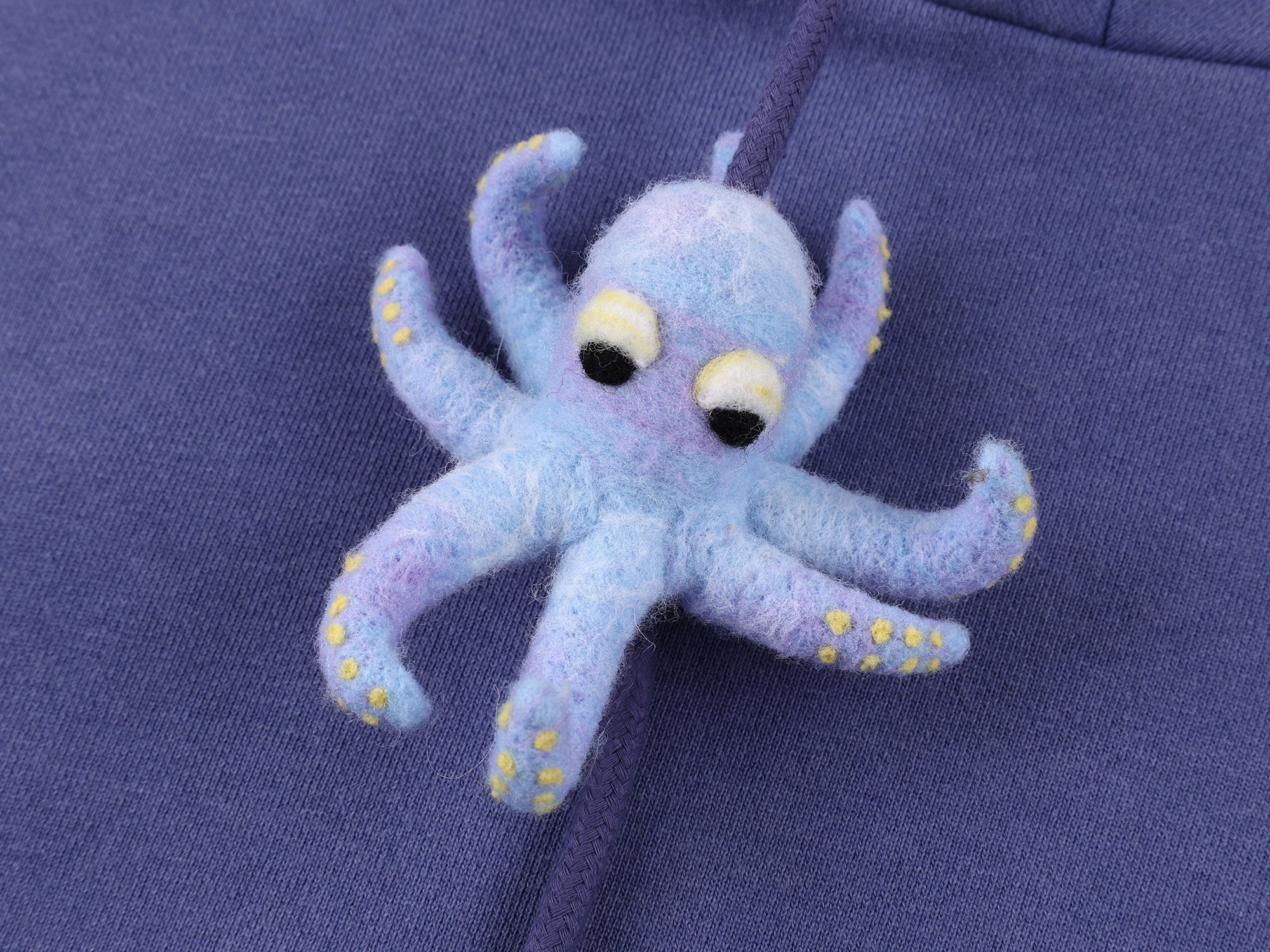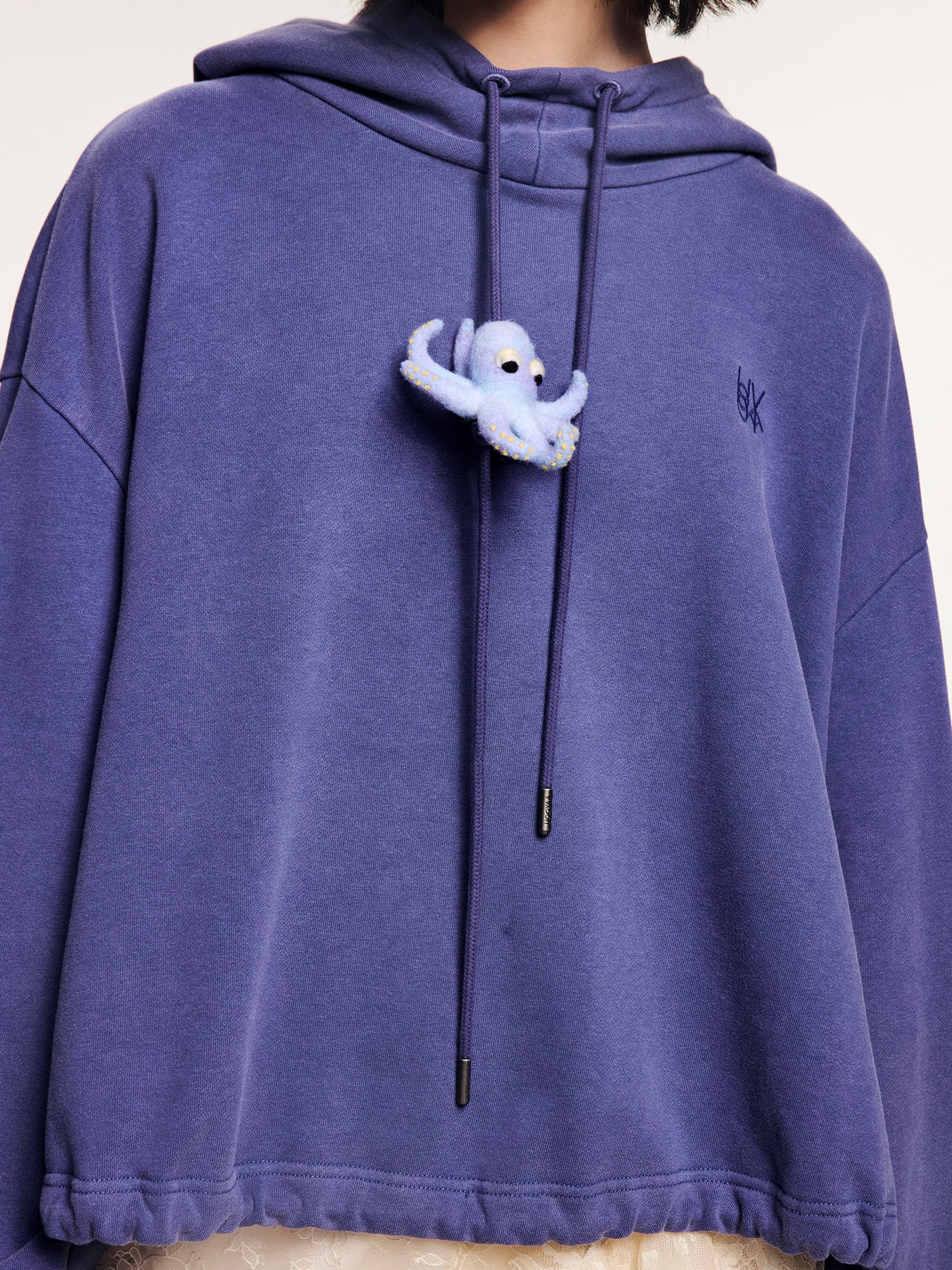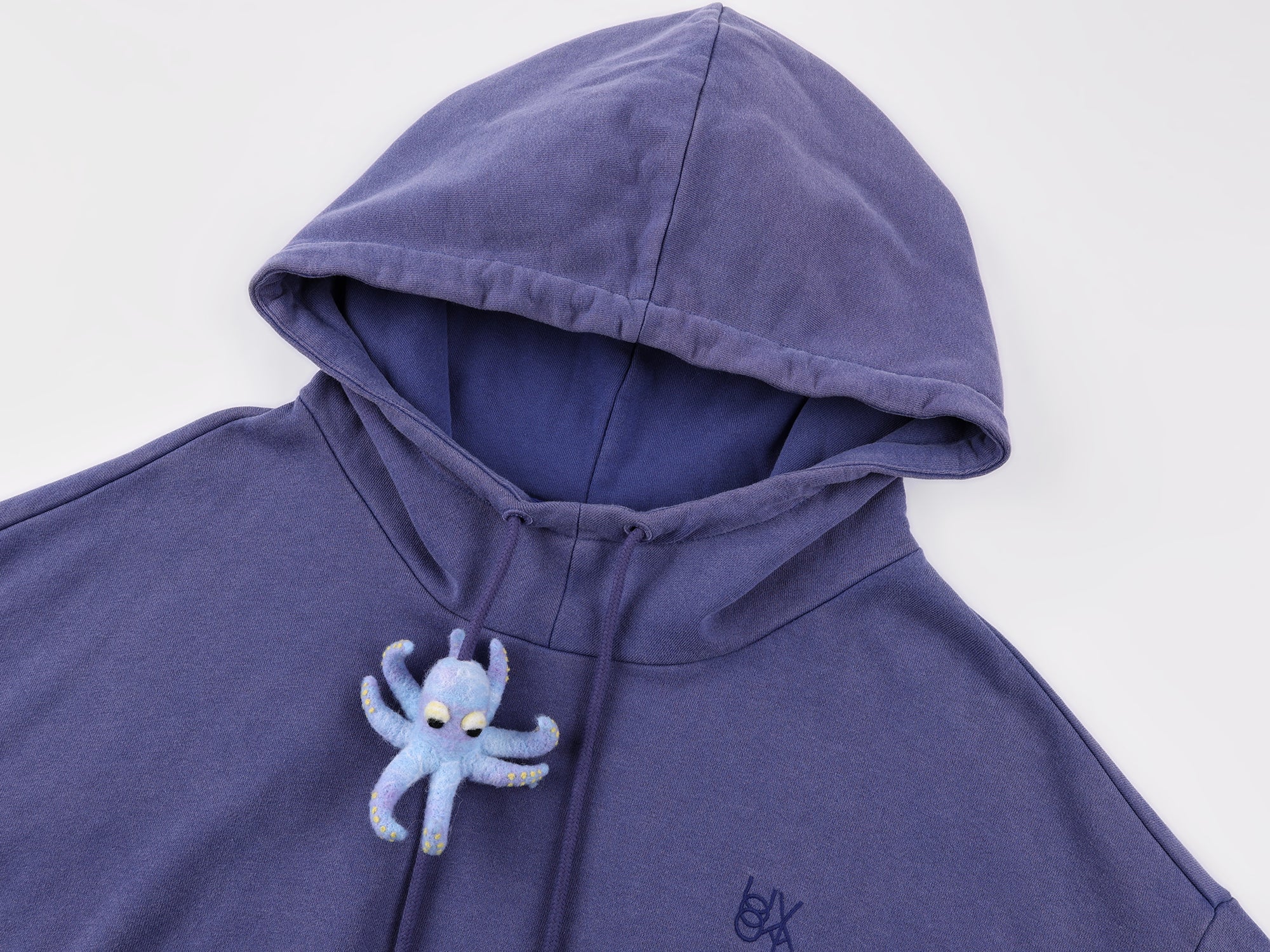 Purple washed hoodie features a cocoon silhouette, adorned with a handcrafted wool felt undersea octopus pendant in blue-purple tones for a whimsical, refined look.