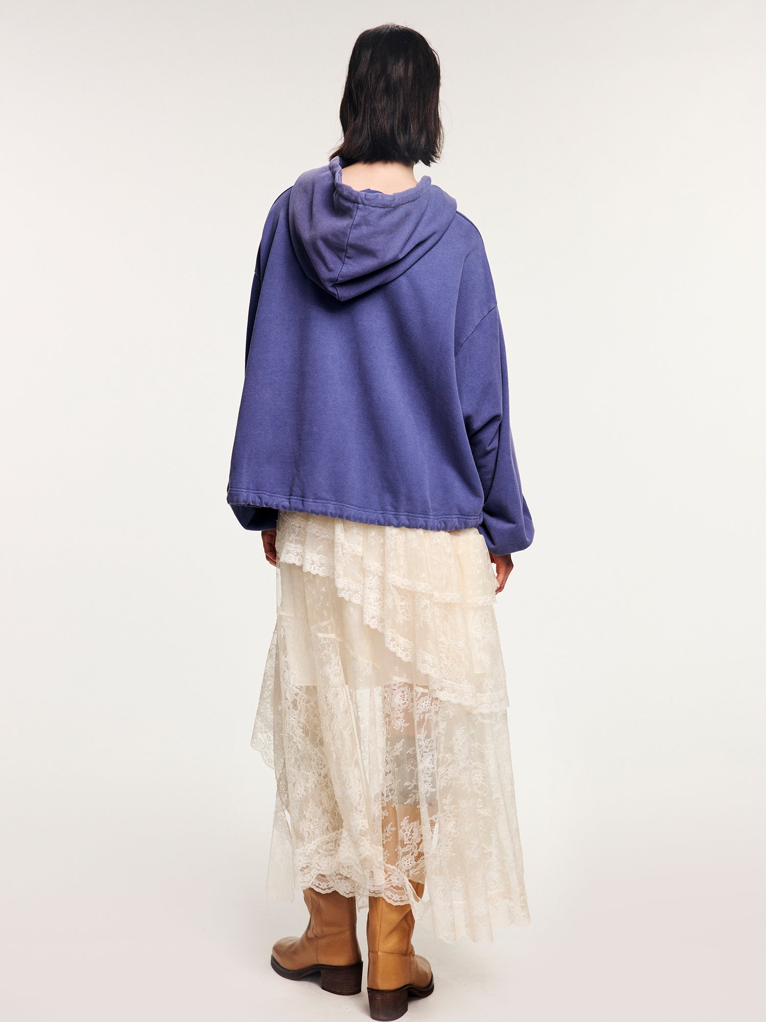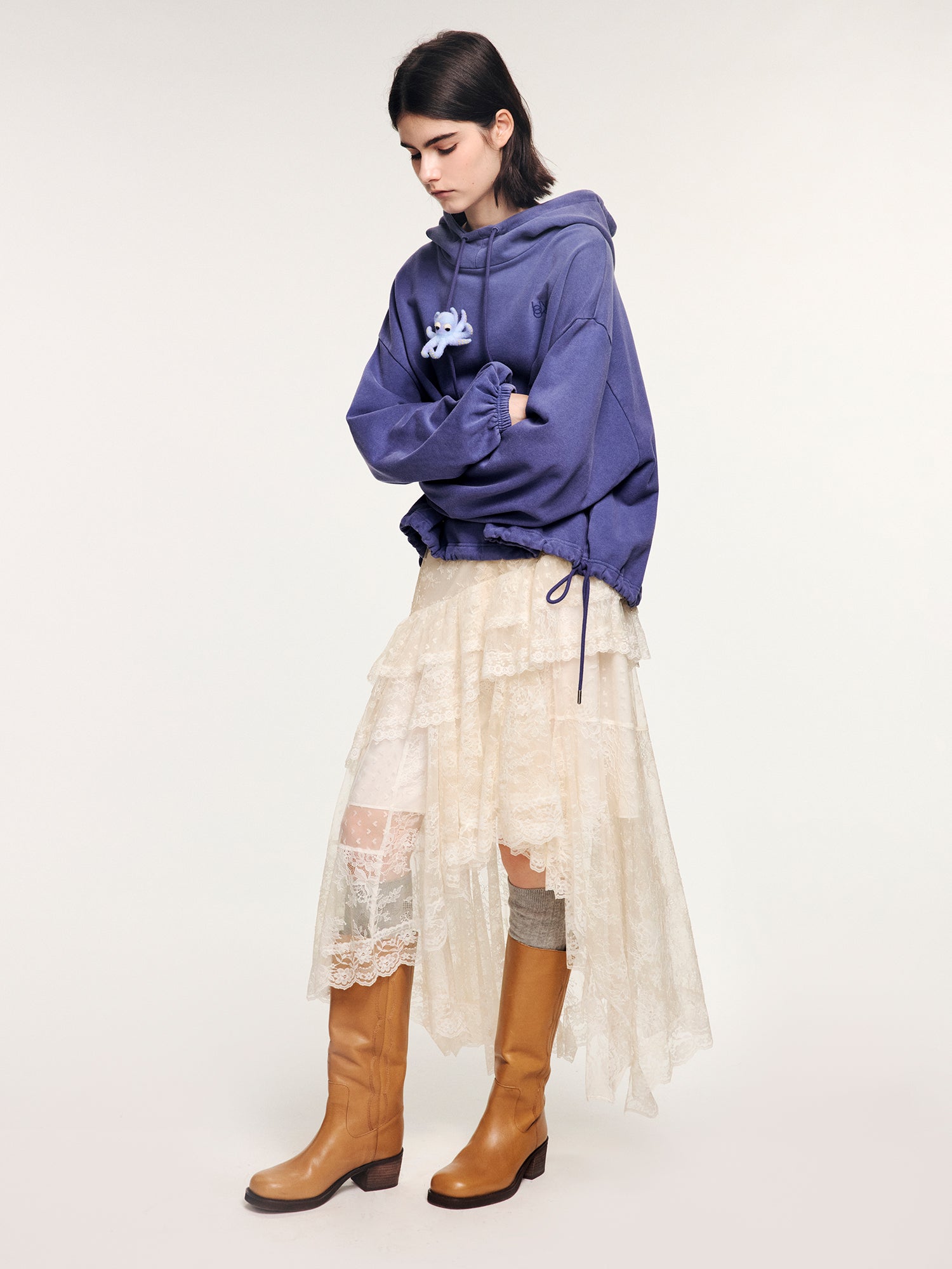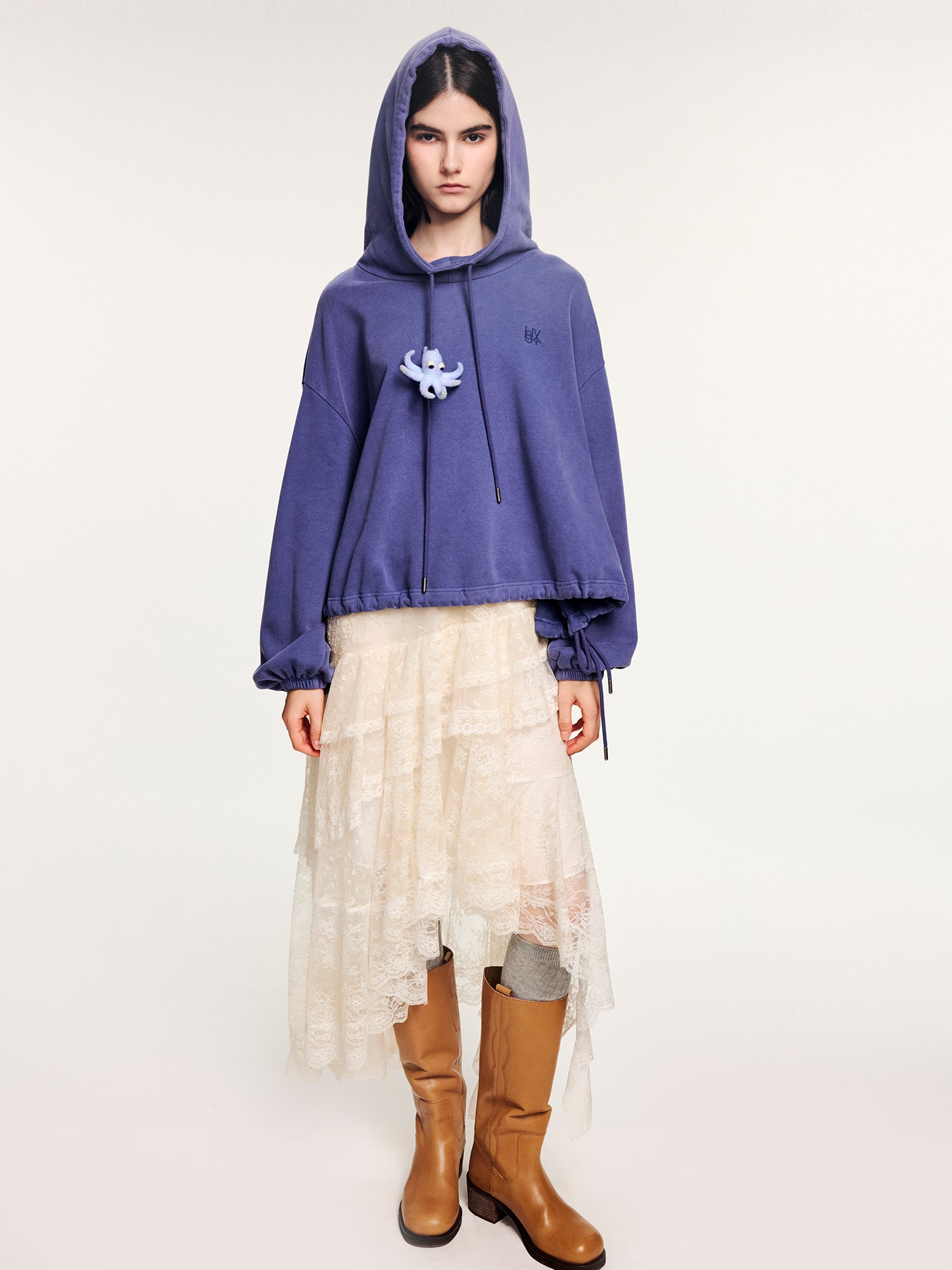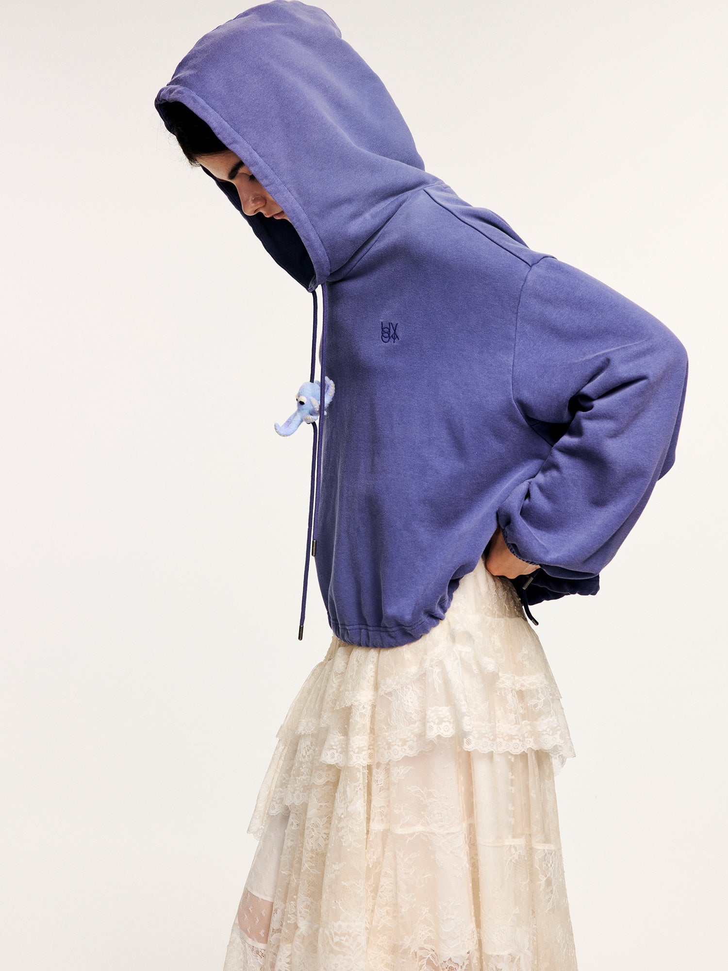 Purple washed hoodie features a cocoon silhouette, adorned with a handcrafted wool felt undersea octopus pendant in blue-purple tones for a whimsical, refined look.