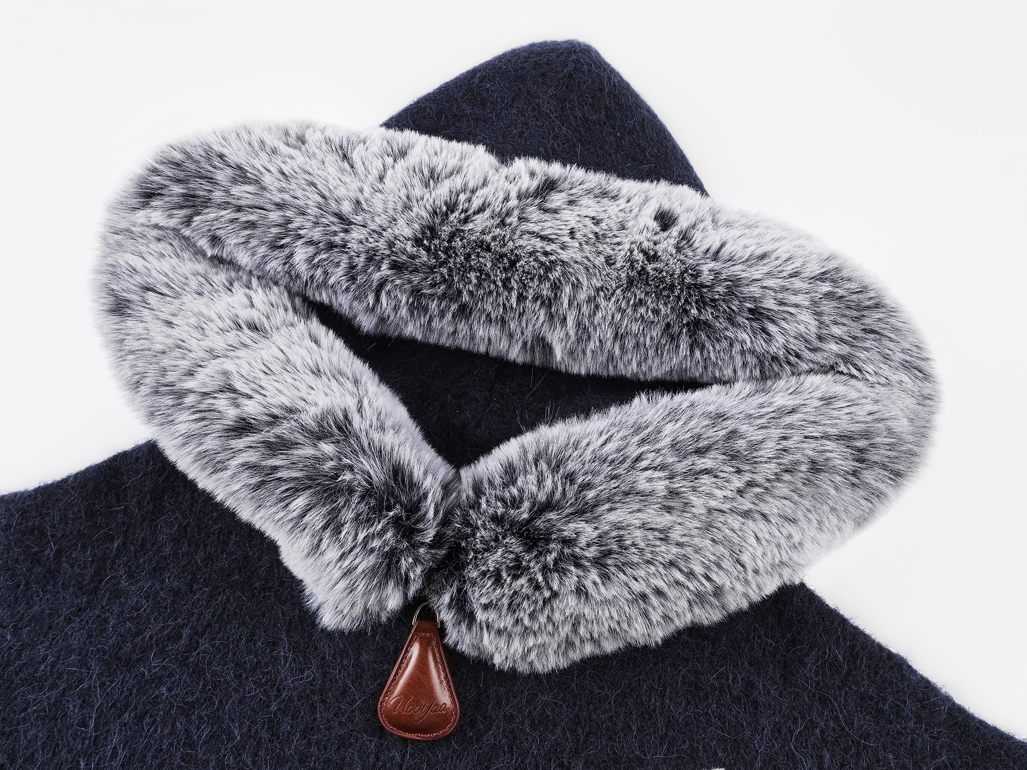 Fabric: 48.0% alpaca, 34.6% nylon, 15.6% acrylic, 1.8% spandex (contains trace other fibers)Fur collar: 100% polyester (excluding trims)