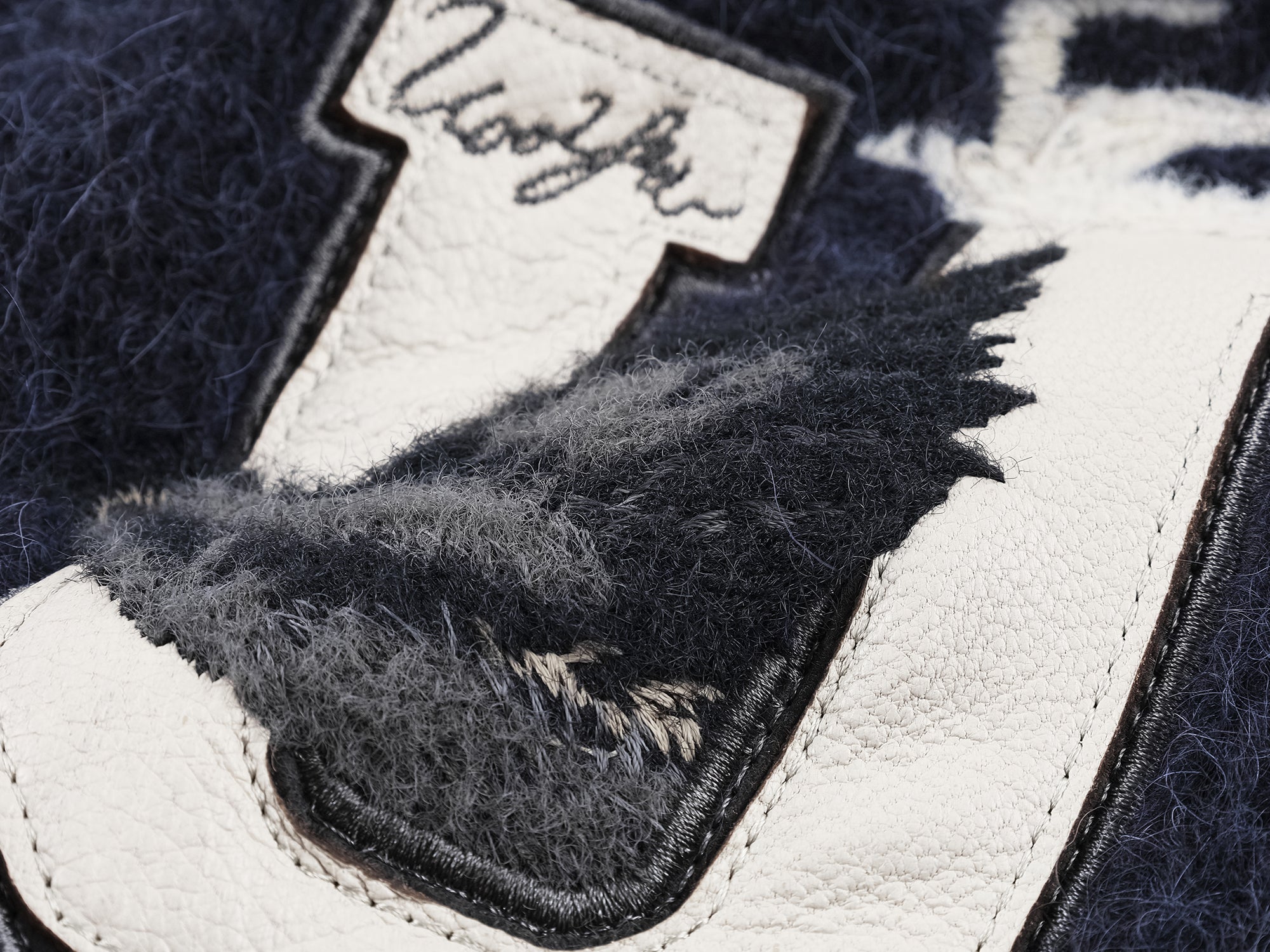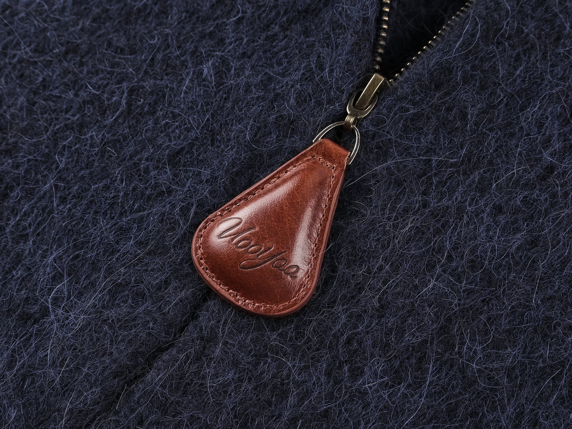Surreal bird graphics merge with a real leather logo, featuring a red leather teardrop pull for a refined yet whimsical finish.Fabric: