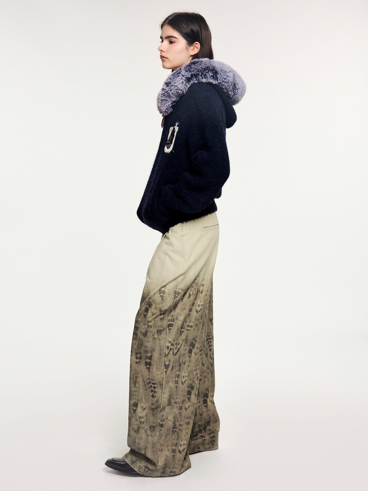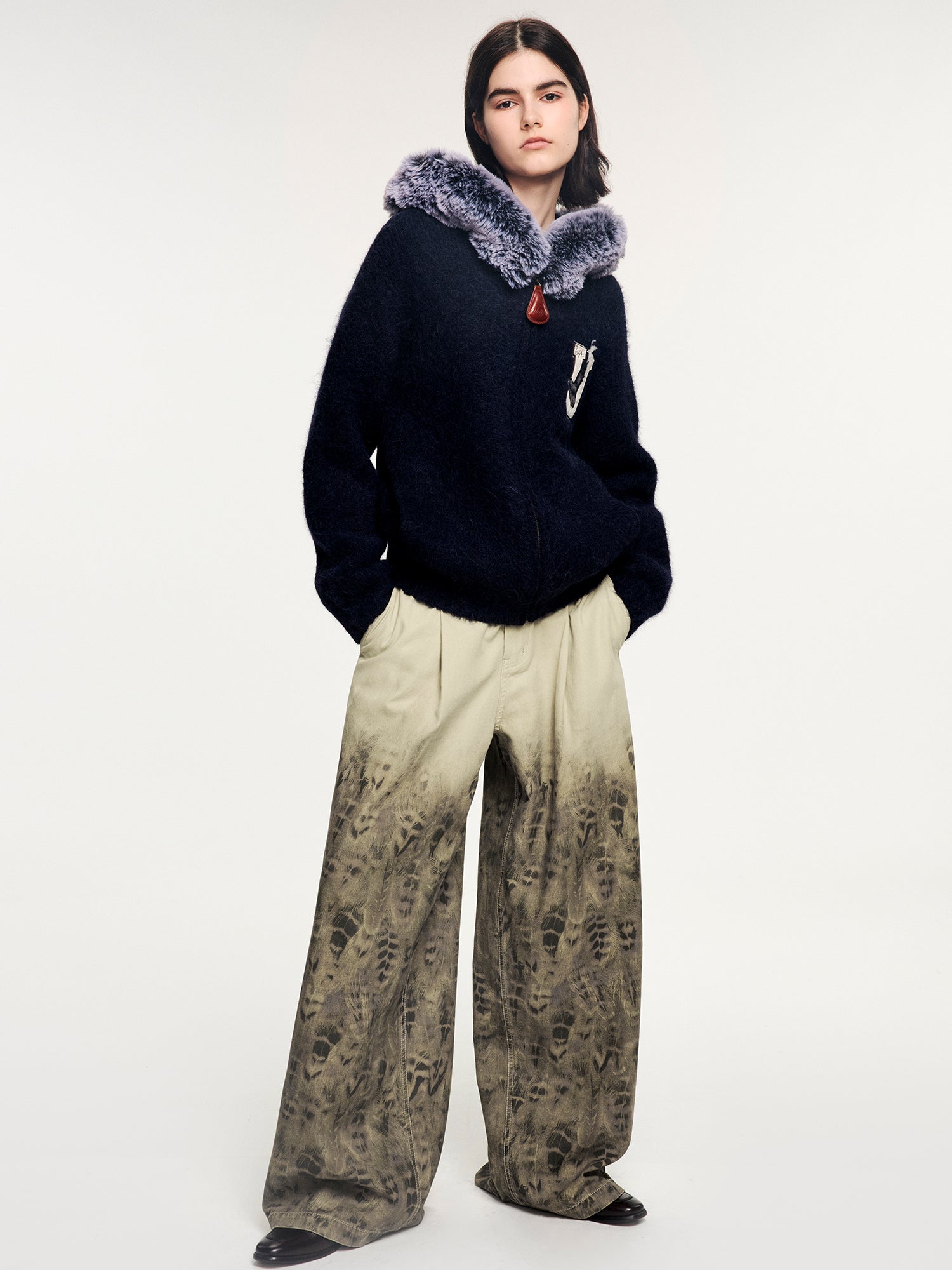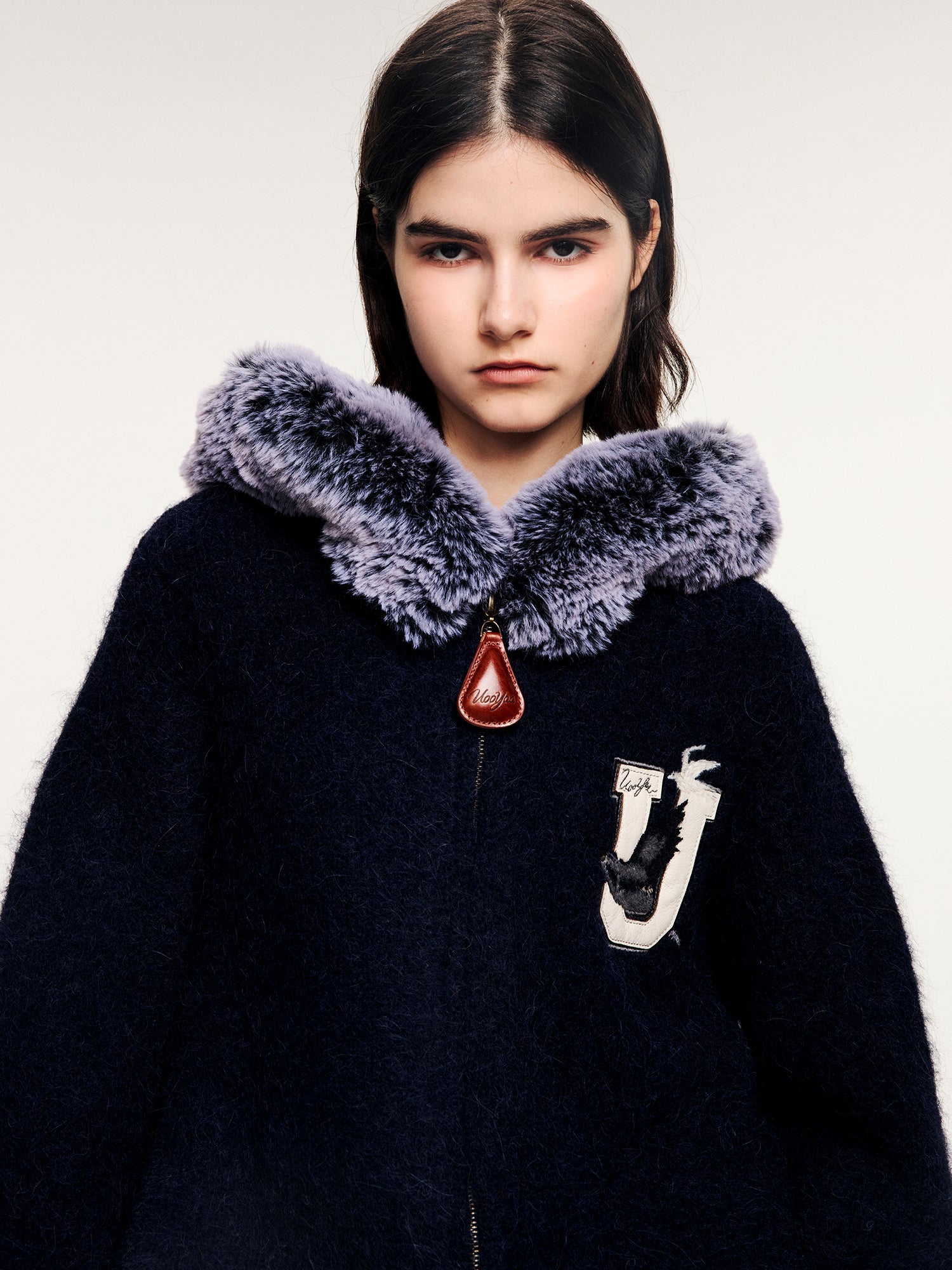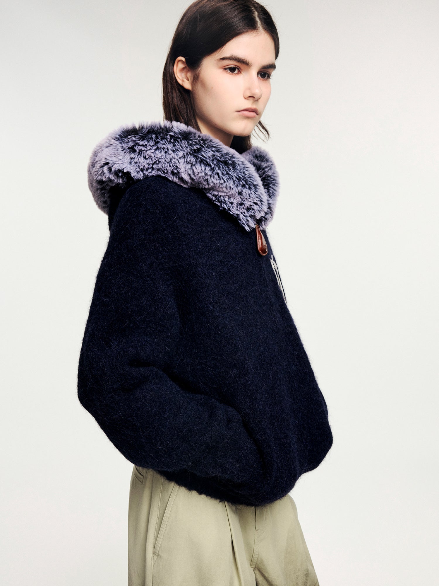 Made with soft knit yarn and topped with a plush faux fur collar, this hooded zip-up cardigan brings cozy warmth with a fantasy-luxe twist.