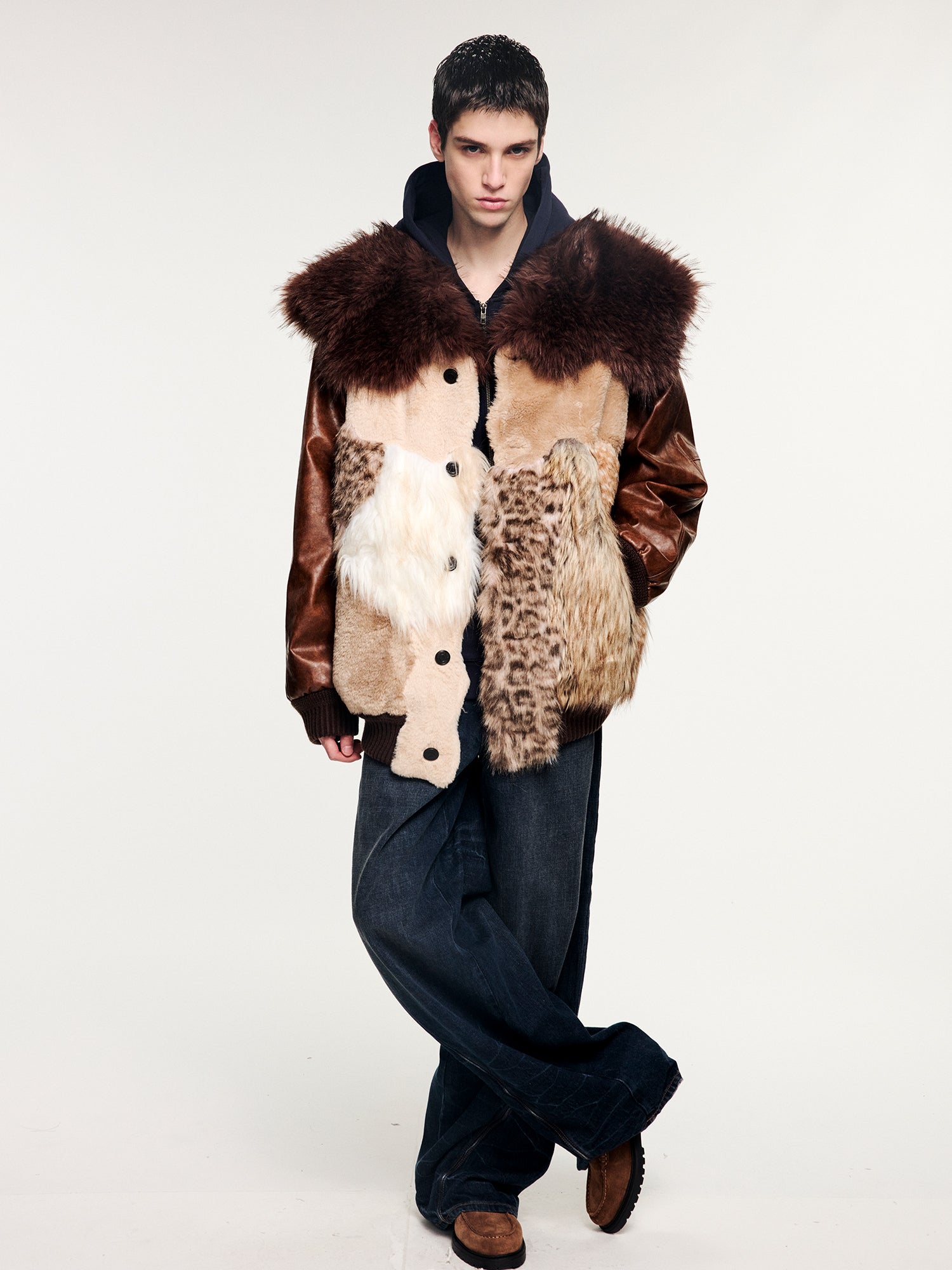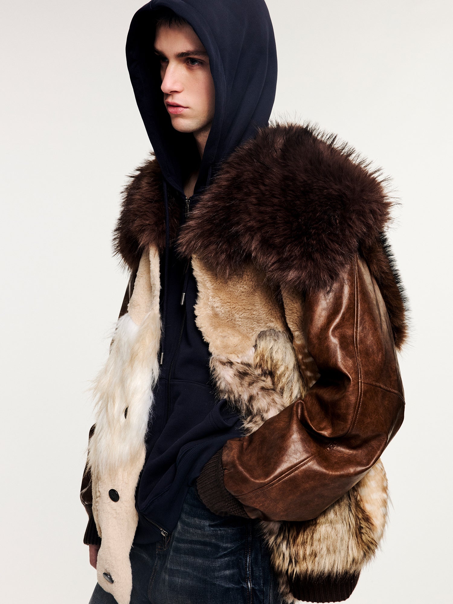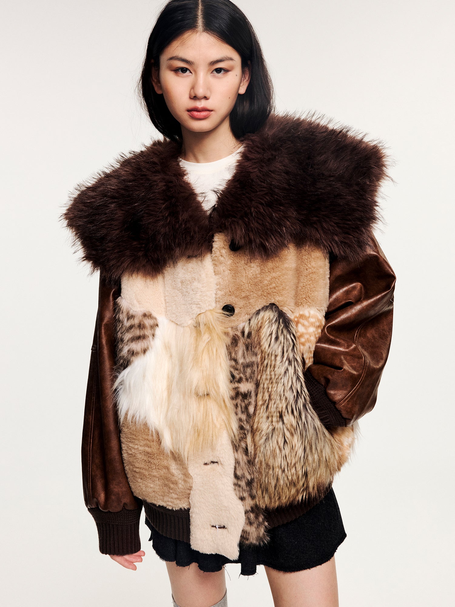 Eight types of textured faux fur pair with PU leather sleeves in this naval-collar varsity jacket. Asymmetric edges add boldness and flair.