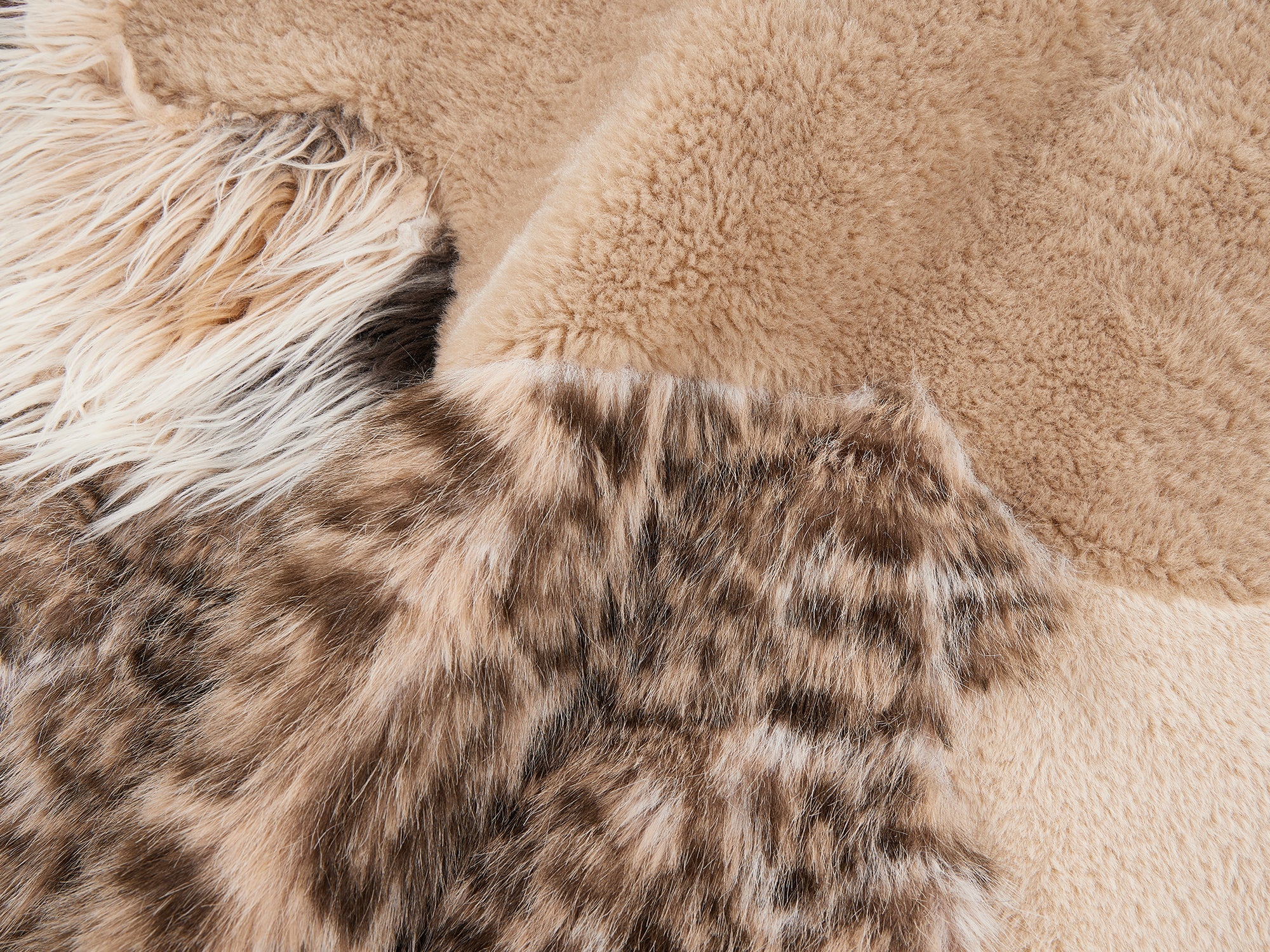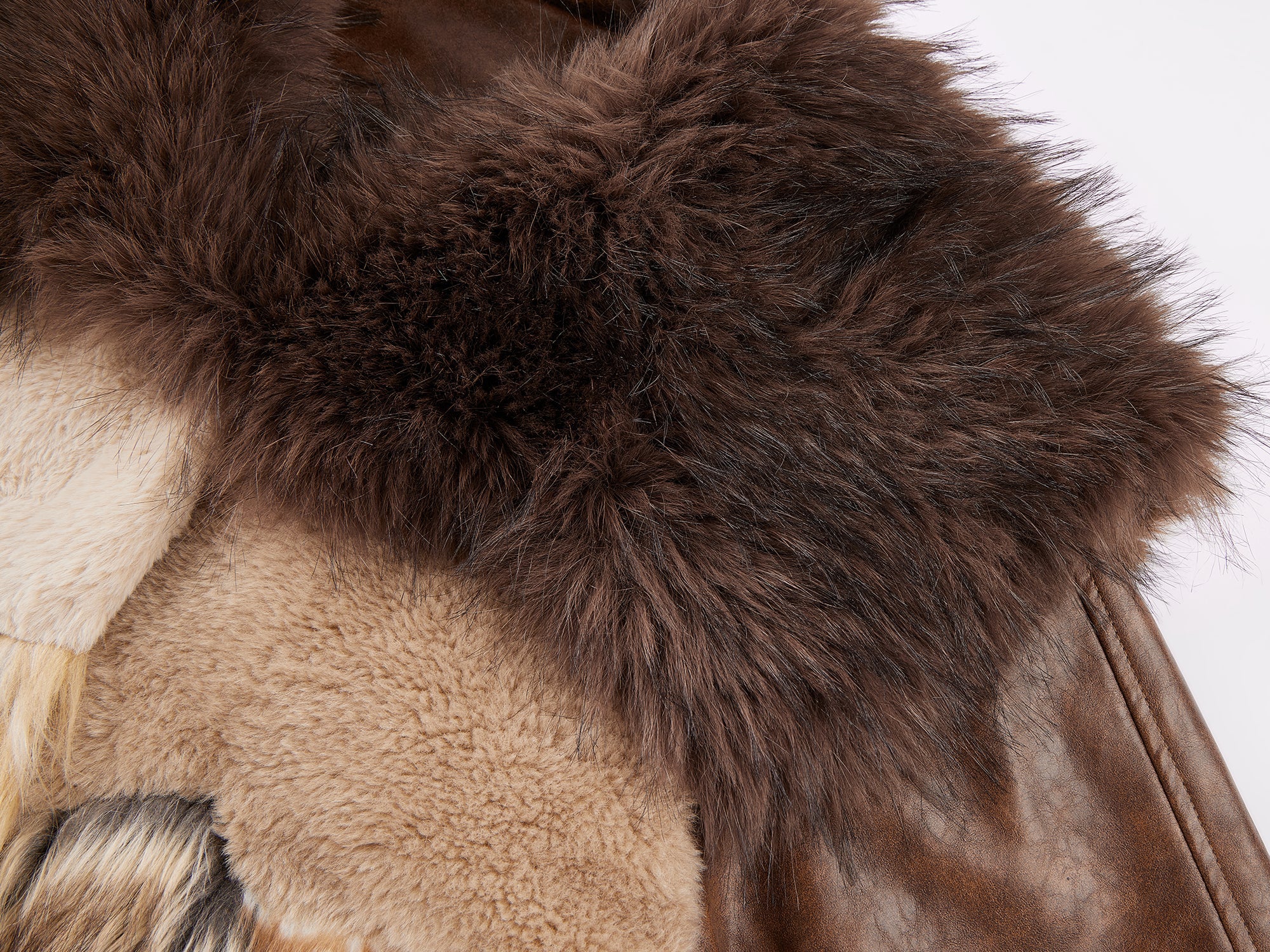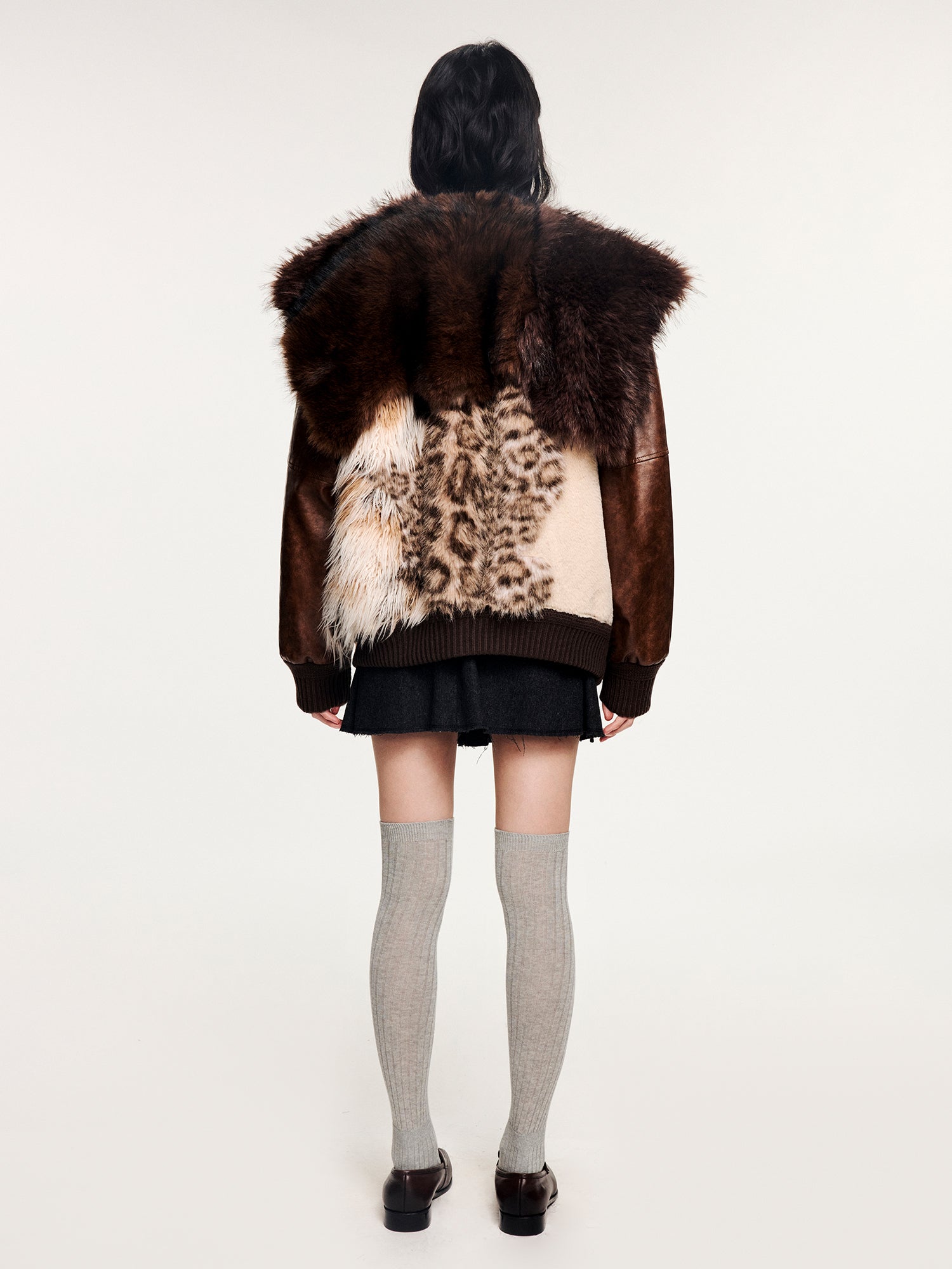 Eight types of textured faux fur pair with PU leather sleeves in this naval-collar varsity jacket. Asymmetric edges add boldness and flair.