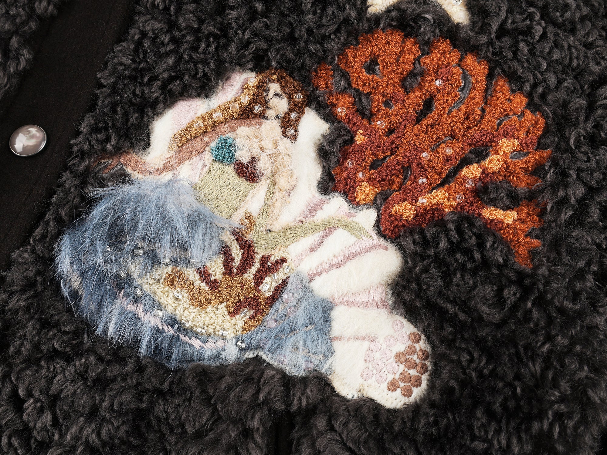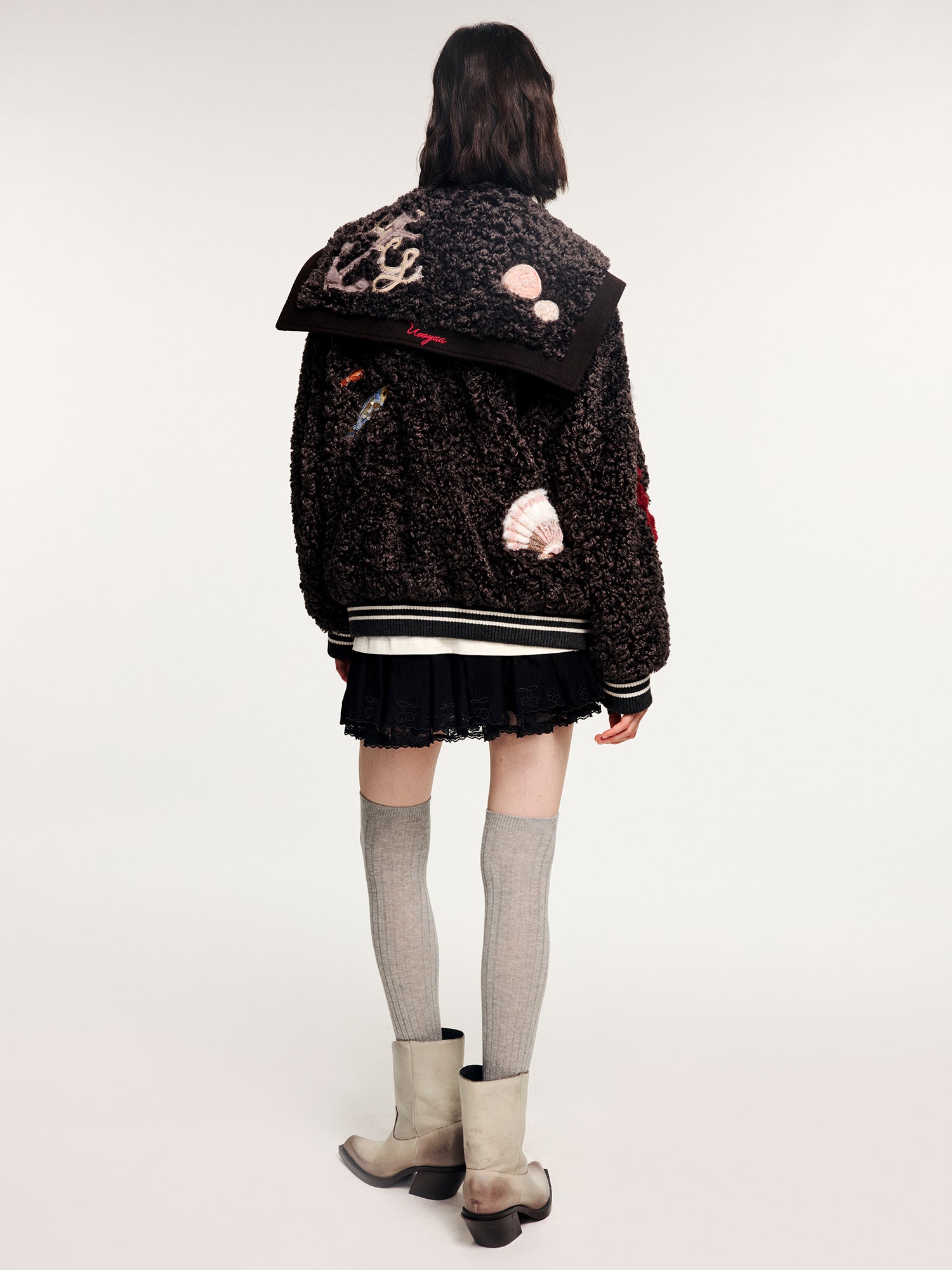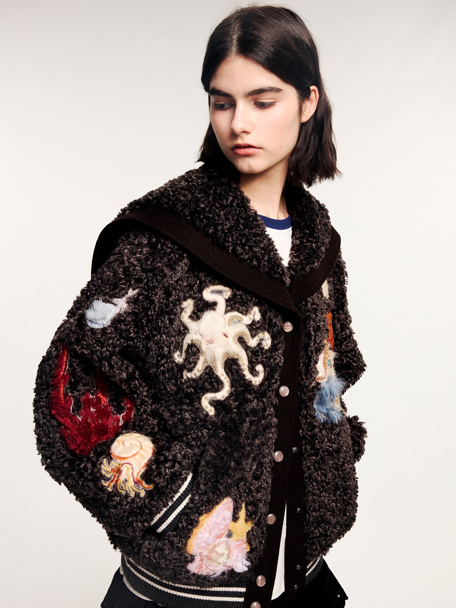 Classic sailor collar baseball jacket in plush fabric, featuring 15 furry appliqués and rich bead embroidery of fantasy undersea creatures.