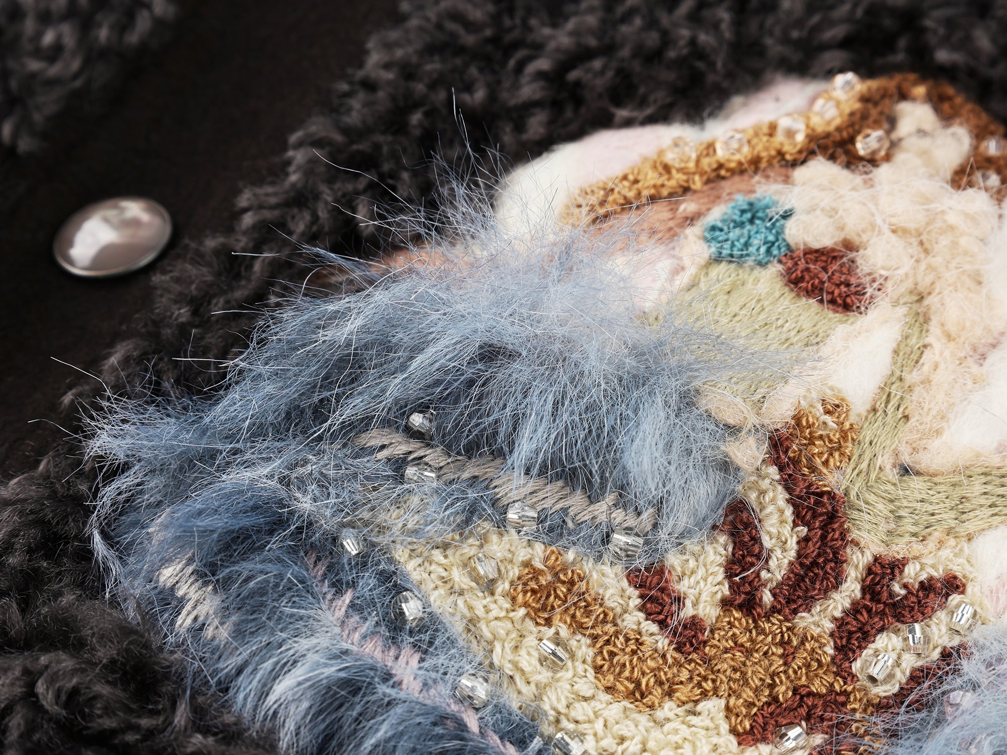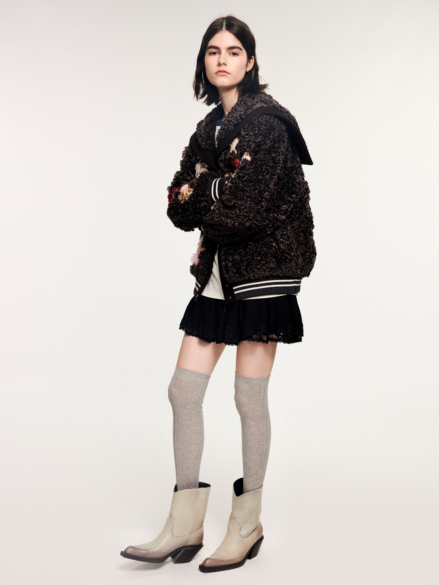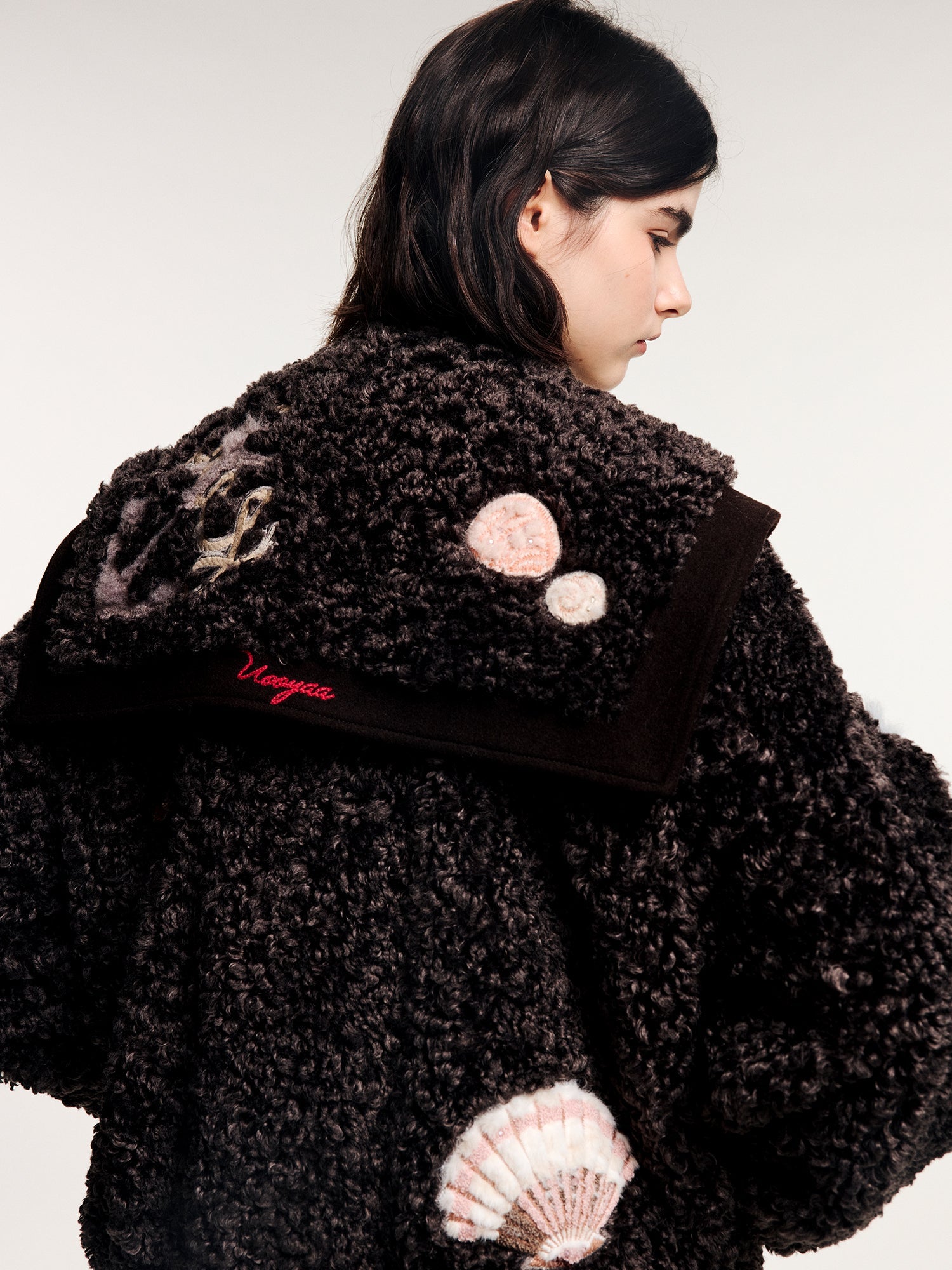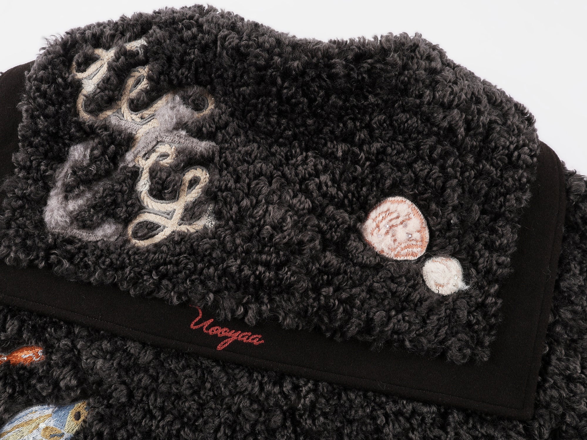 Classic sailor collar baseball jacket in plush fabric, featuring 15 furry appliqués and rich bead embroidery of fantasy undersea creatures.