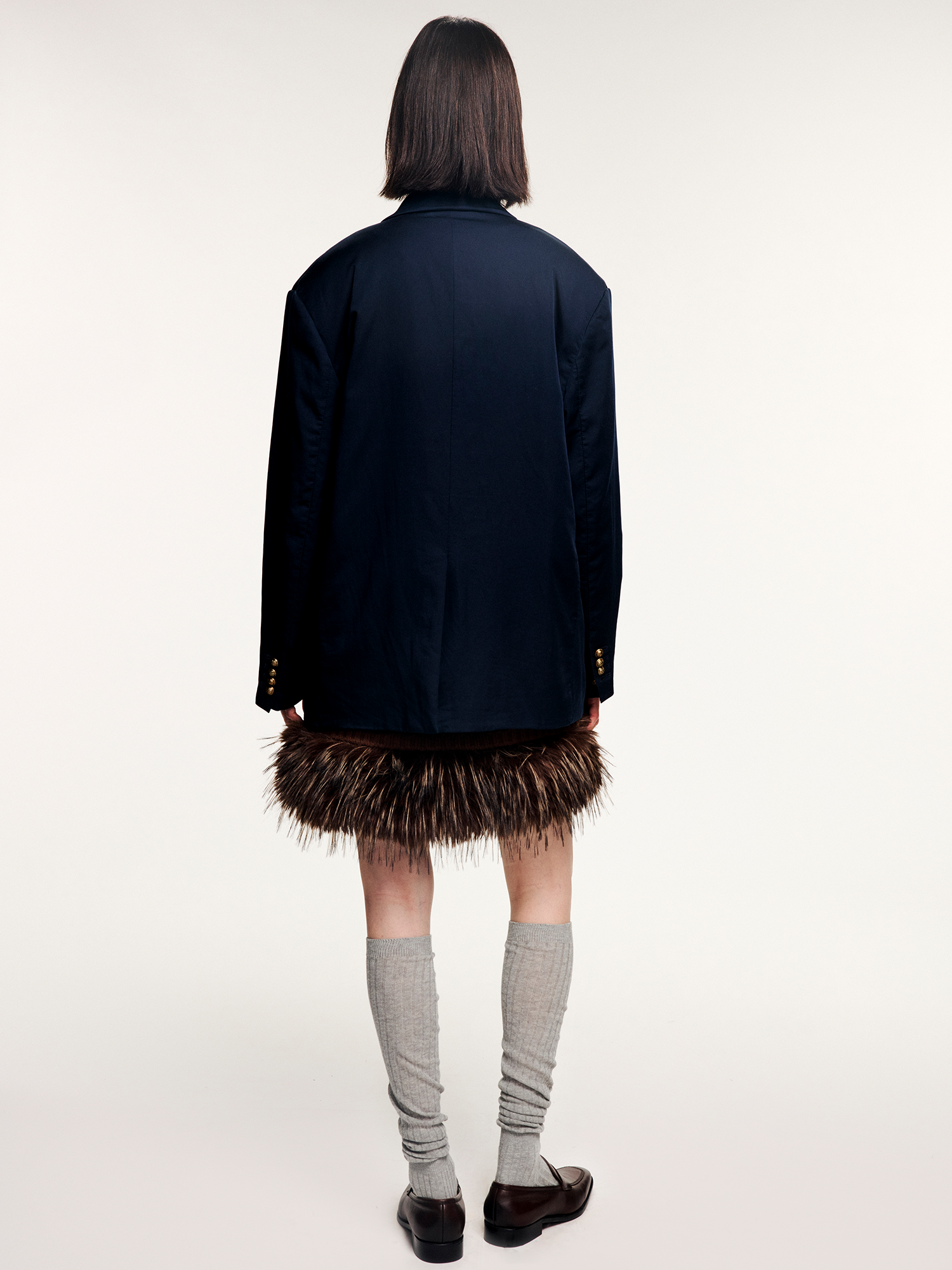 Loosely tailored blazer decorated with deer and mermaid crests, evoking a whimsical urban mood.