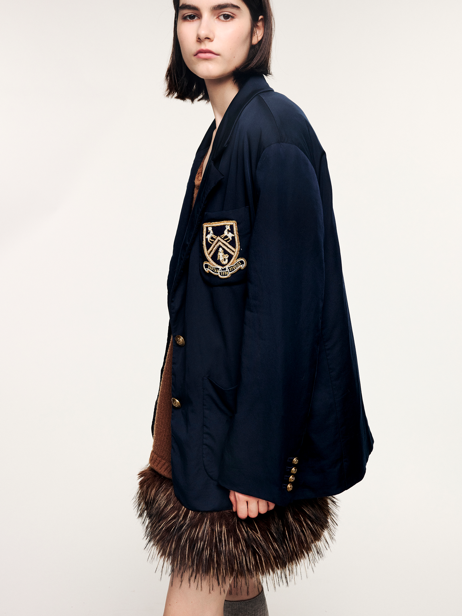 Quilted tailoring gives the blazer a fuller shape. Beaded embroidery on the crest logo adds detailed texture and playful contrast.Fabric: