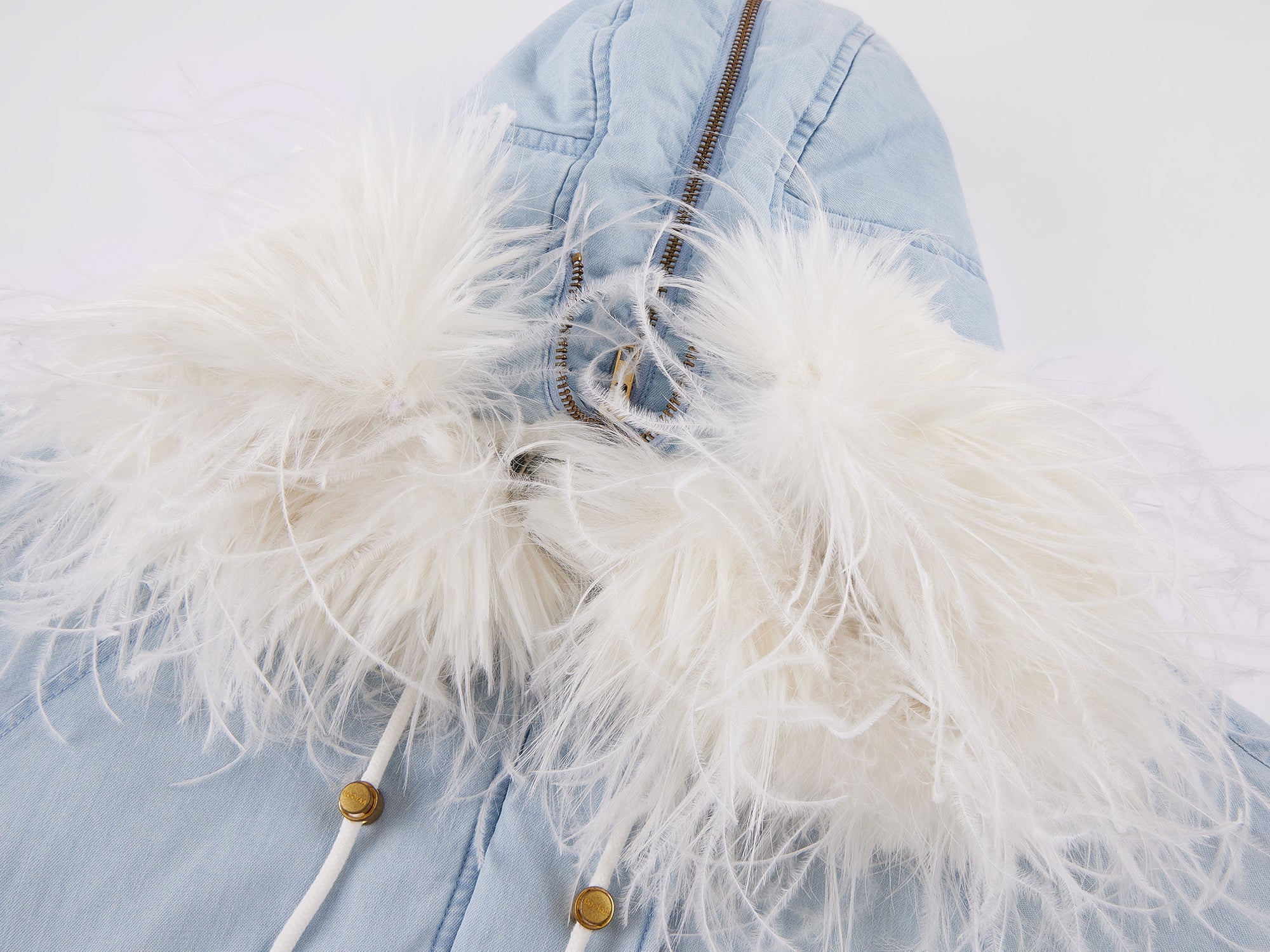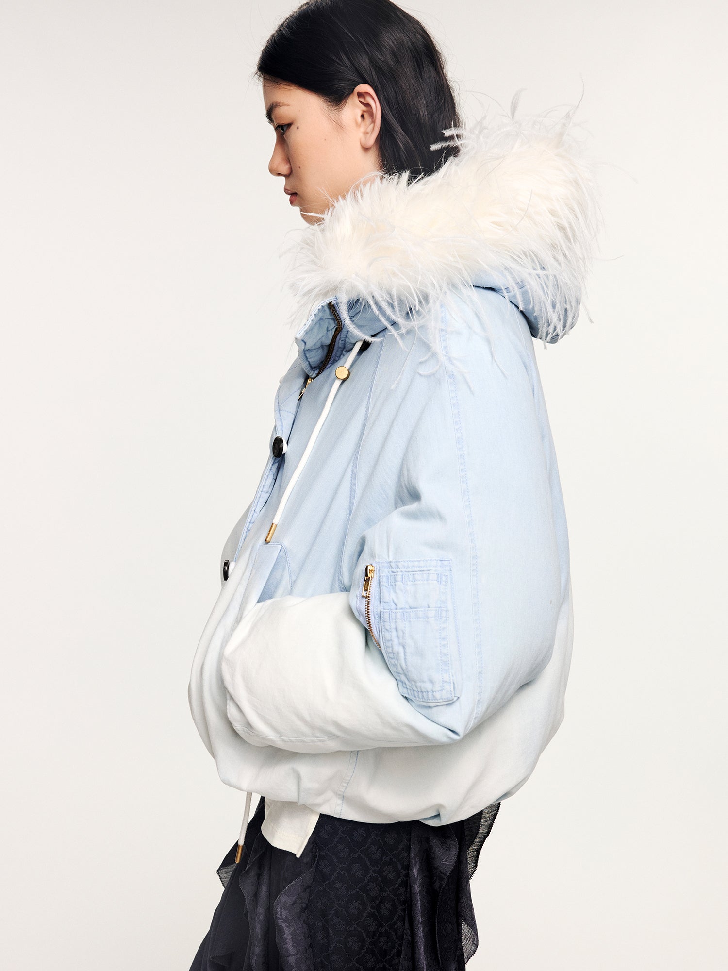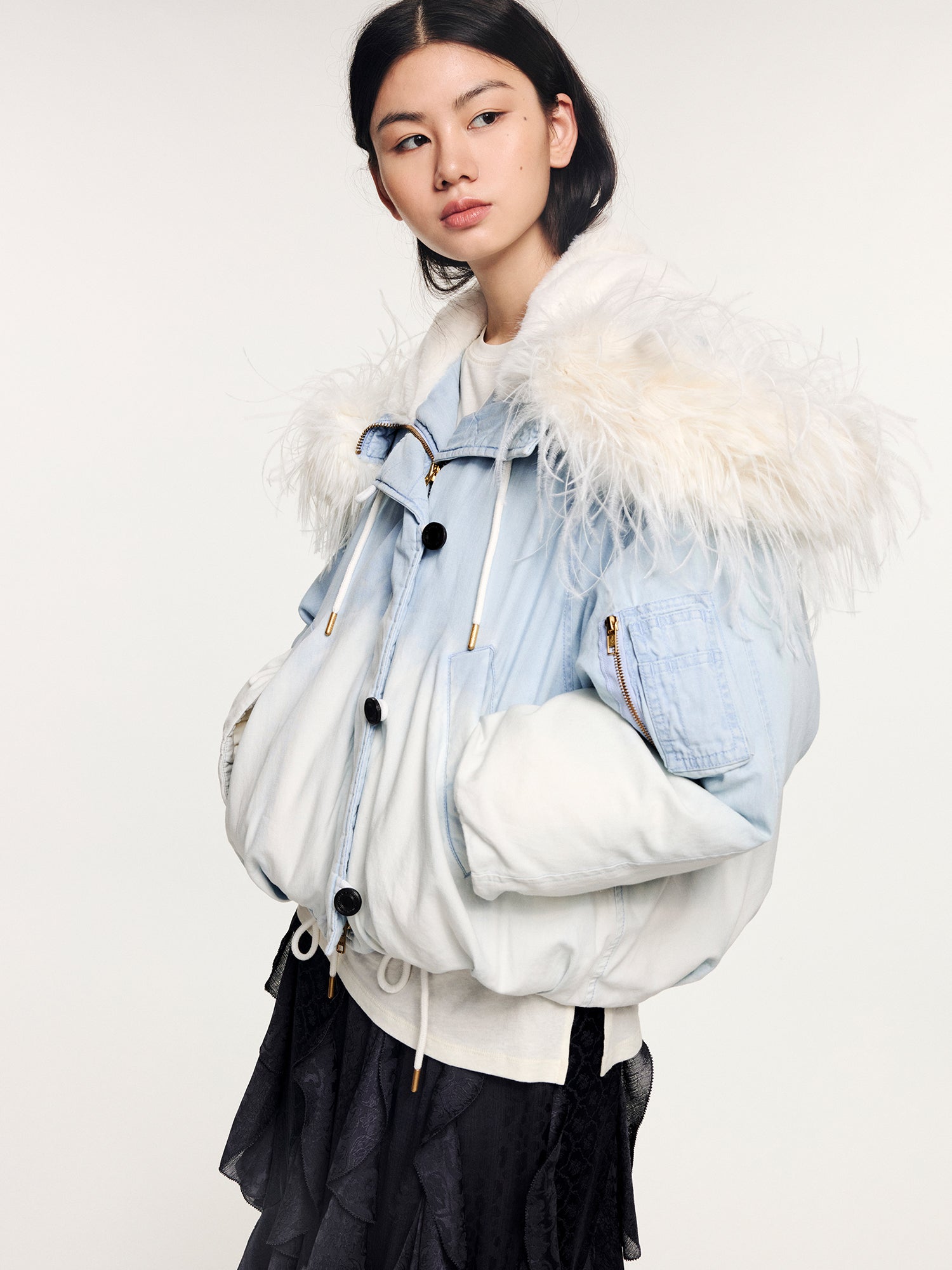 An N2B flight jacket in surreal pale blue gradient denim, padded with down and finished with a fluffy ostrich feather collar, bold and fantastical in an urban silhouette.