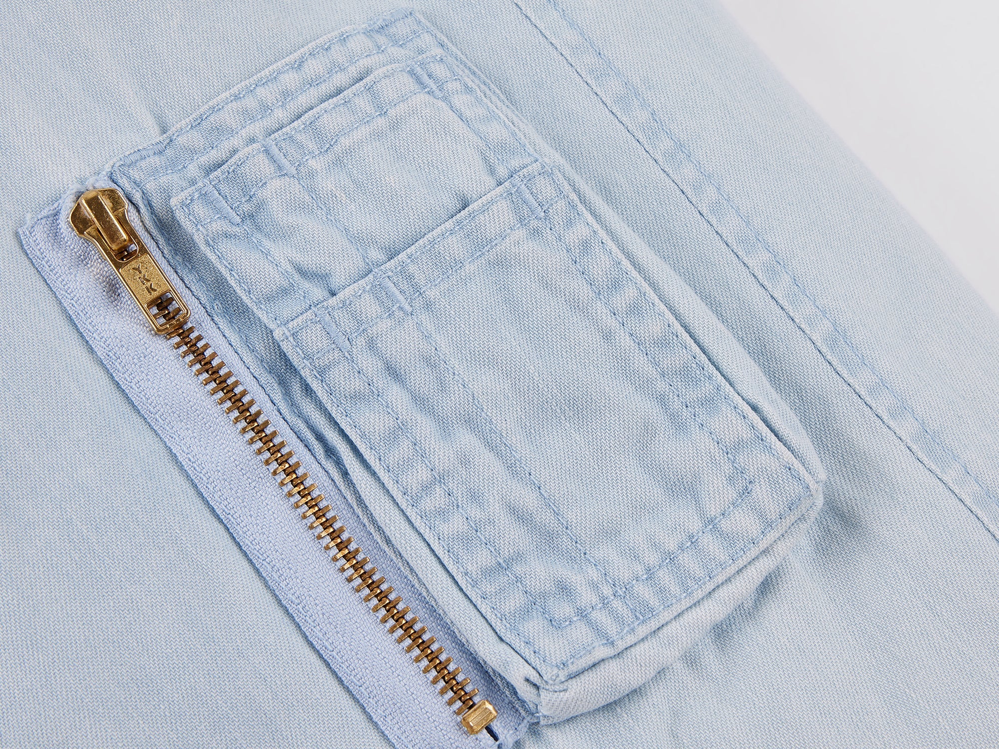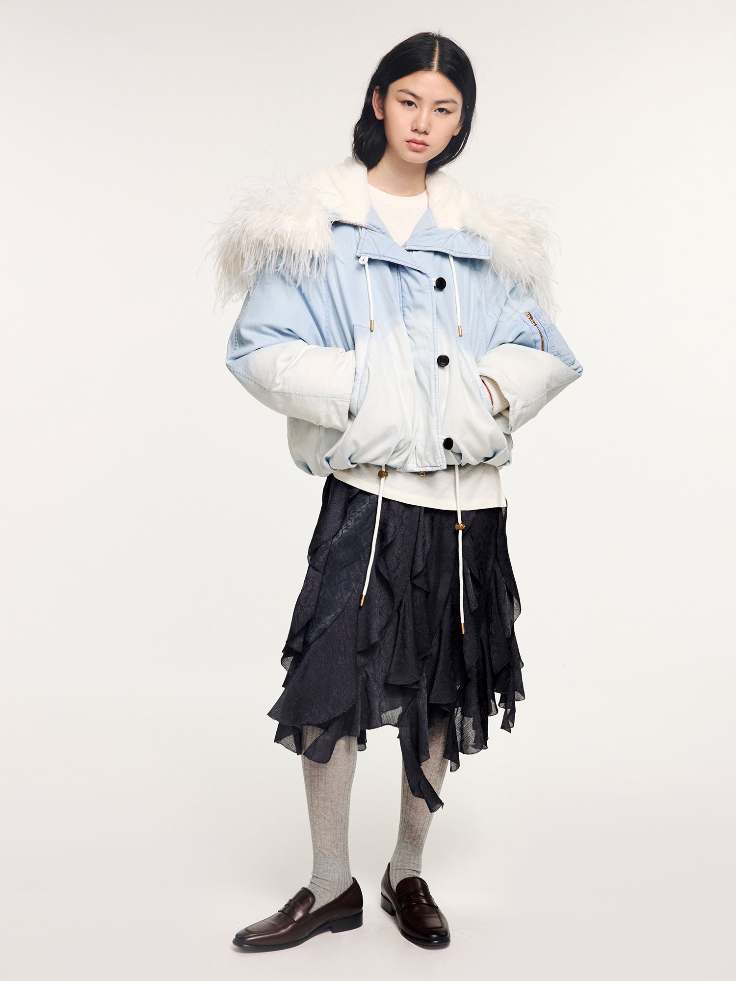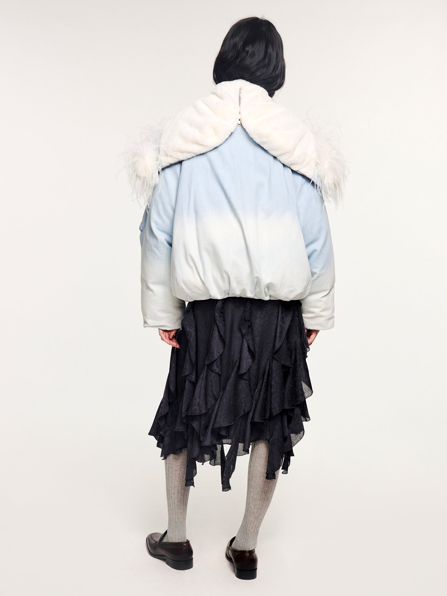 An N2B flight jacket in surreal pale blue gradient denim, padded with down and finished with a fluffy ostrich feather collar, bold and fantastical in an urban silhouette.