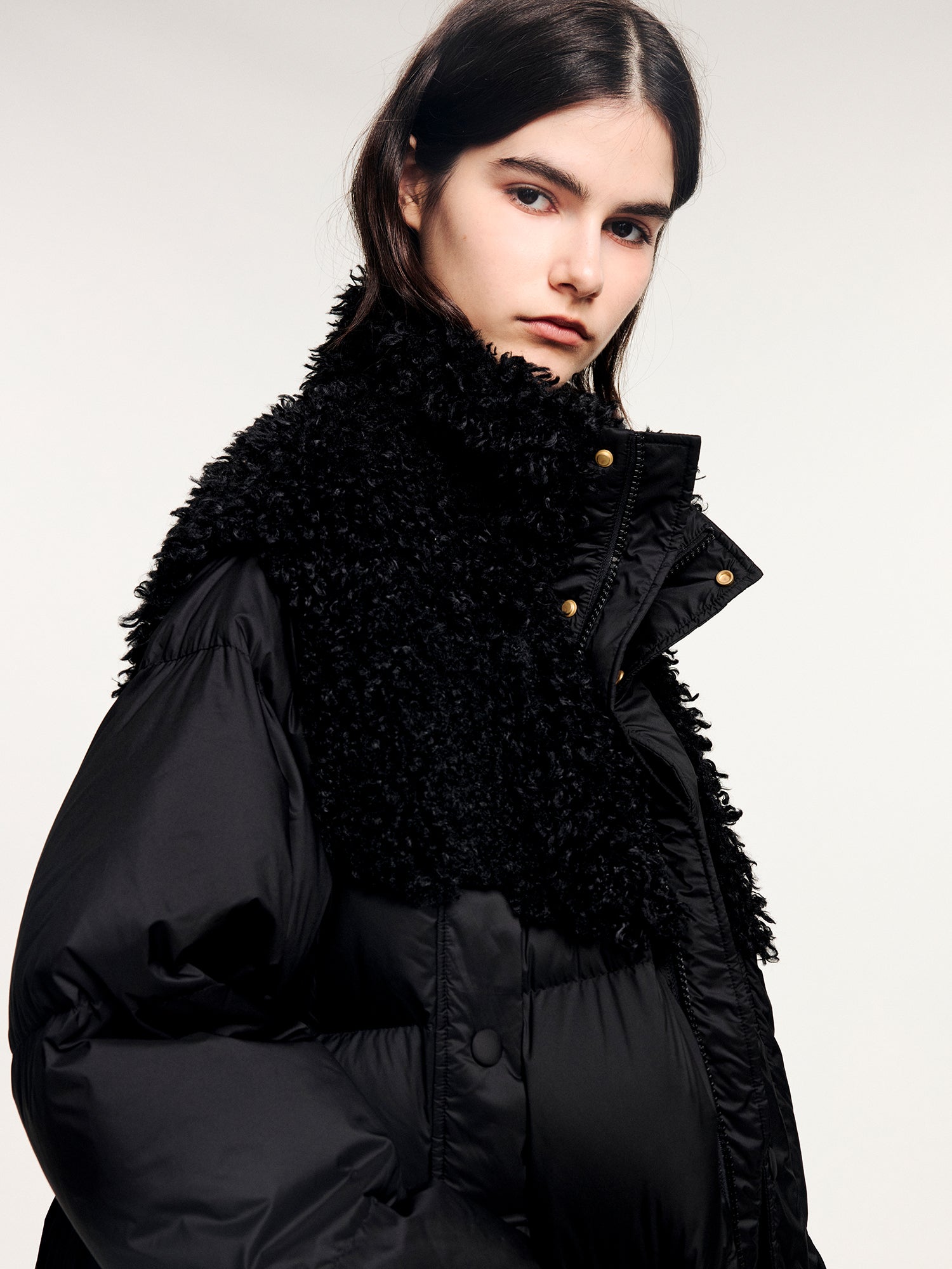 Loose-fit silhouette with plush fleece spliced at the shoulders and collar¡ªoffering warmth and a surreal visual edge.