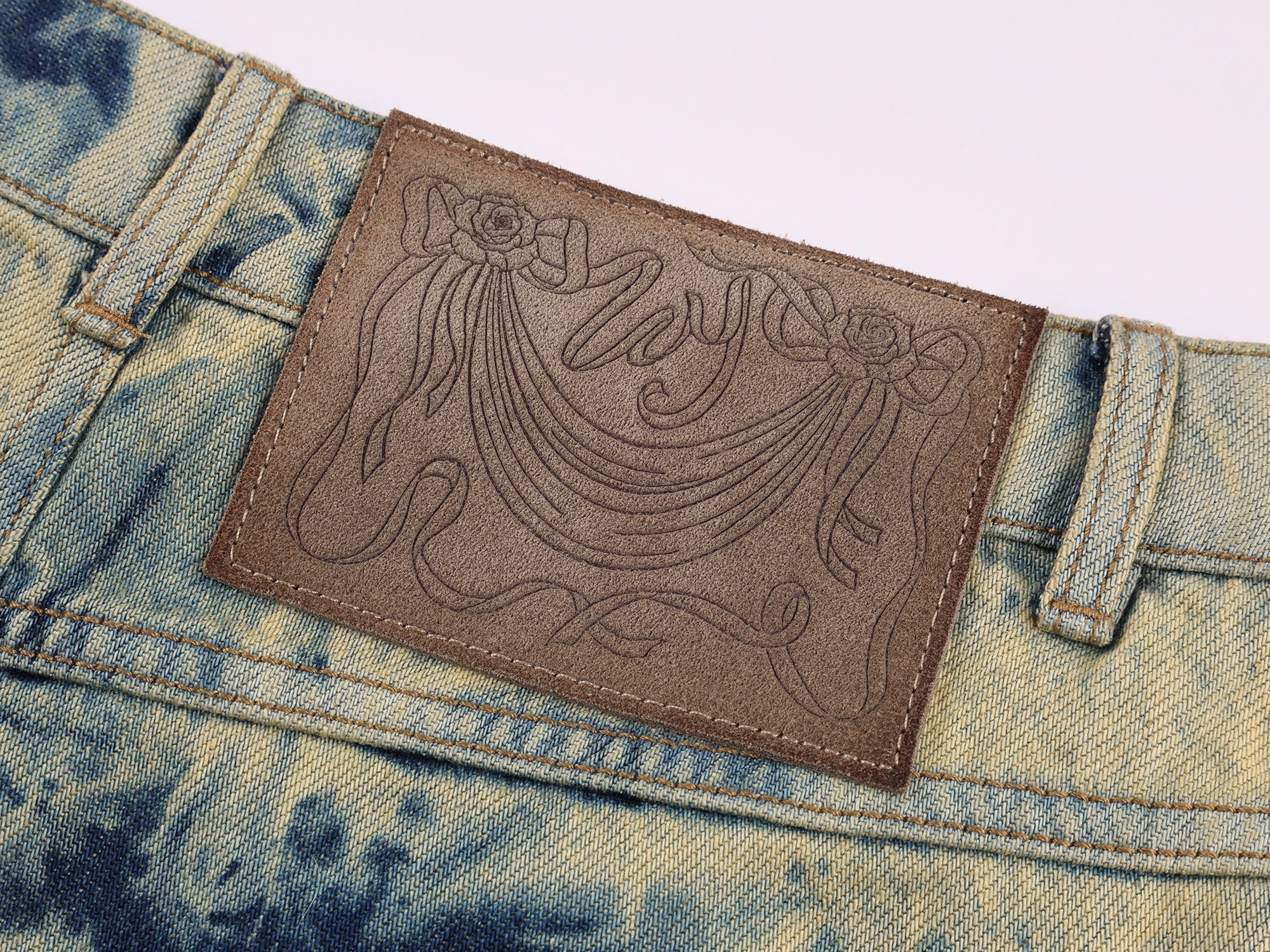 A denim skirt with hand-dye finish, angled panels and oversized ruffle hem for a playful fantasy look.