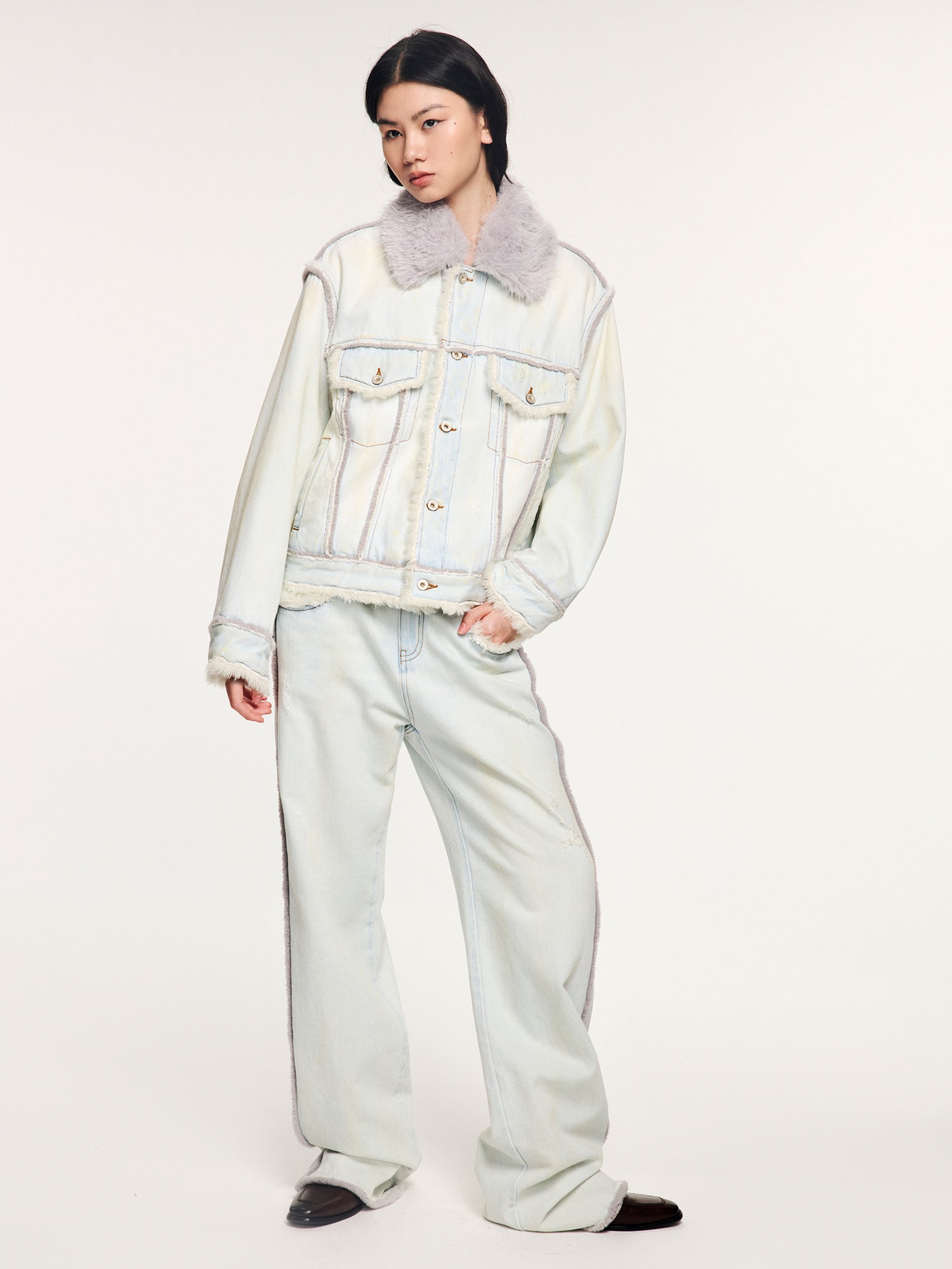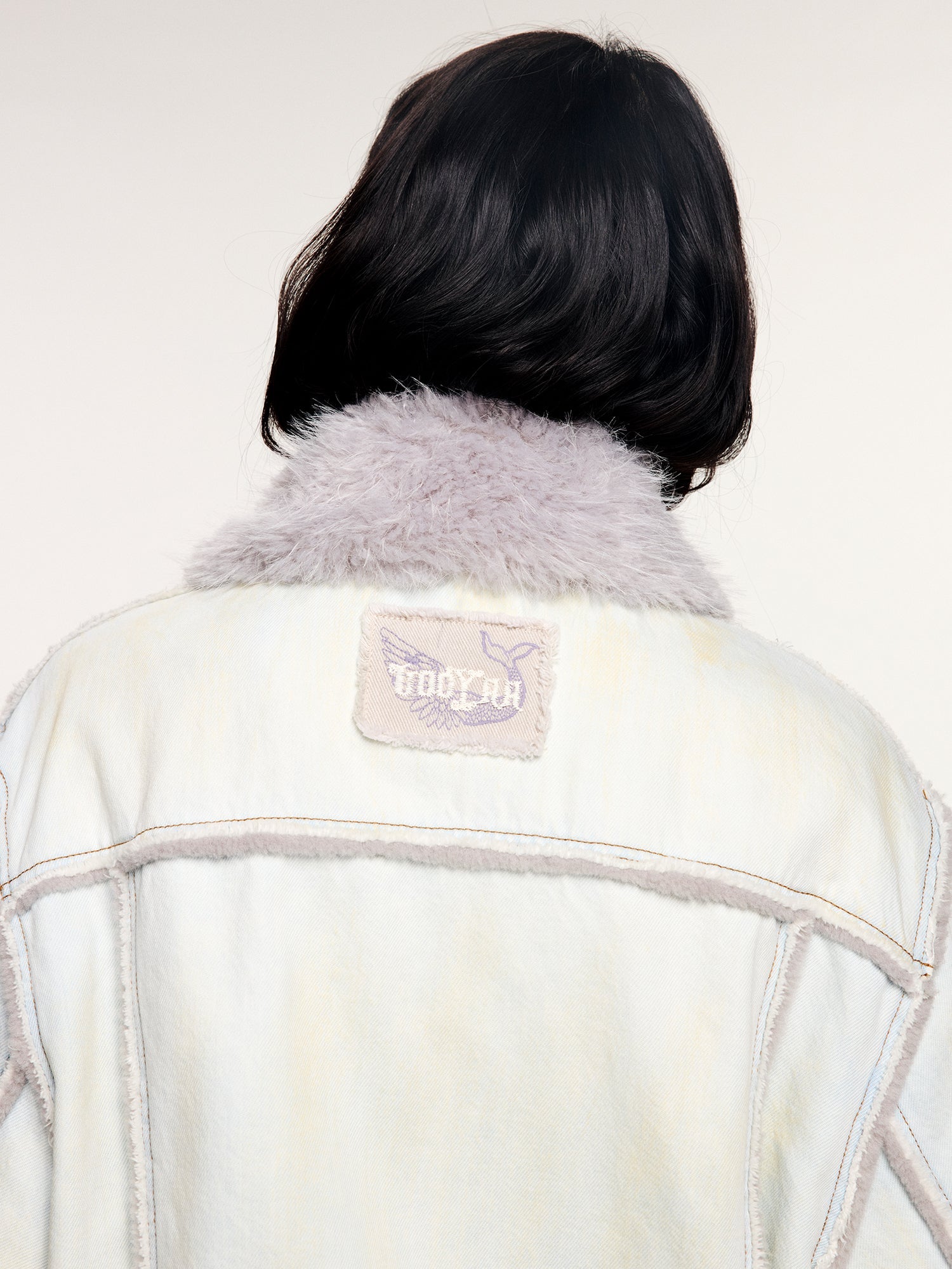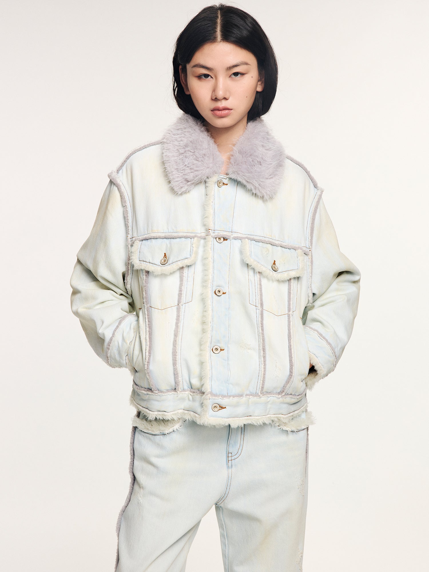 A light-washed Type 3 denim jacket with fur-trimmed seams and plush collar creates a light, youthful silhouette with a fantasy edge.