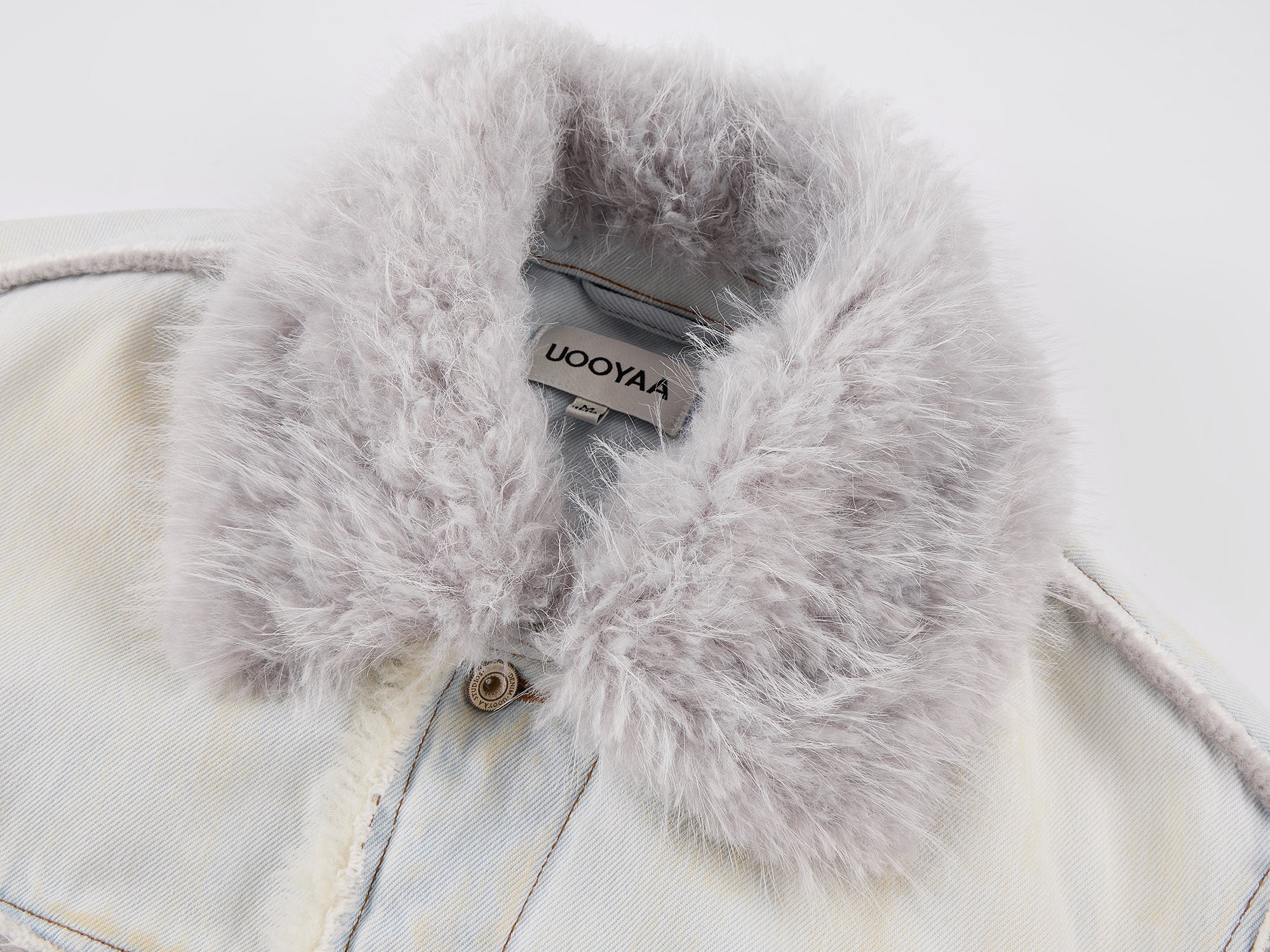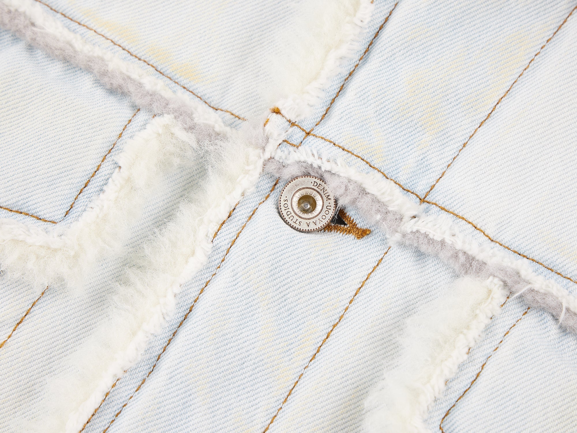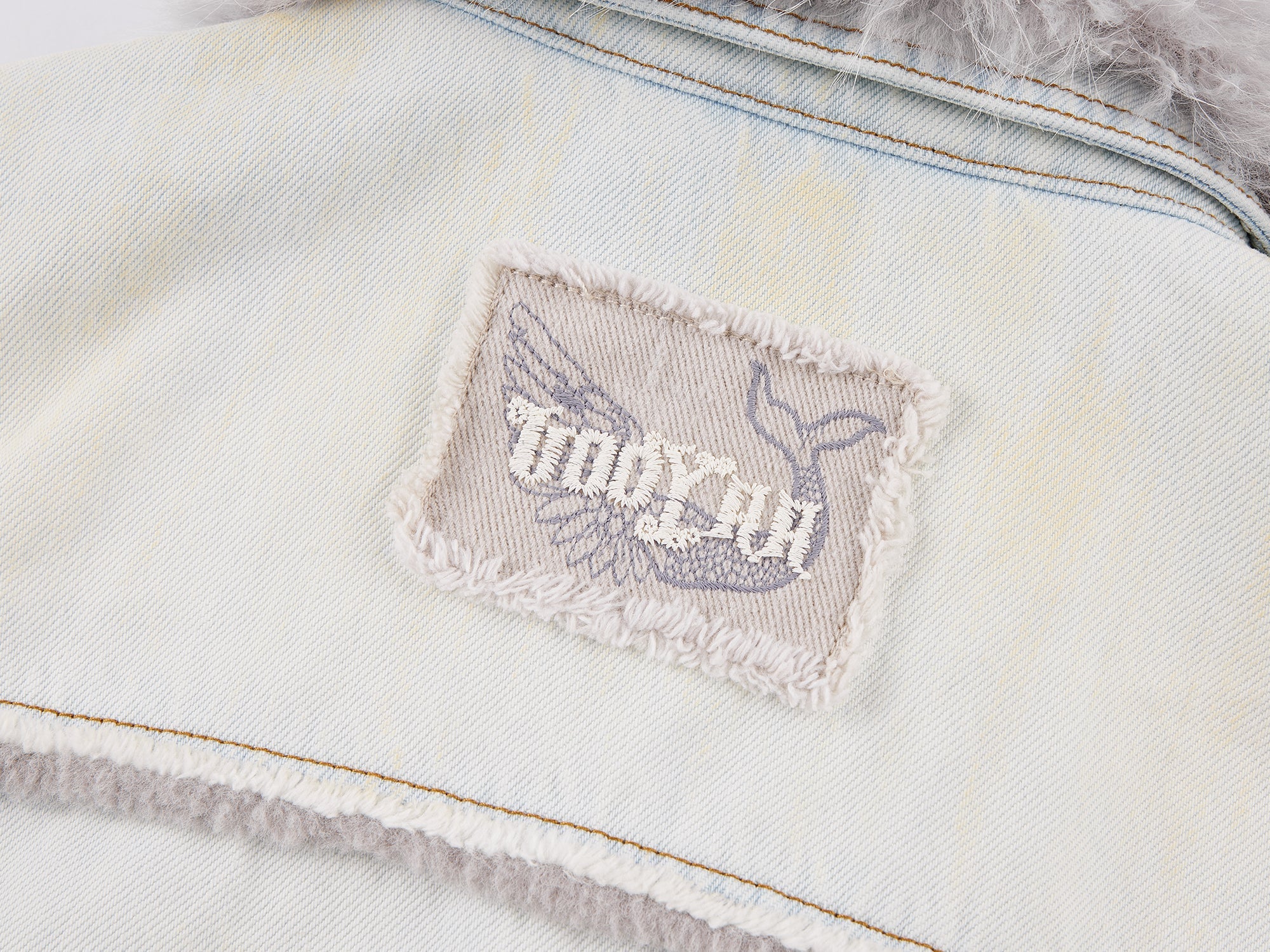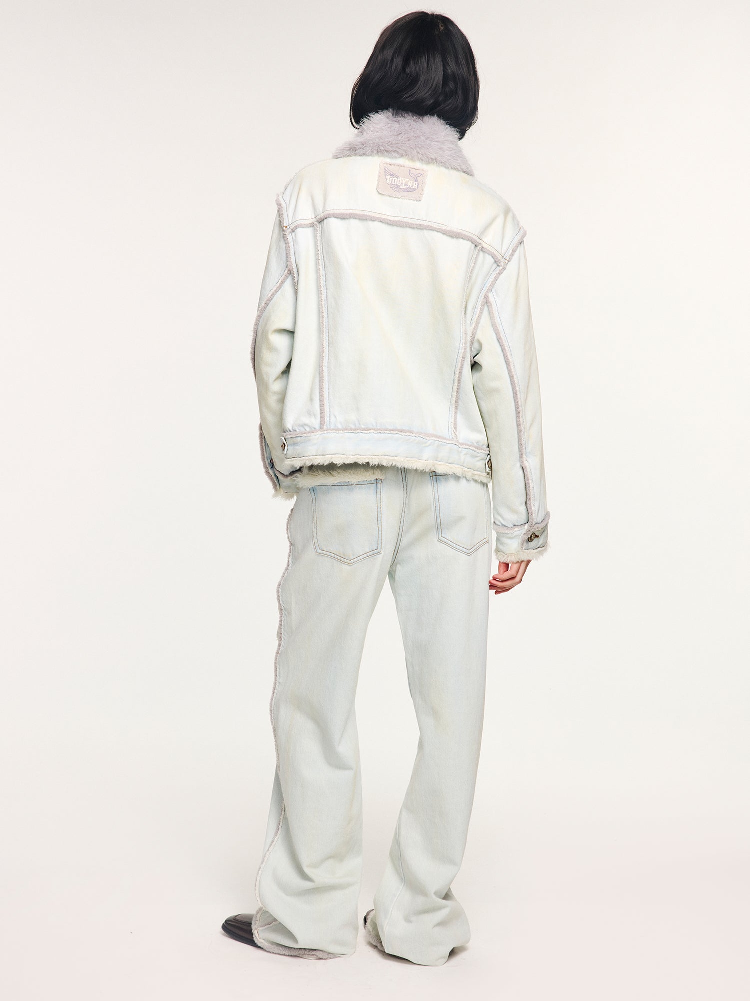 A light-washed Type 3 denim jacket with fur-trimmed seams and plush collar creates a light, youthful silhouette with a fantasy edge.