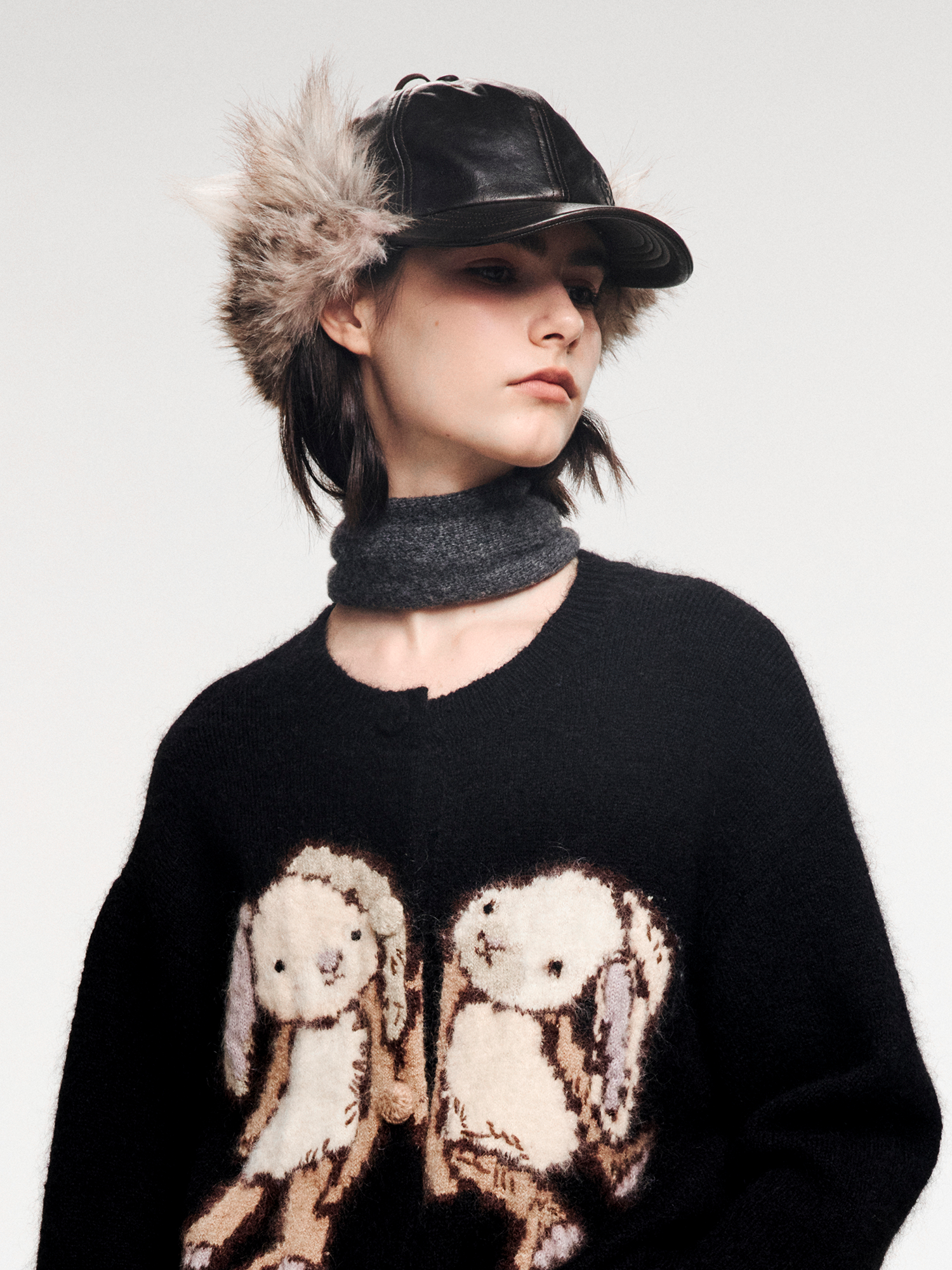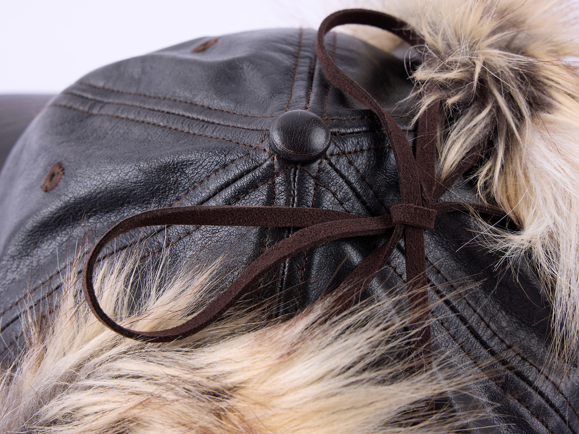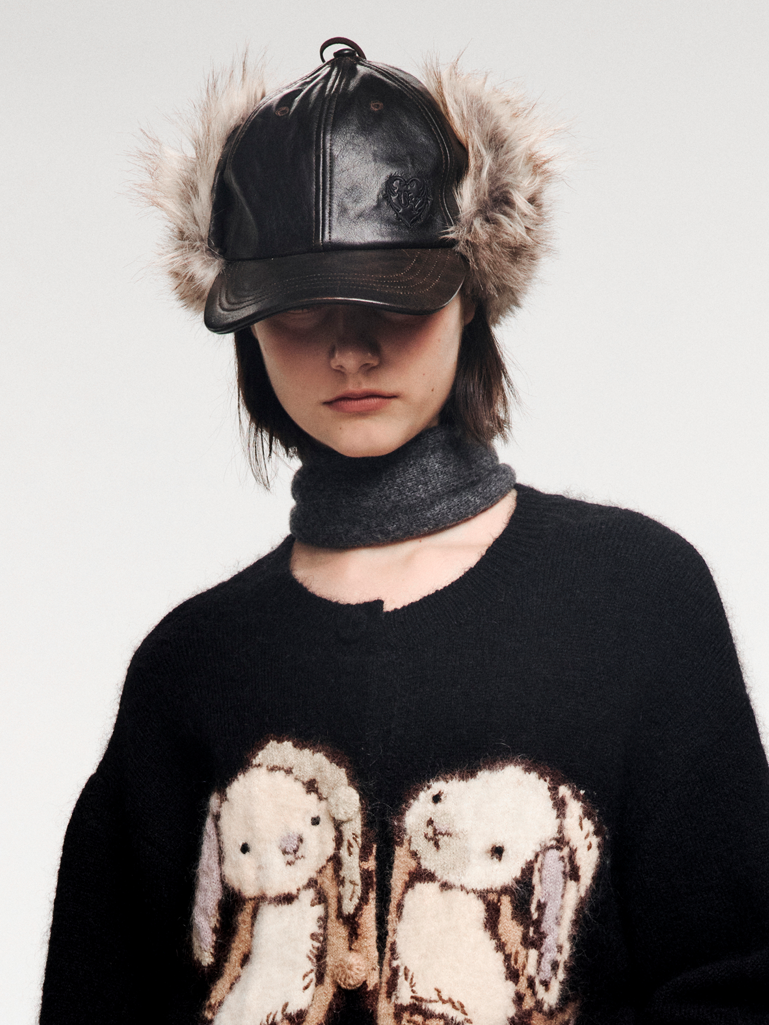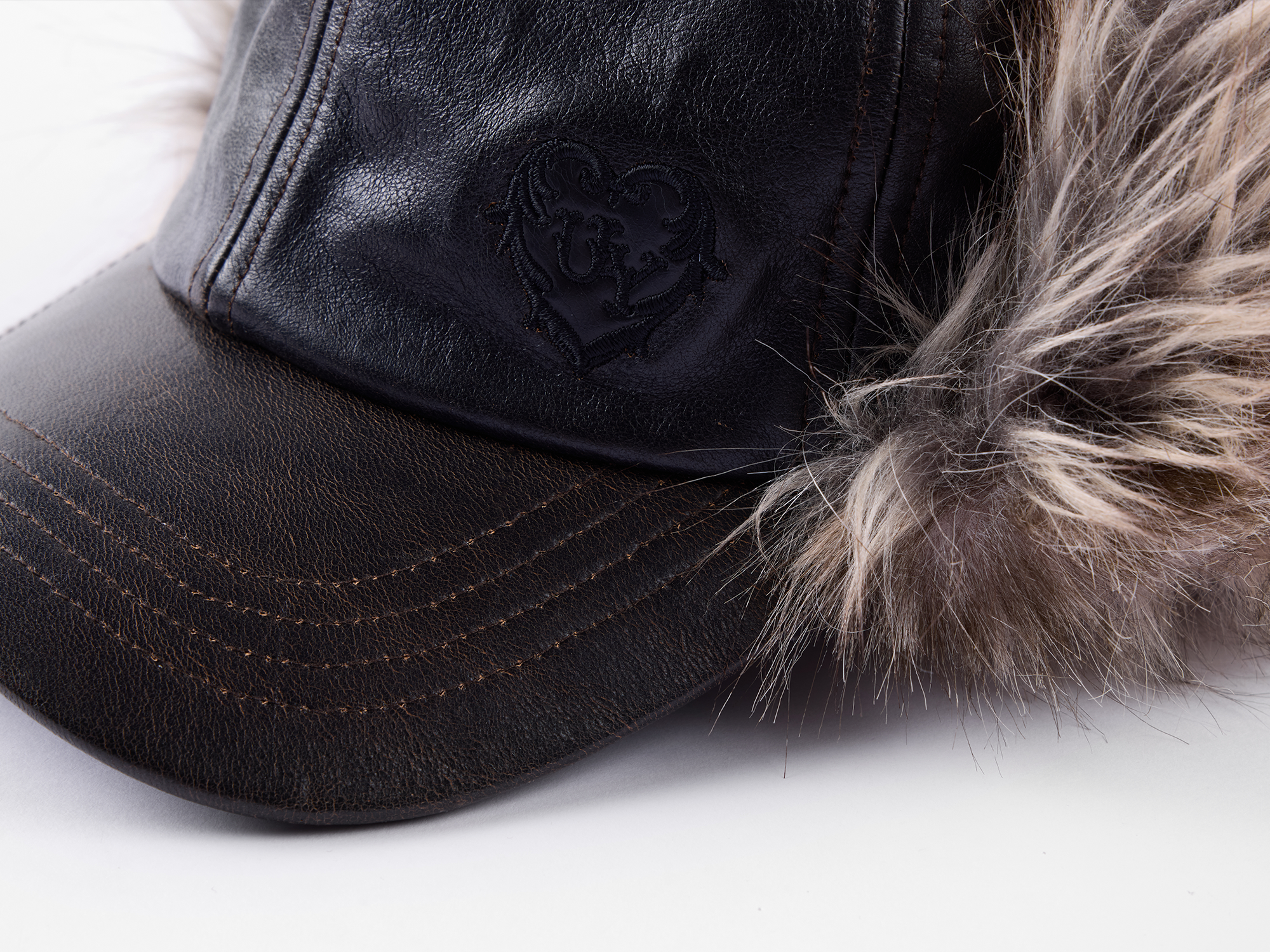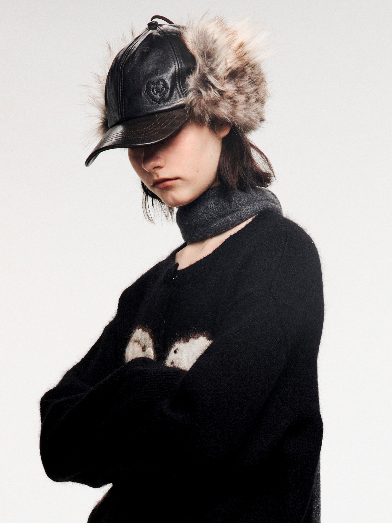 A relaxed fusion of trapper hat and baseball cap, made from wild faux fur and real sheepskin for a refined yet fashion-forward finish.