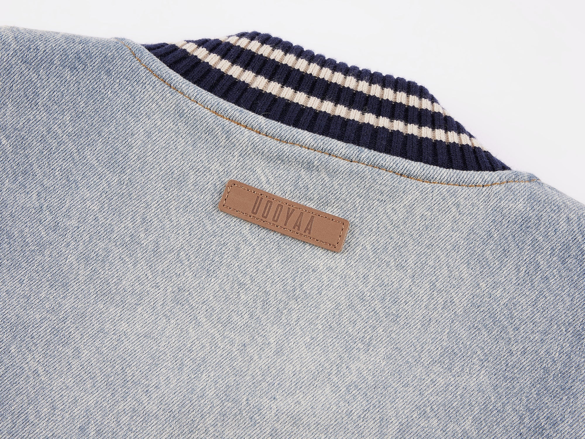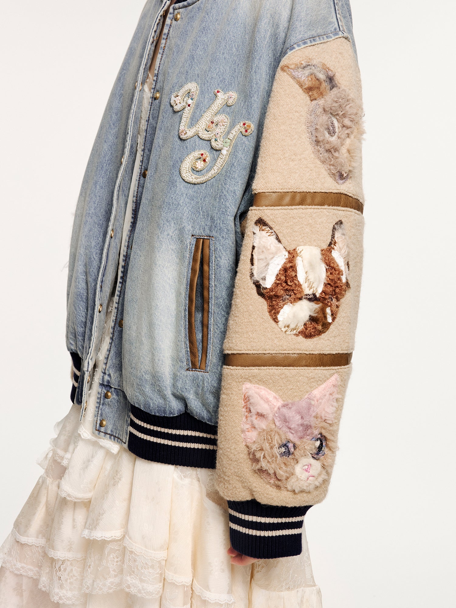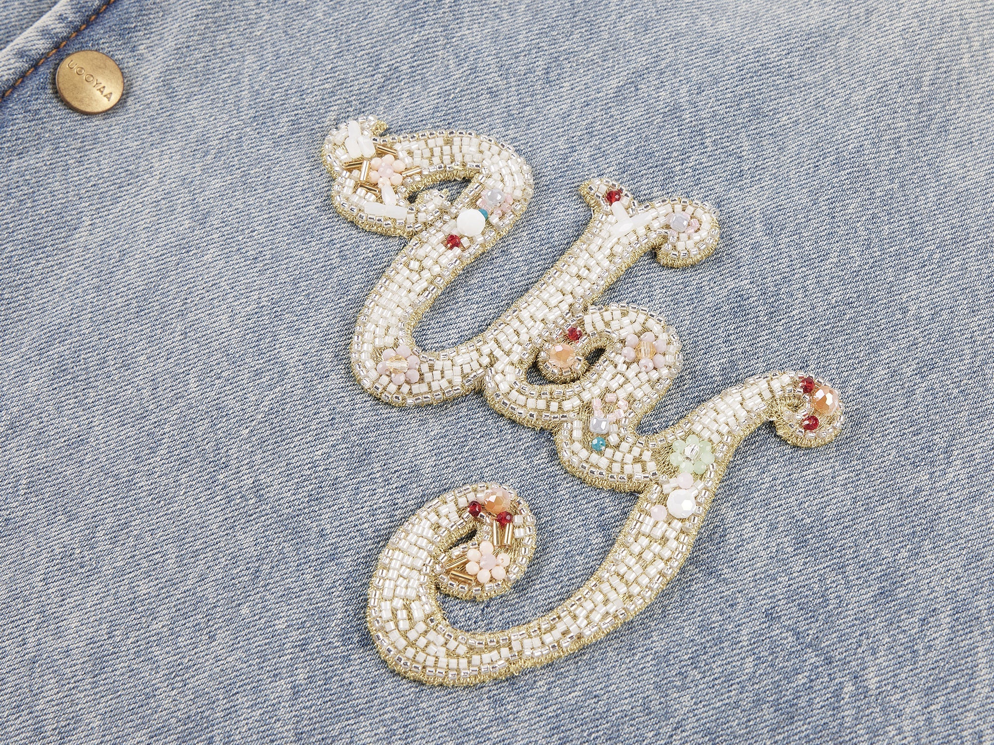 Combines washed denim, woolen fabric, and PU leather for warmth and a vintage tone. Embellished with a UY logo crafted using fine beading and embroidery techniques, enhancing a refined and luxurious feel.
