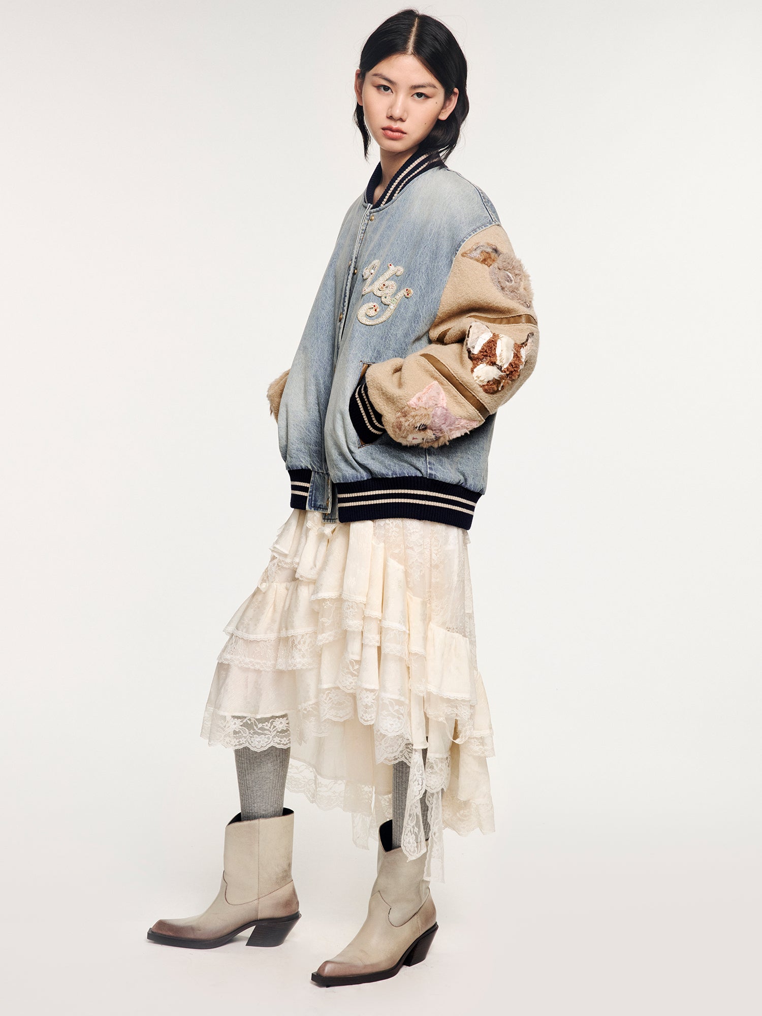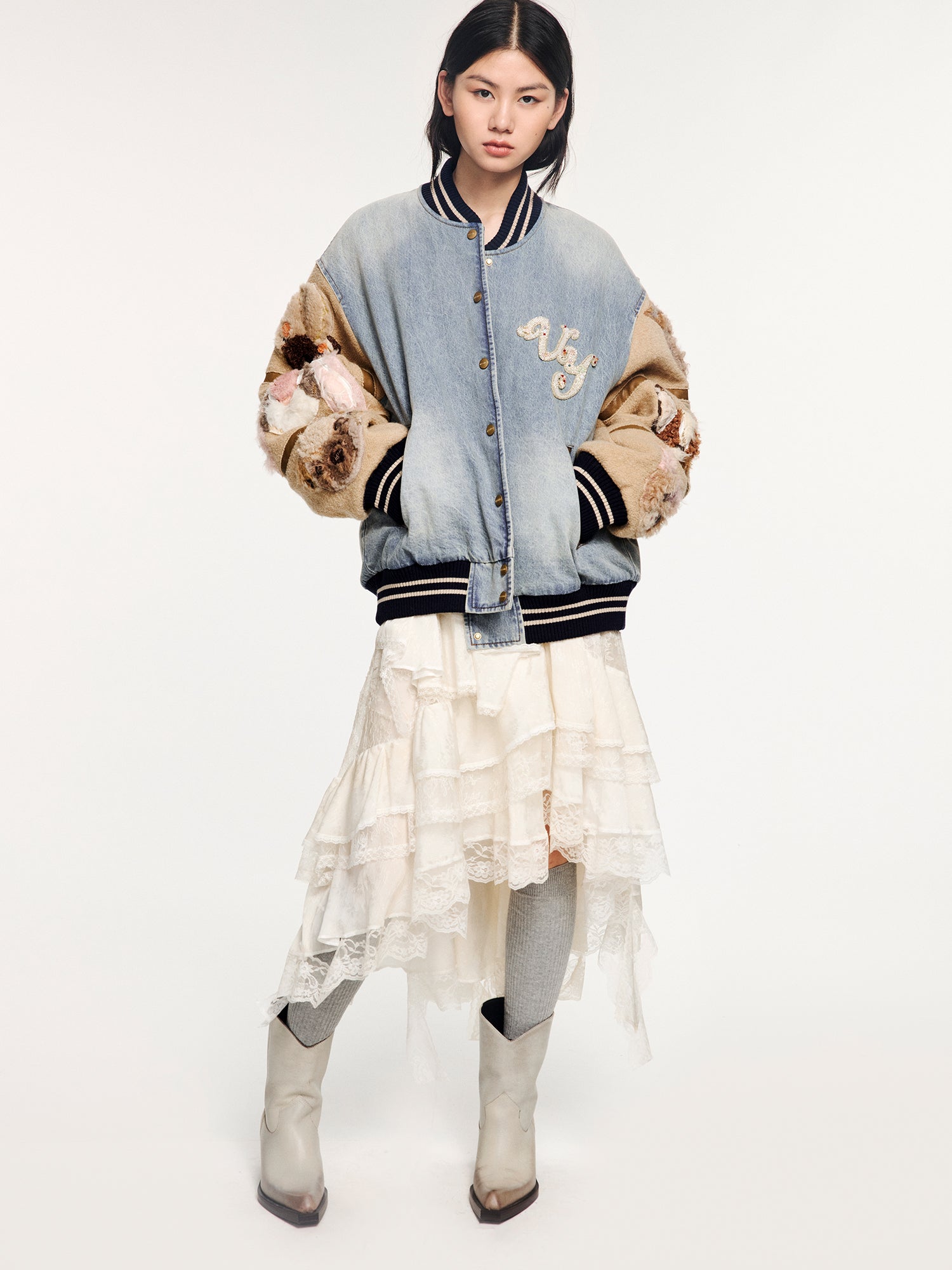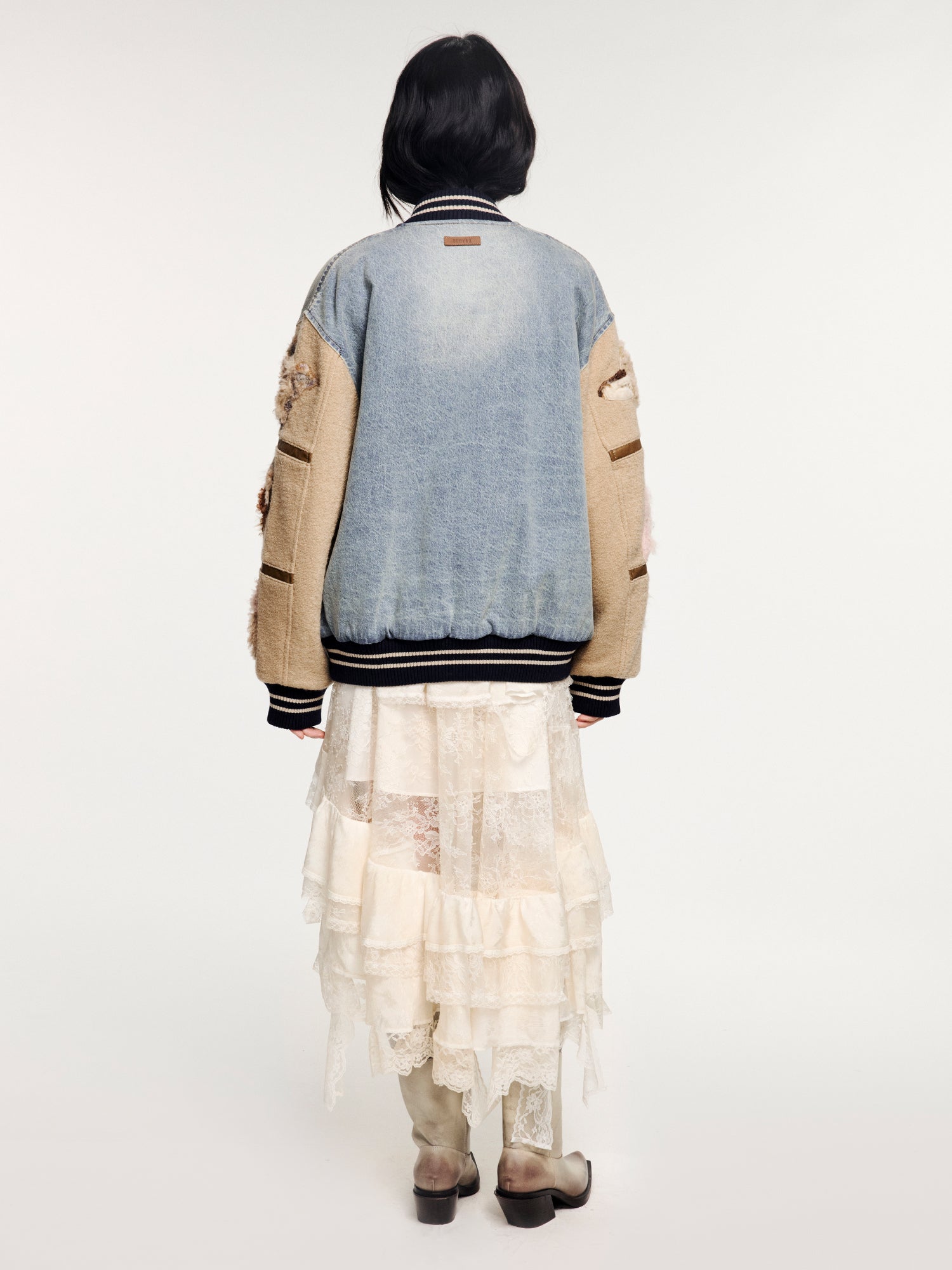 Combines washed denim, woolen fabric, and PU leather for warmth and a vintage tone. Embellished with a UY logo crafted using fine beading and embroidery techniques, enhancing a refined and luxurious feel.