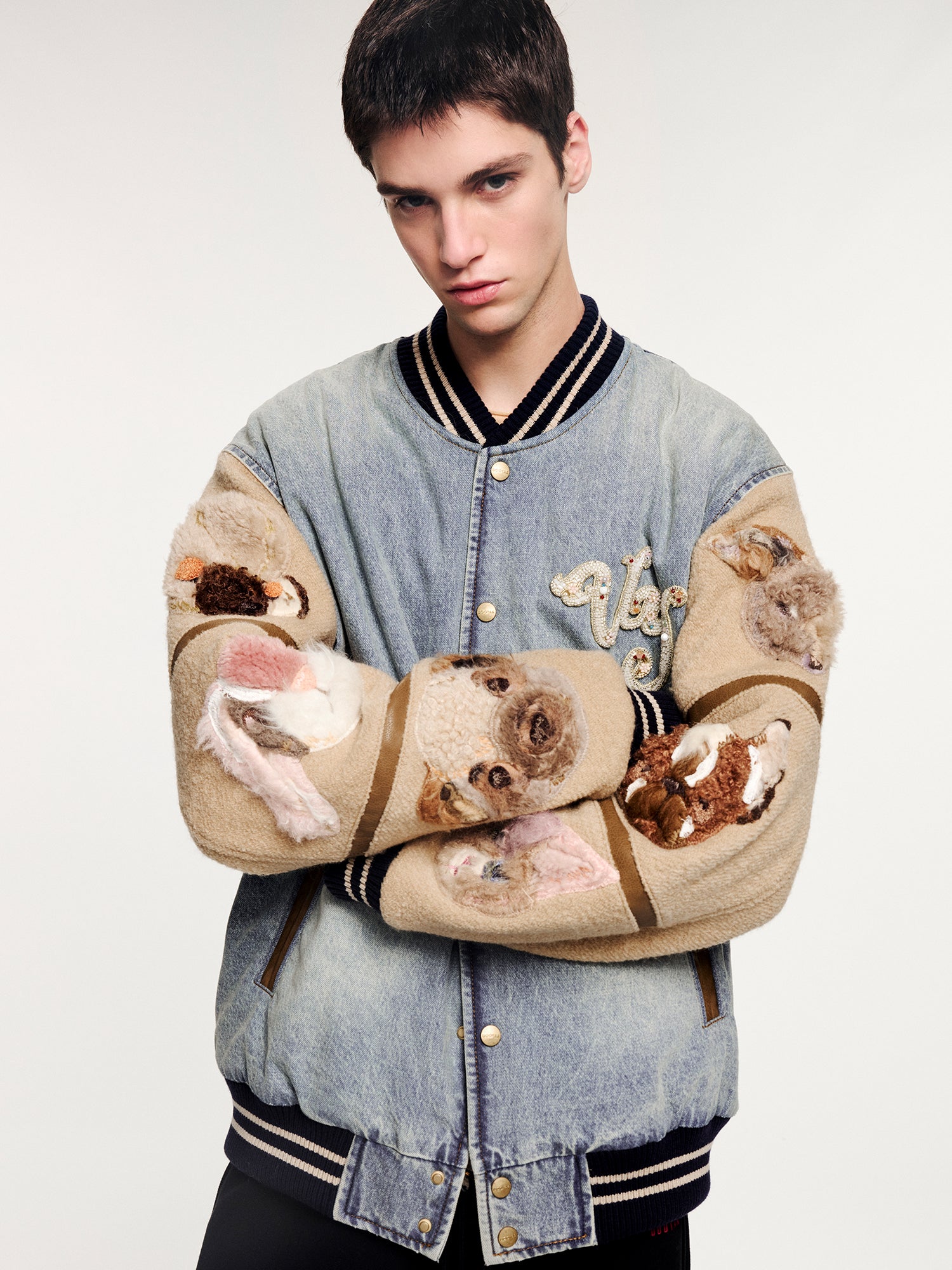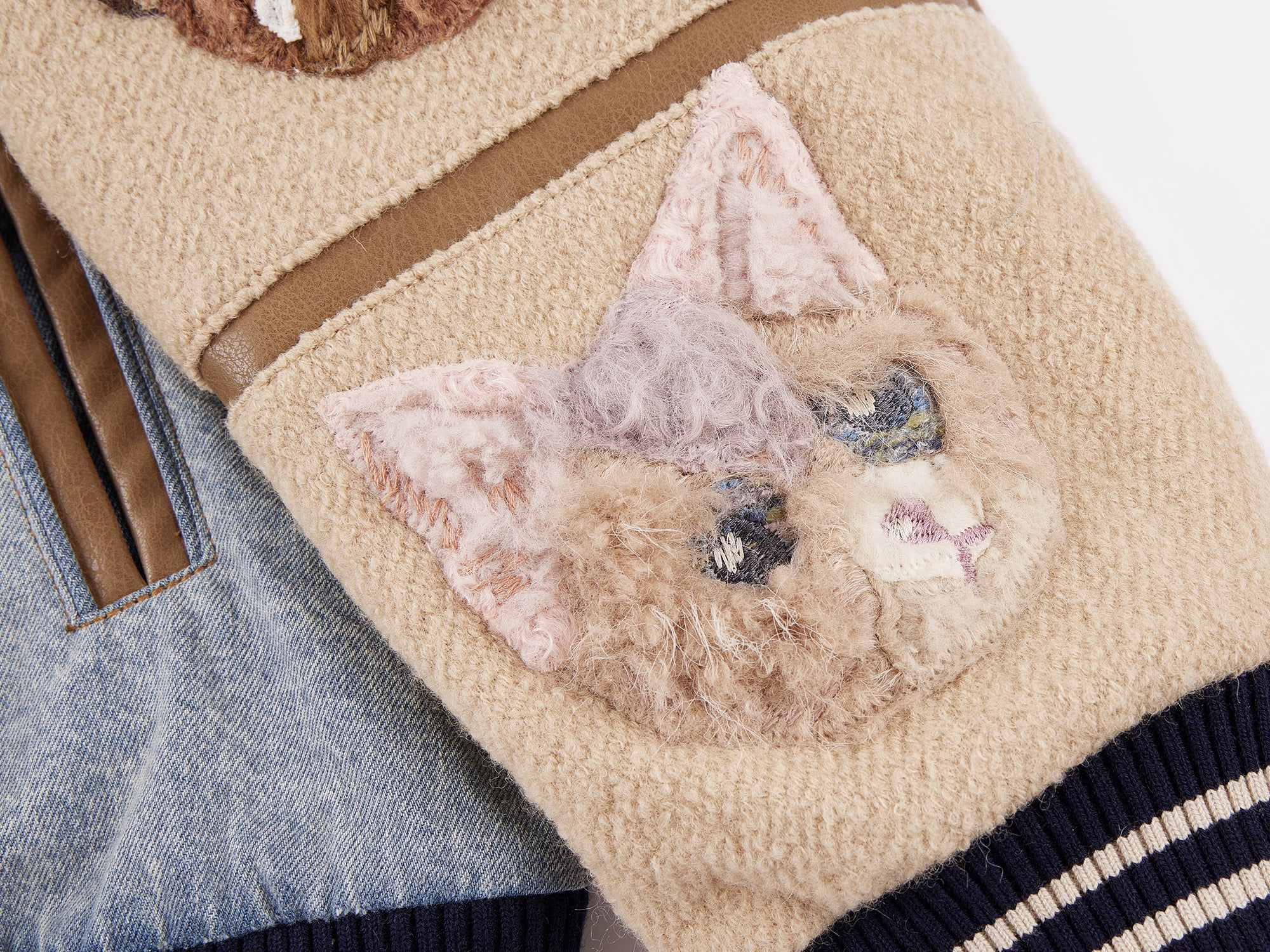 Features 46 patches of faux fur pieced together into playful elves. Finished with layered embroidery and hand-stitched details, giving this retro varsity jacket a warm, crafted feel.
