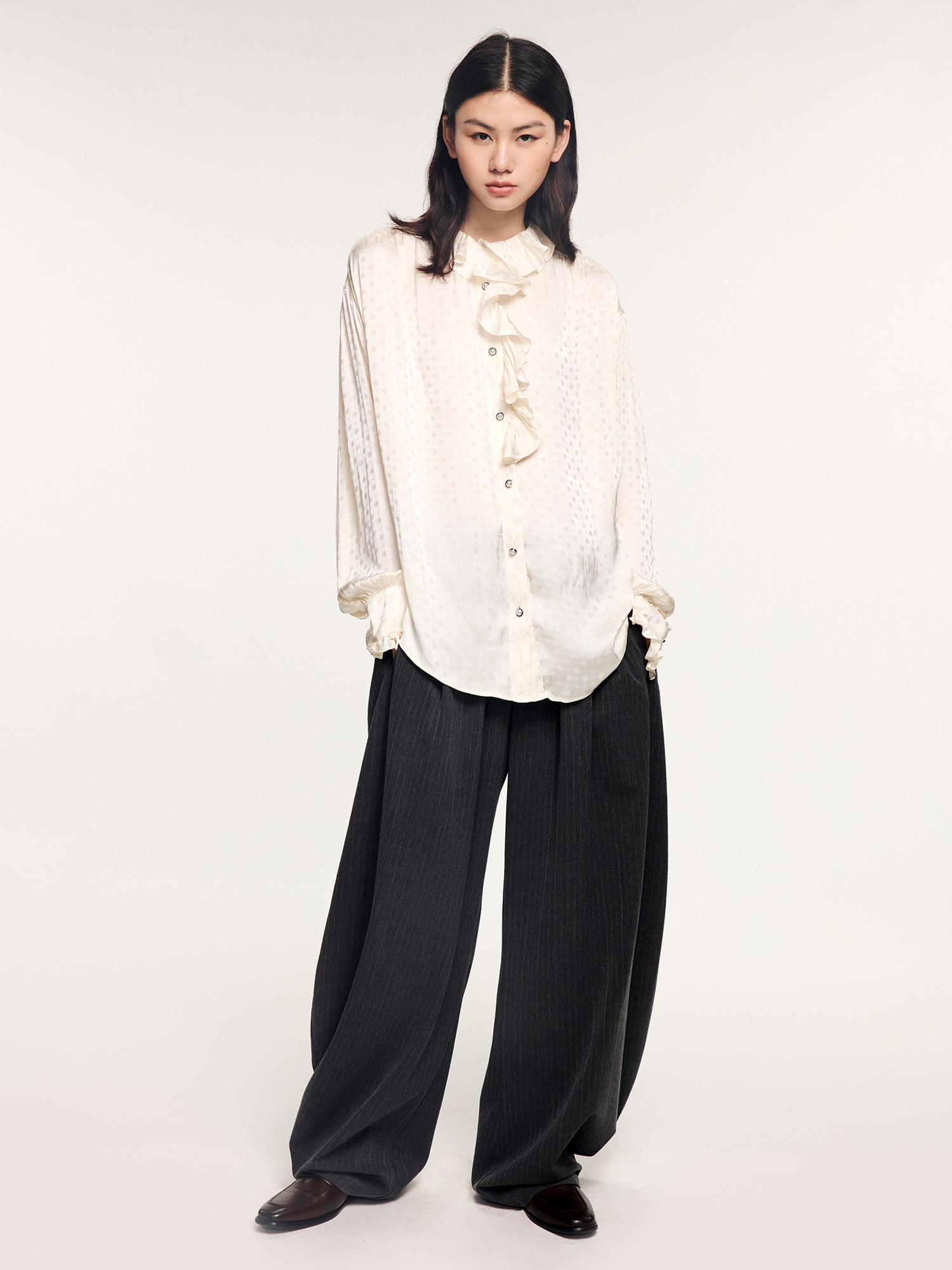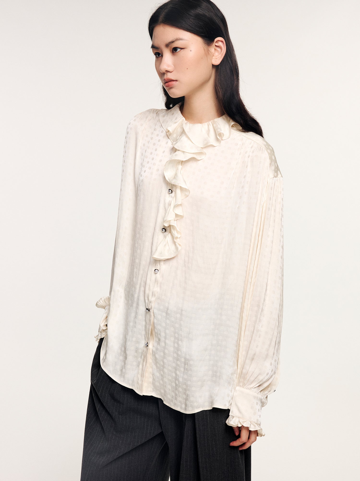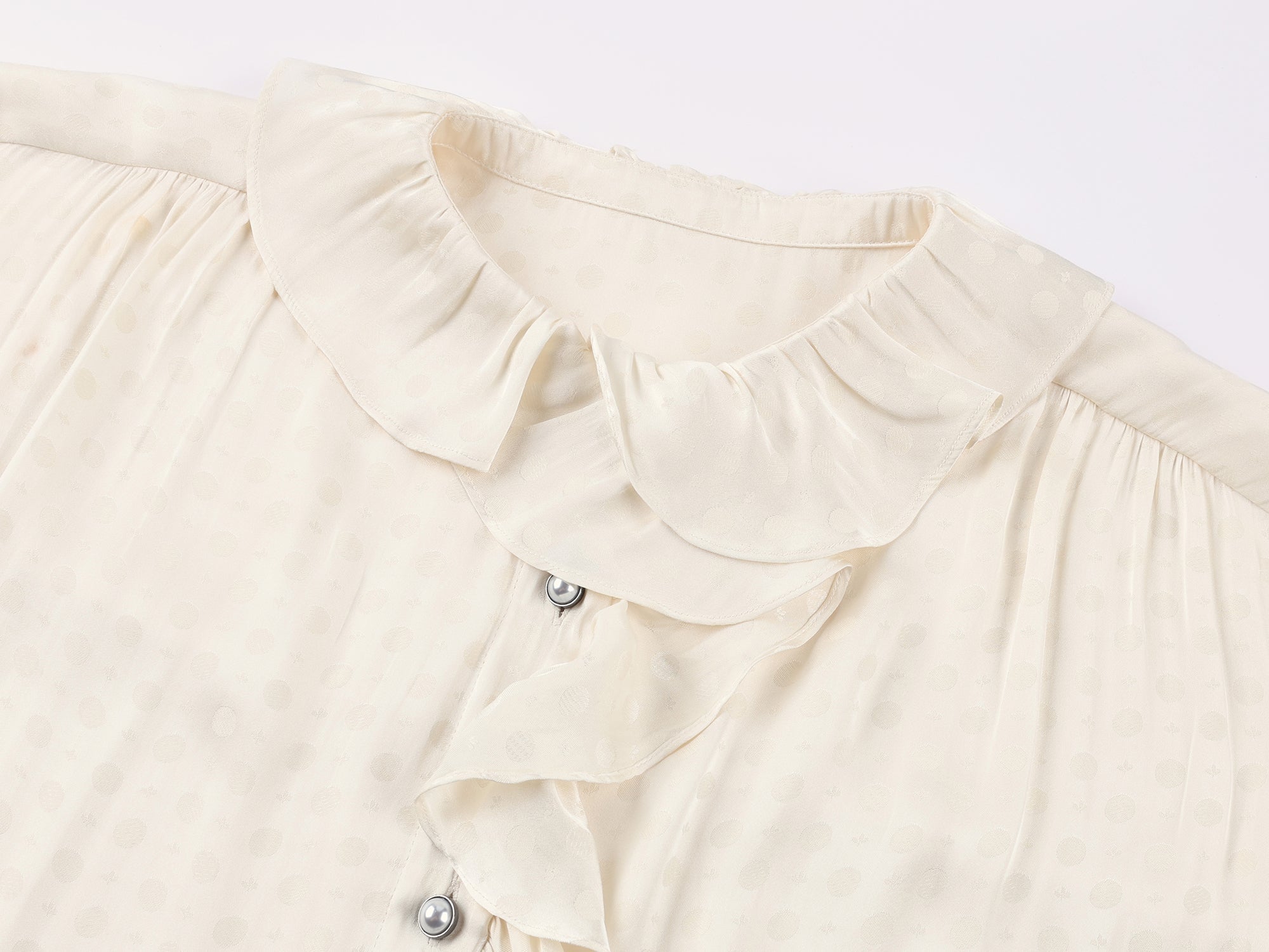 Made from polka-dot jacquard, this ruffle-collar blouse adds a whimsical tone to a classically ornate design.