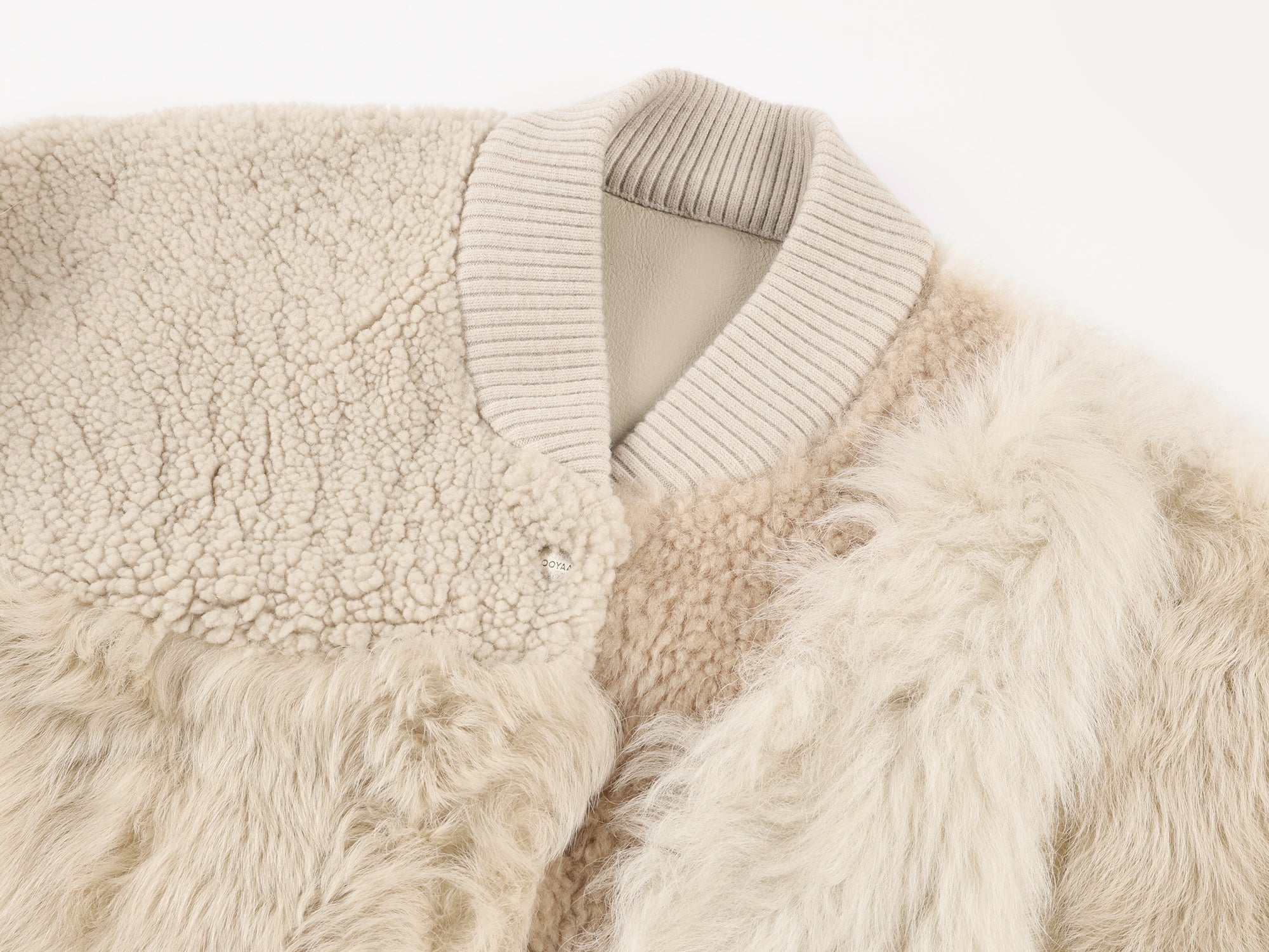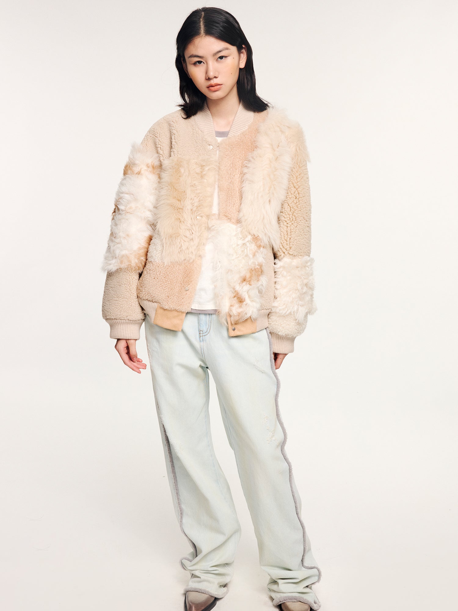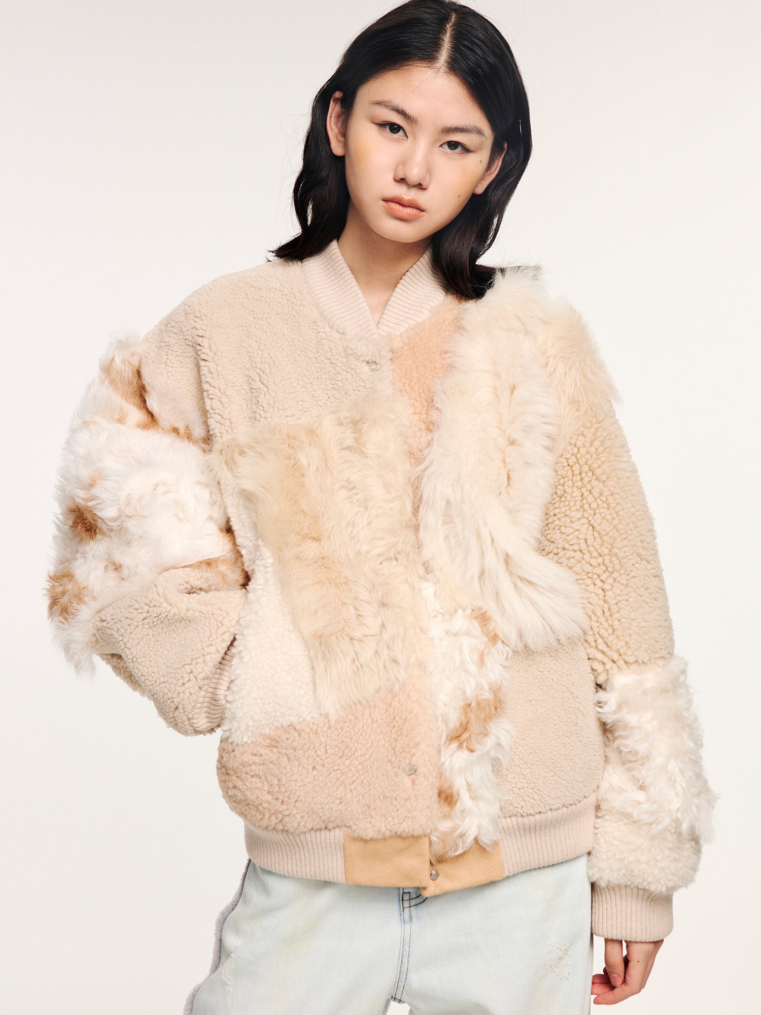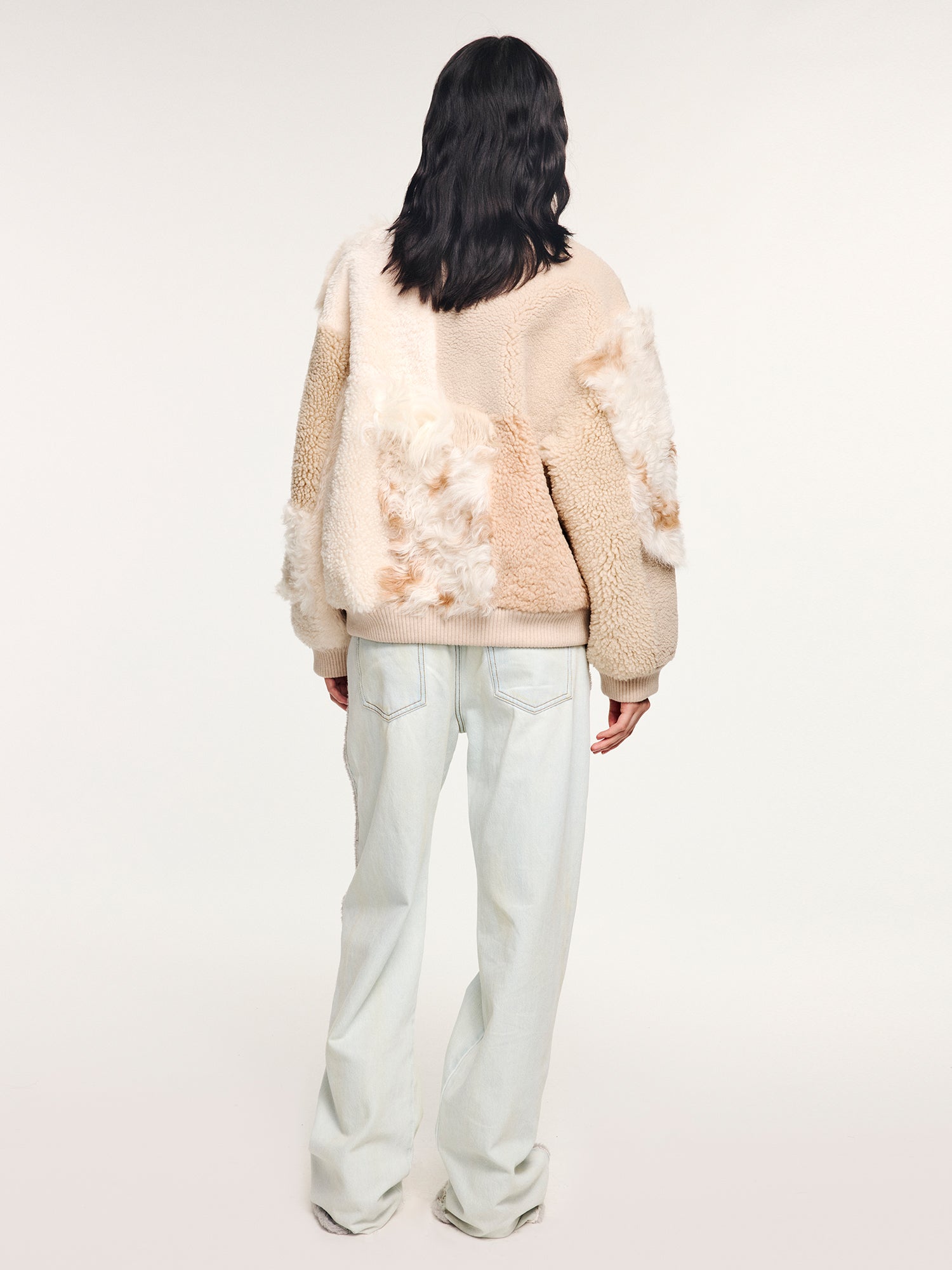Built with 12 different textures of shearling, this baseball jacket balances heavy craftsmanship with a soft, whimsical tone.