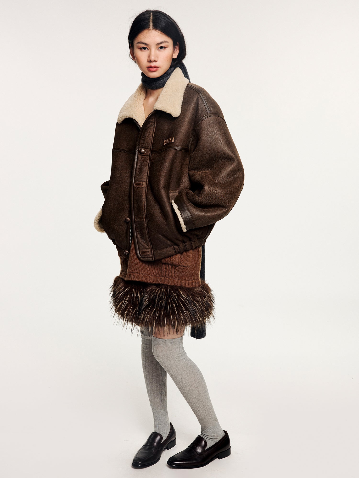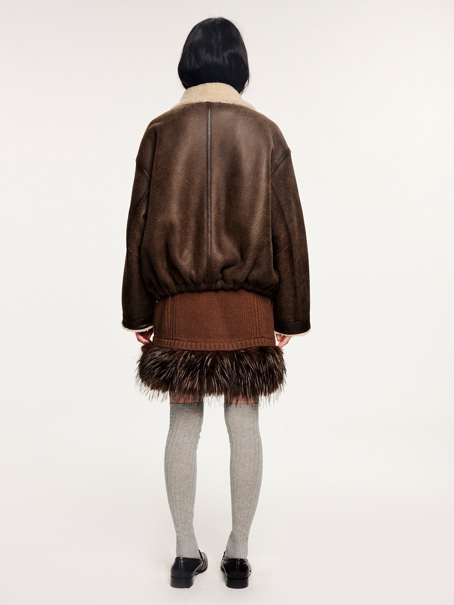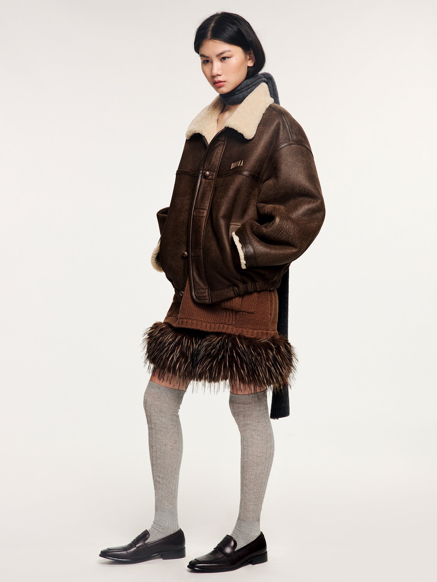 A relaxed-fit moto jacket made from Merino shearling with an O-shaped silhouette and elasticated hem¡ªwarm, substantial, and richly textured.