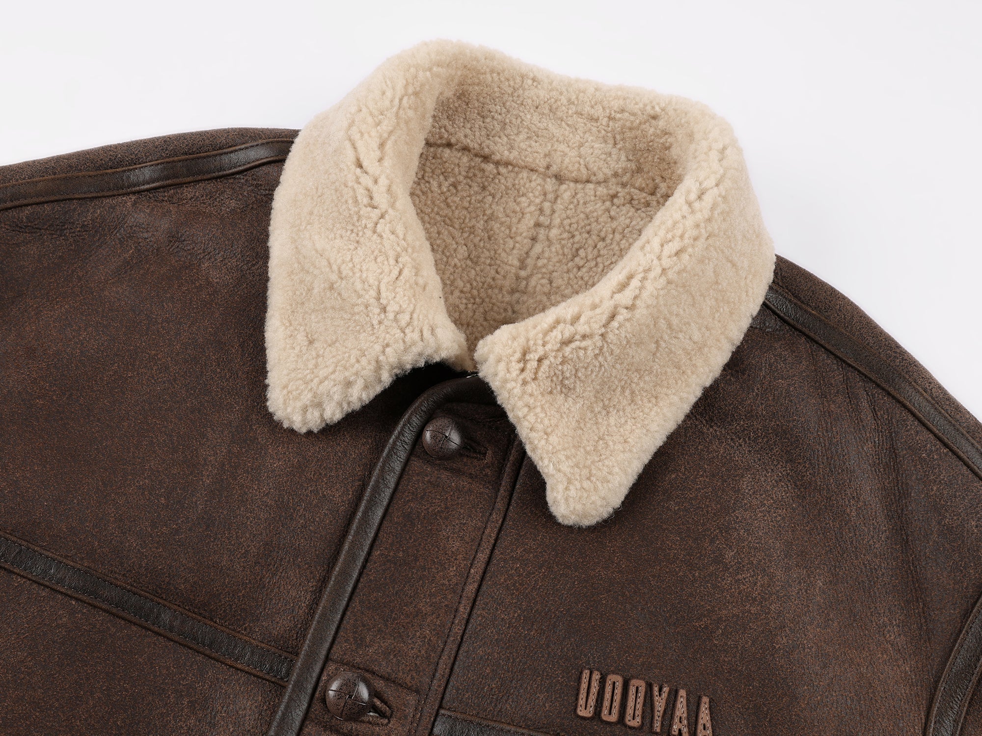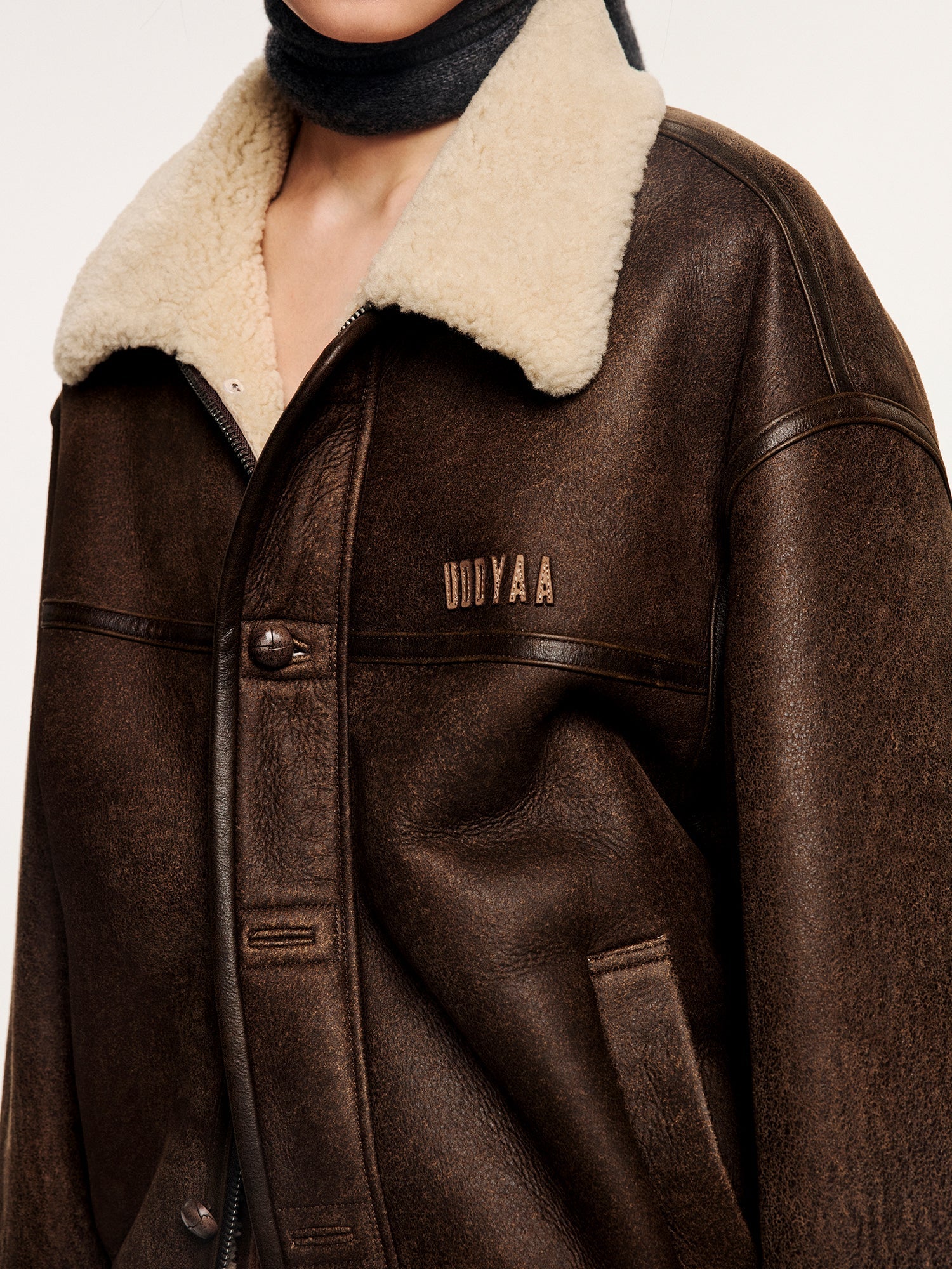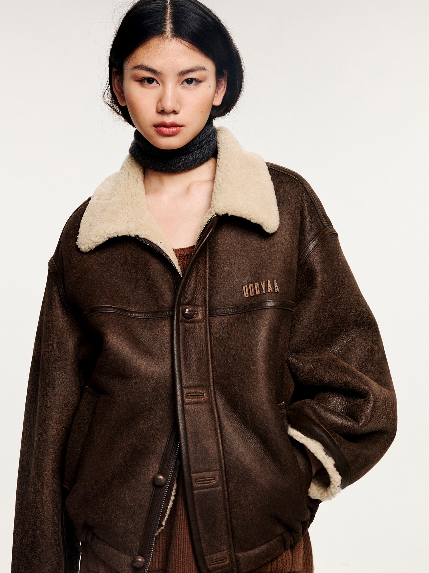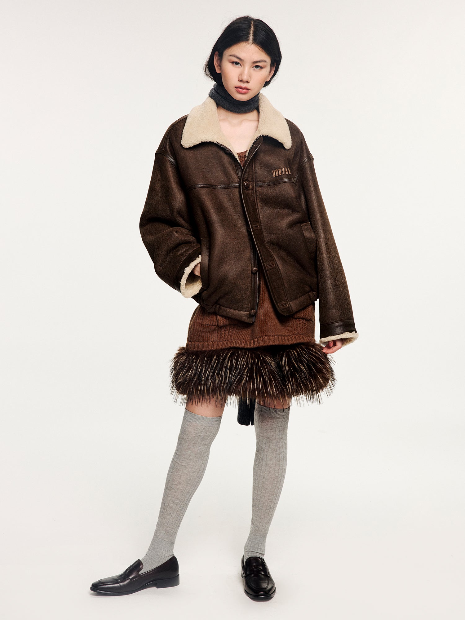 A relaxed-fit moto jacket made from Merino shearling with an O-shaped silhouette and elasticated hem¡ªwarm, substantial, and richly textured.