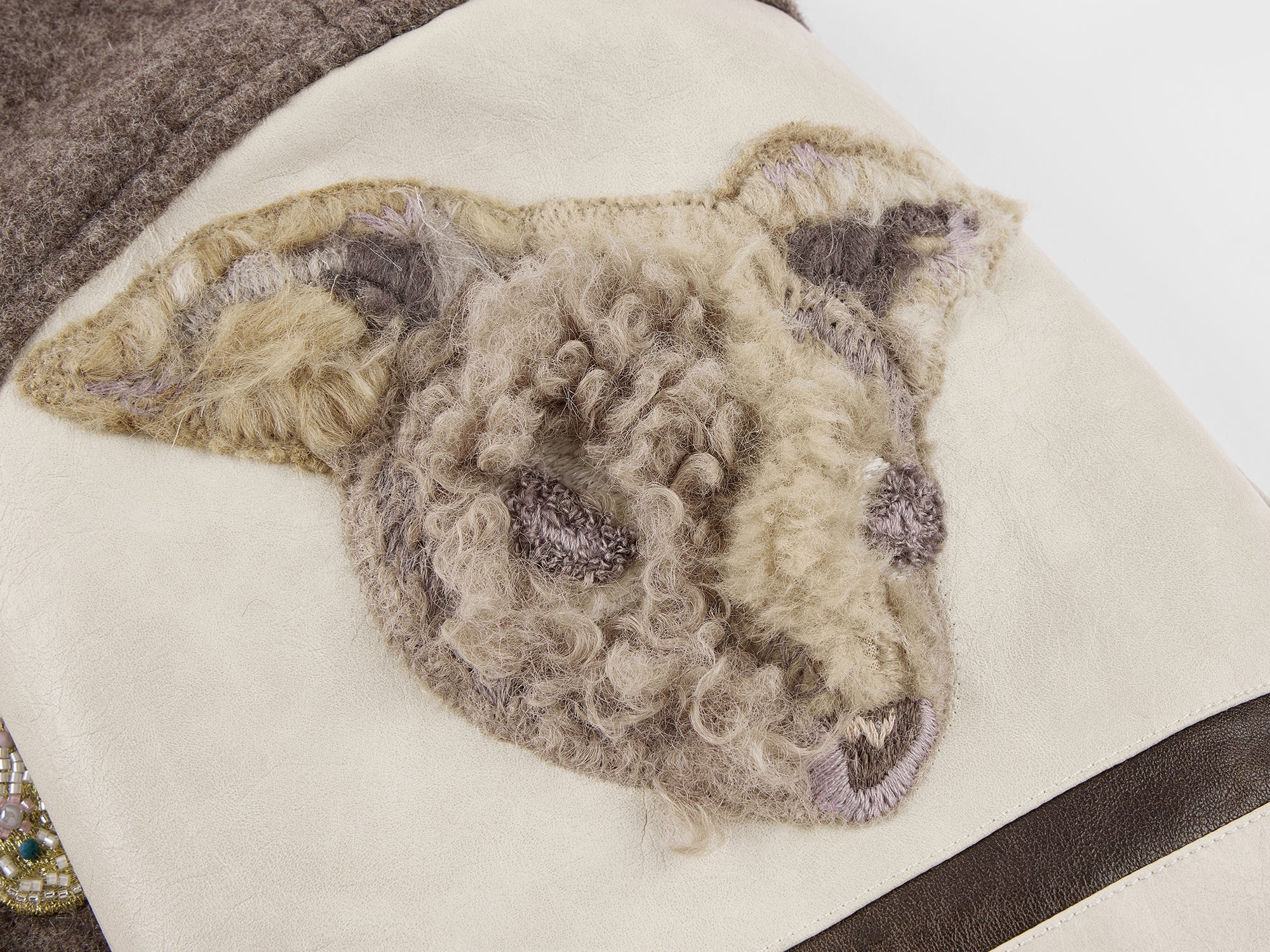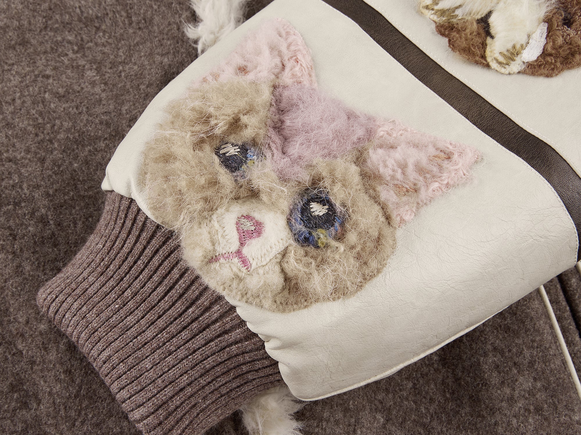 Made from 47 fur-textured patches stitched into whimsical elf forms. Detailed embroidery and hand-stitching enrich the jacket's crafted finish, softening its retro sporty edge.