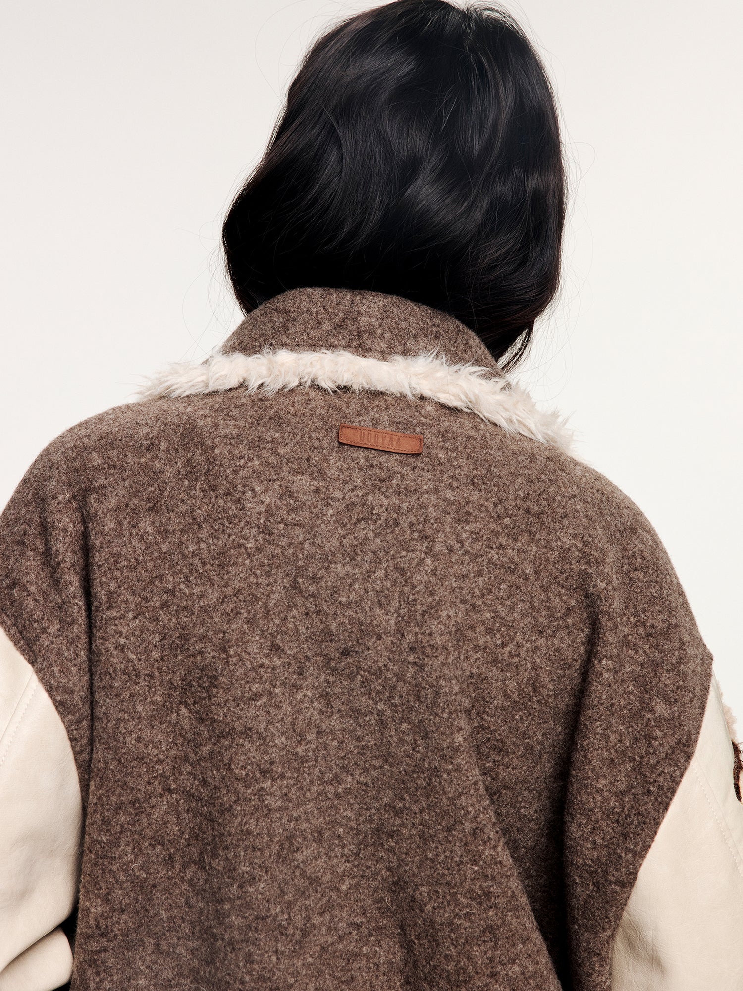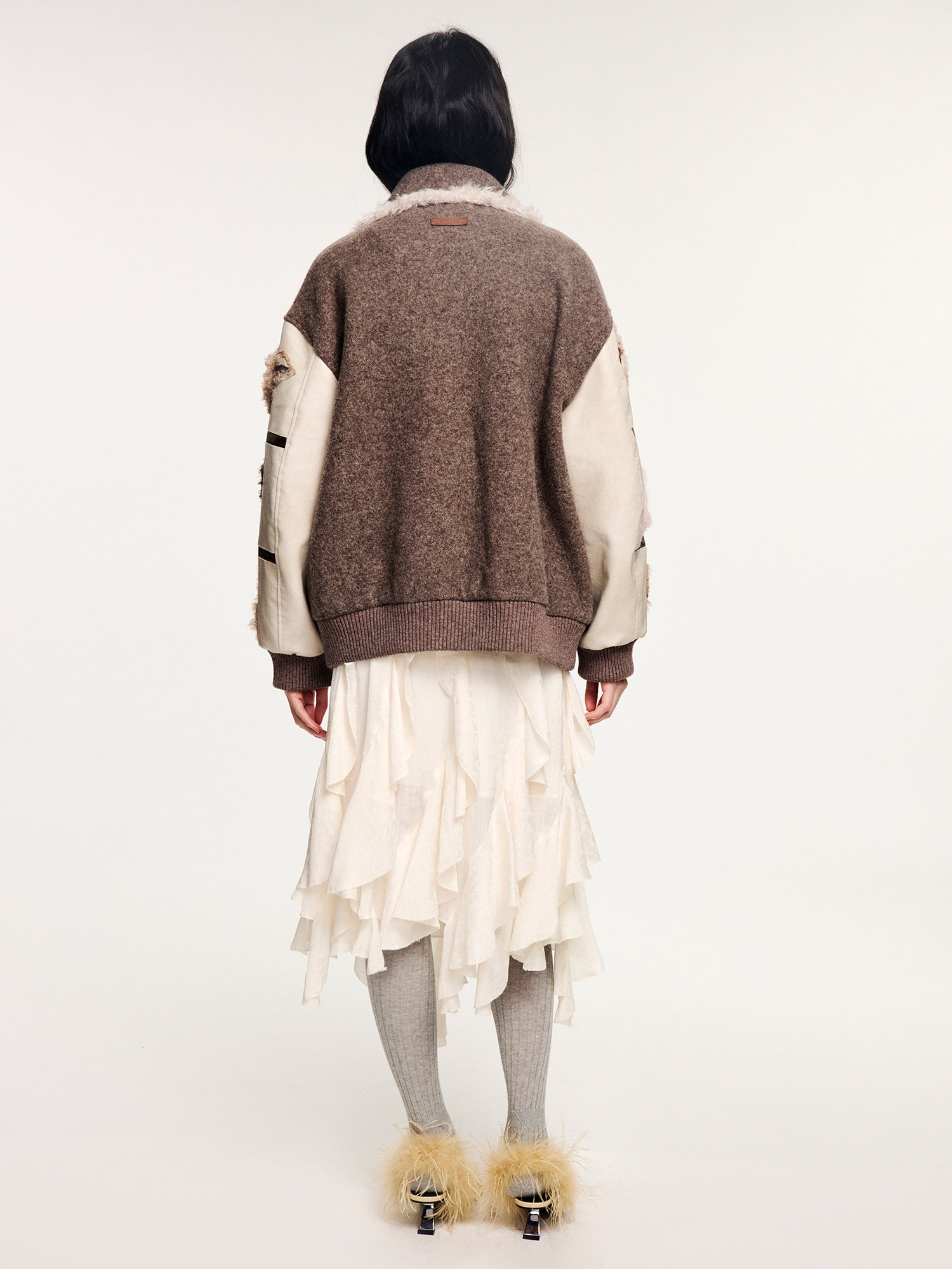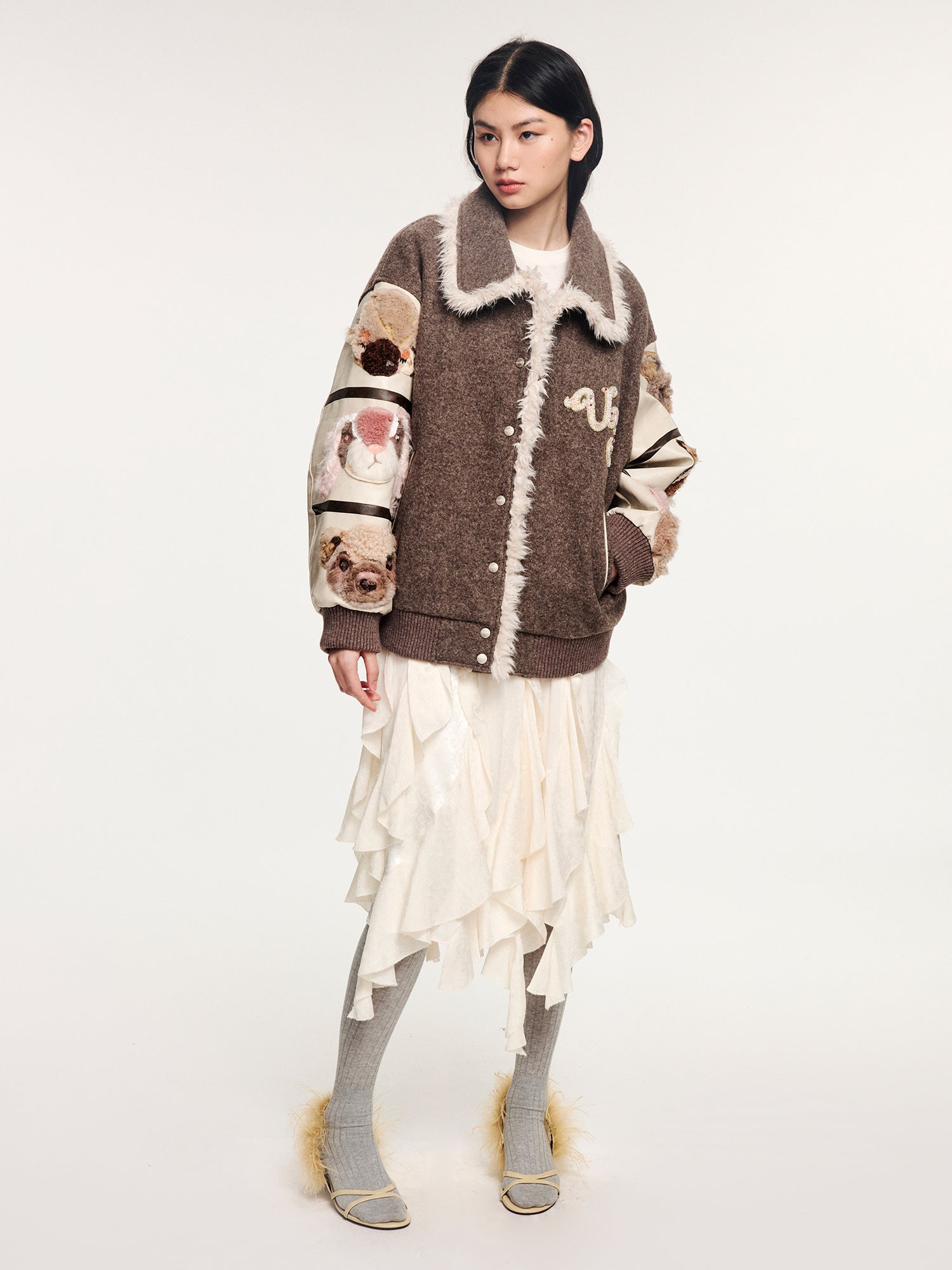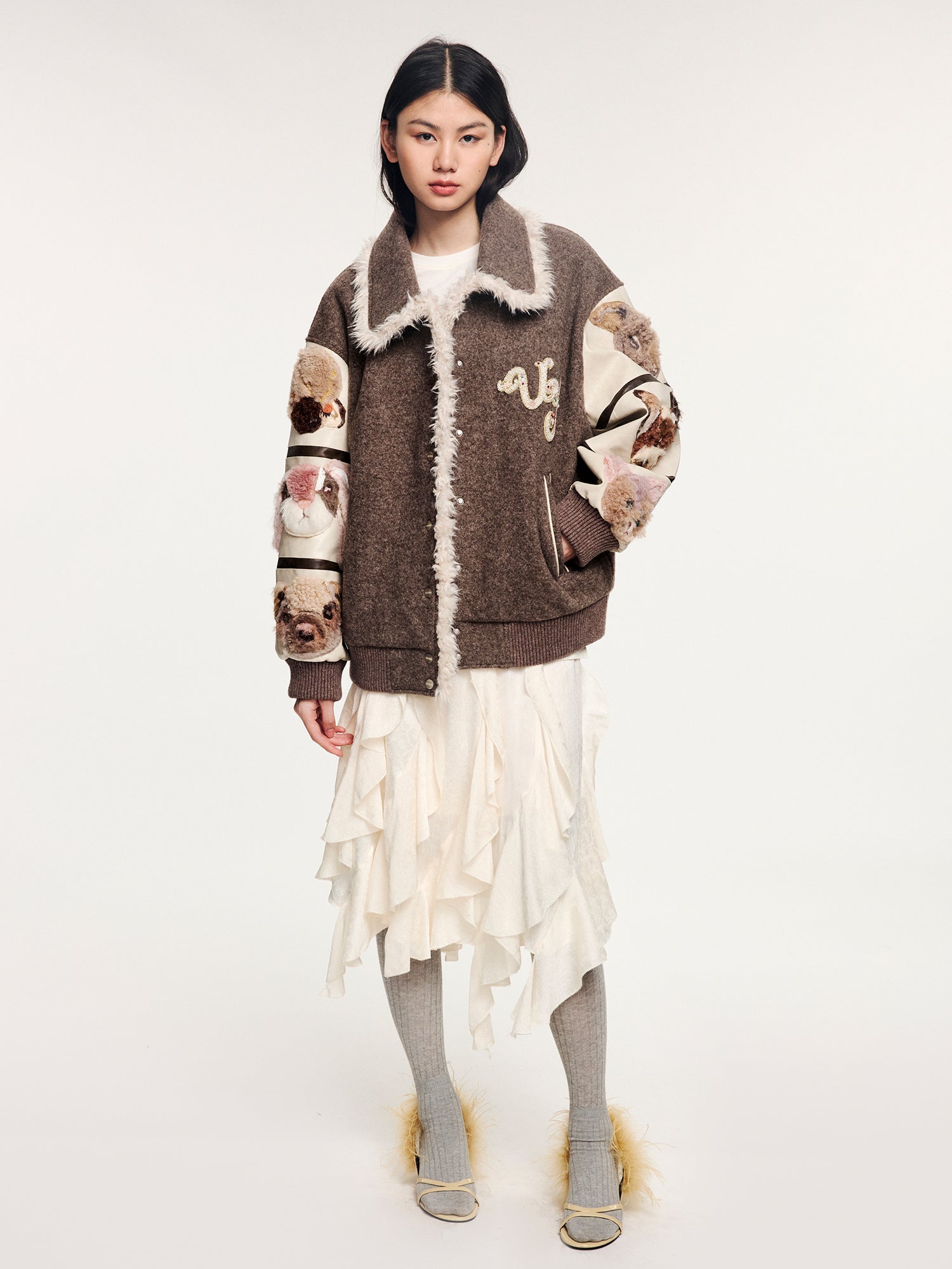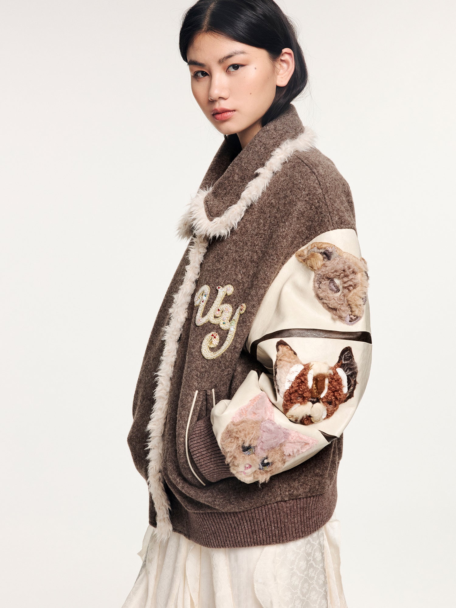 Uses woolen and PU leather in a baseball jacket style with furry trim on the edges to enhance warmth and whimsy. Embellished with the UY logo using detailed beaded embroidery for an elegant finish.