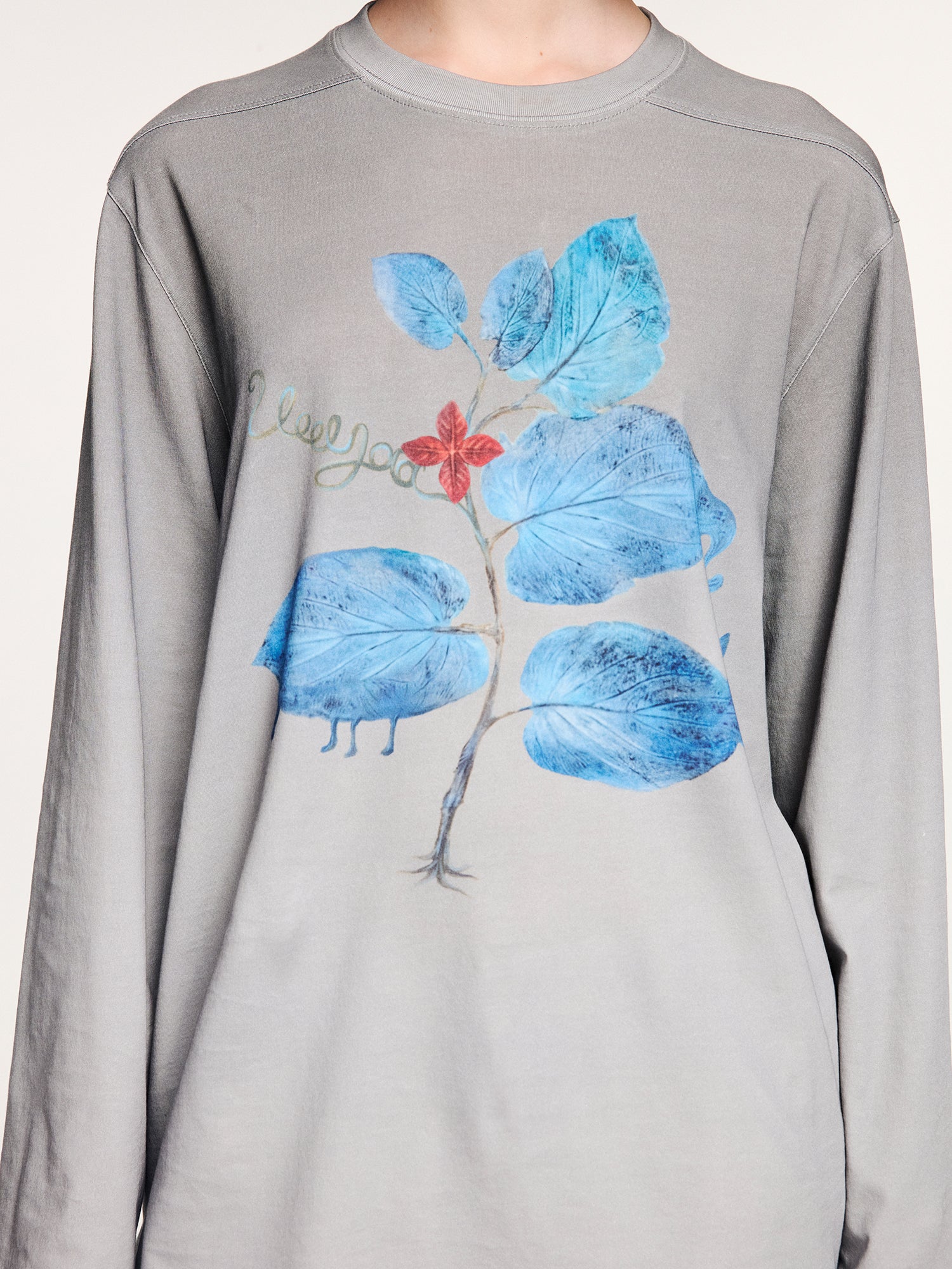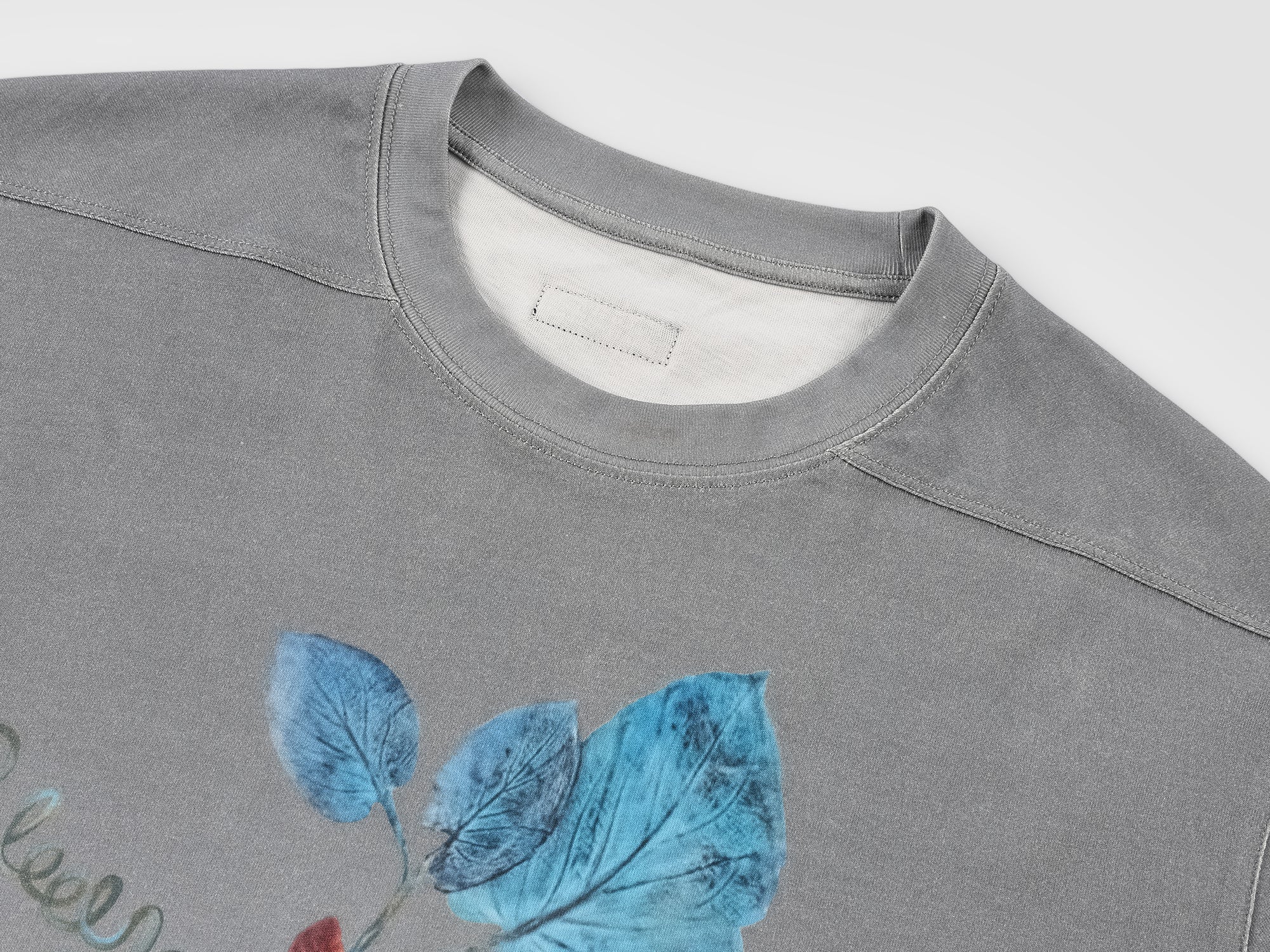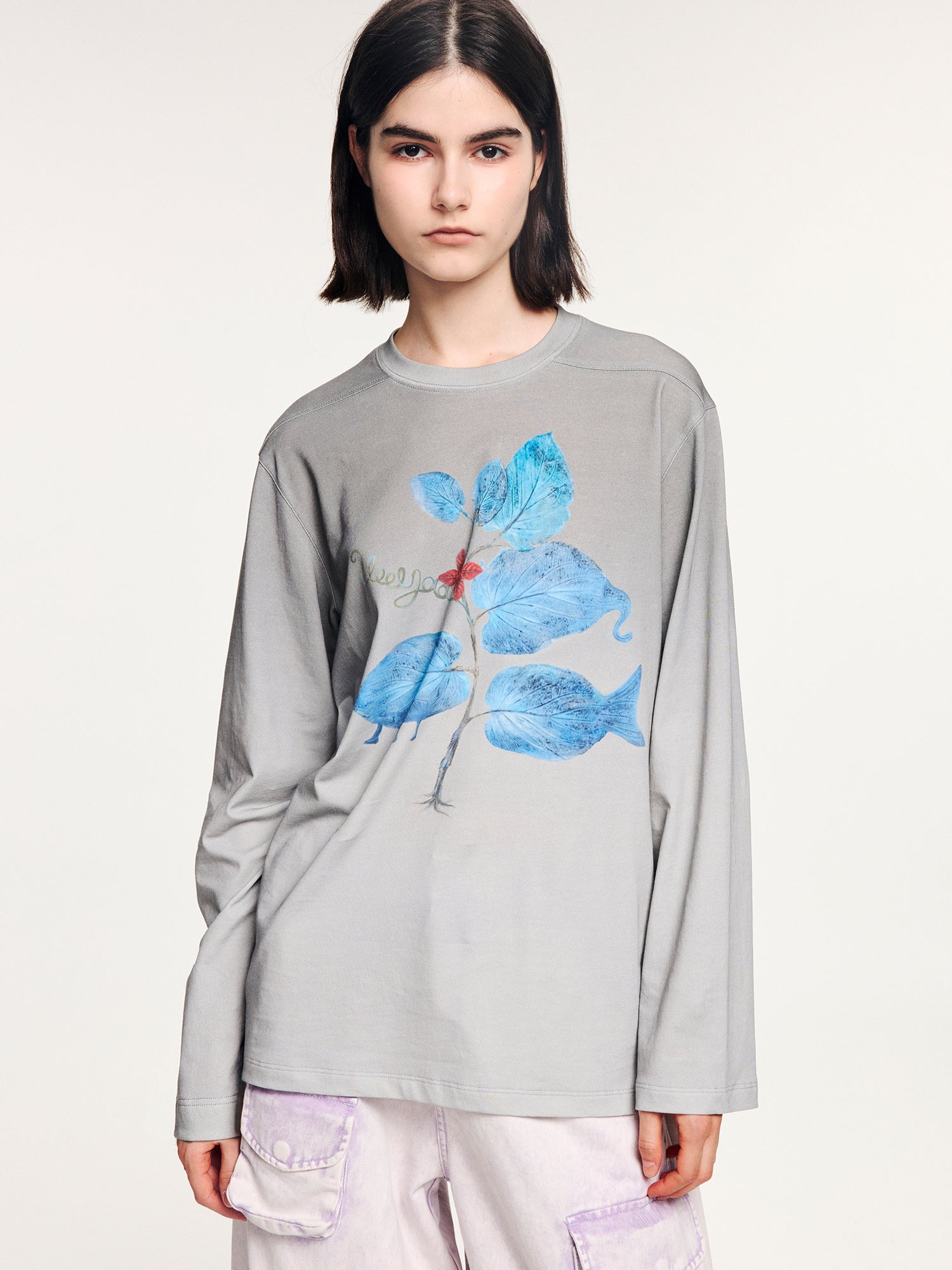 A simple long-sleeve tee with a gray gradient base, layered with surreal leaf prints that add a touch of fantasy and artistic flair.