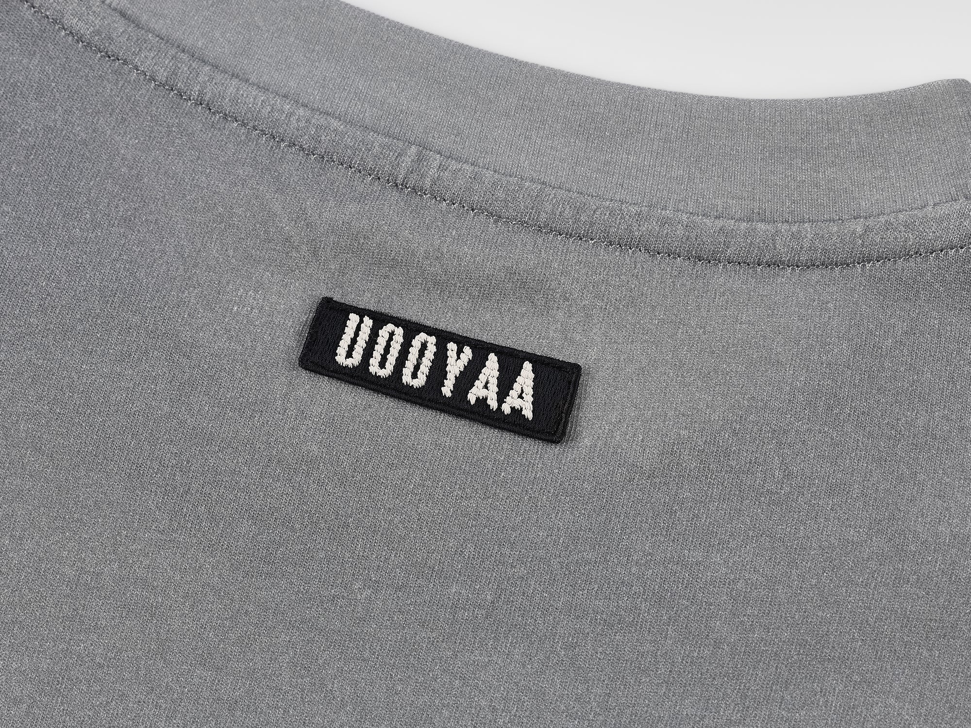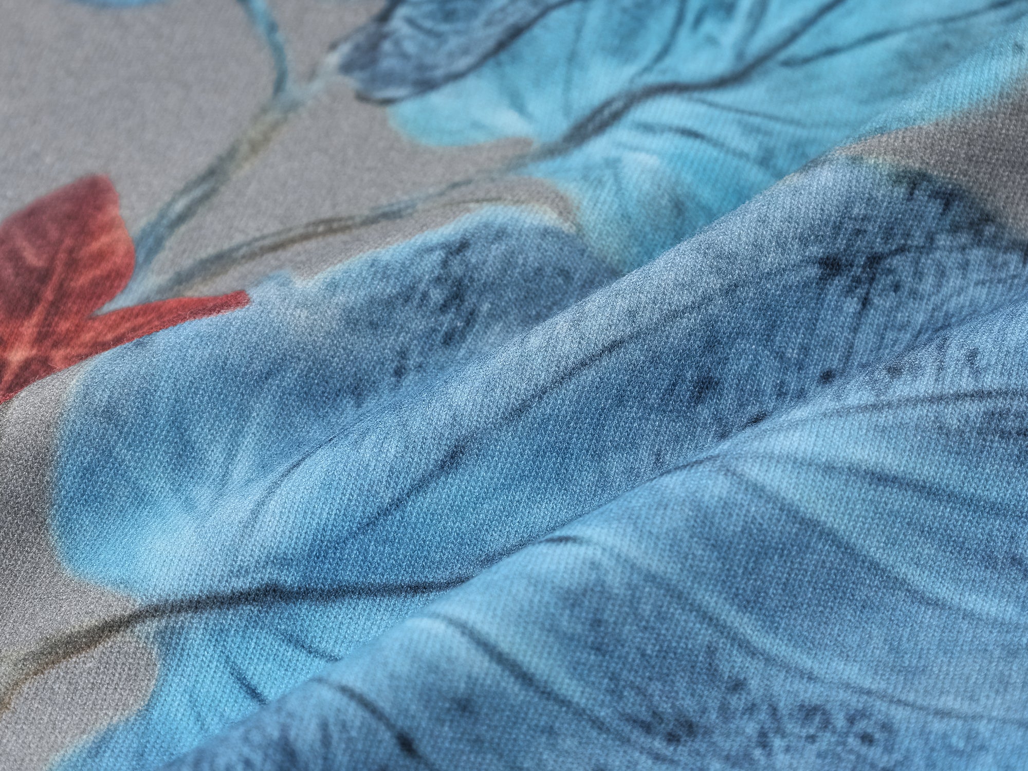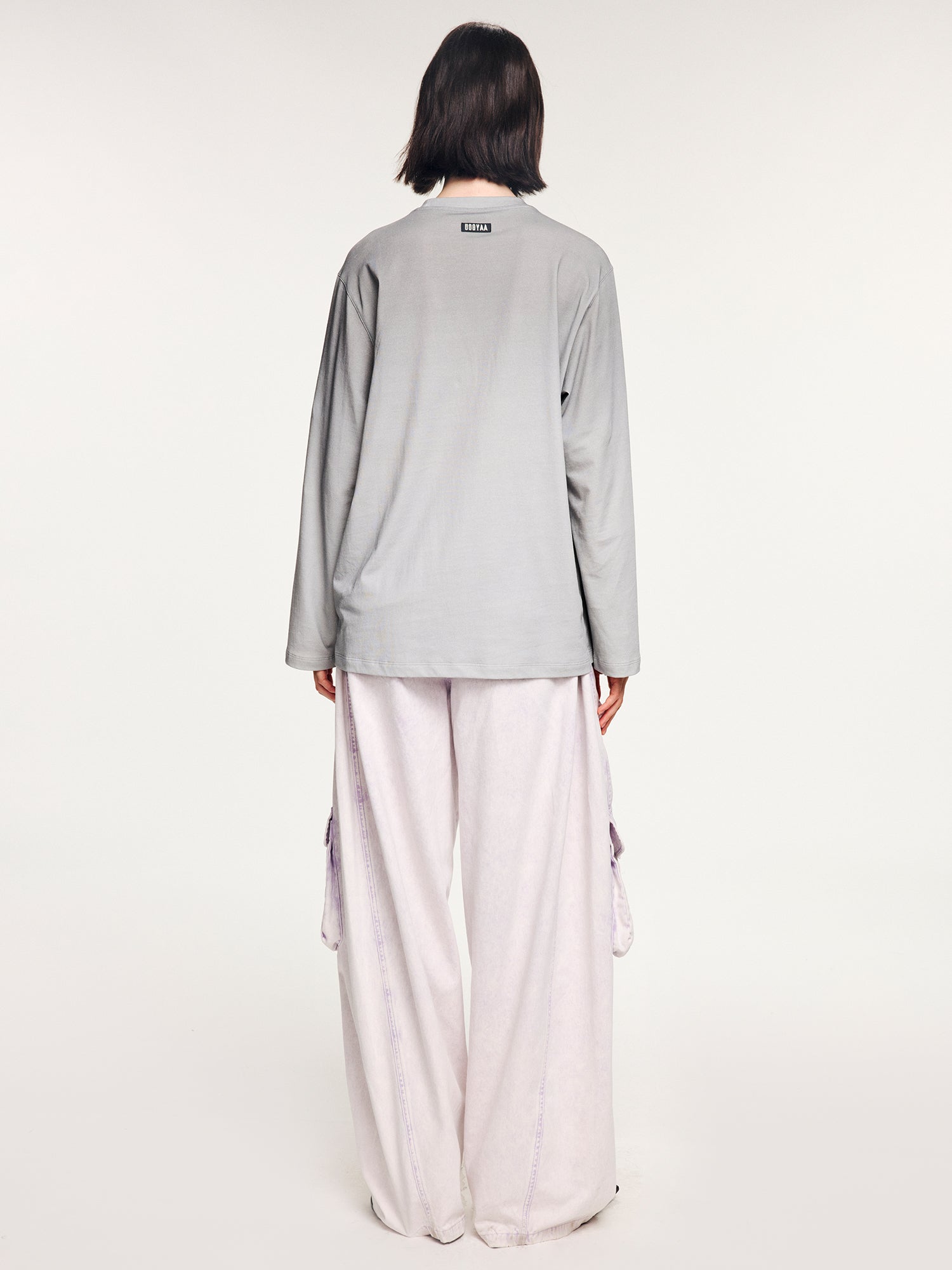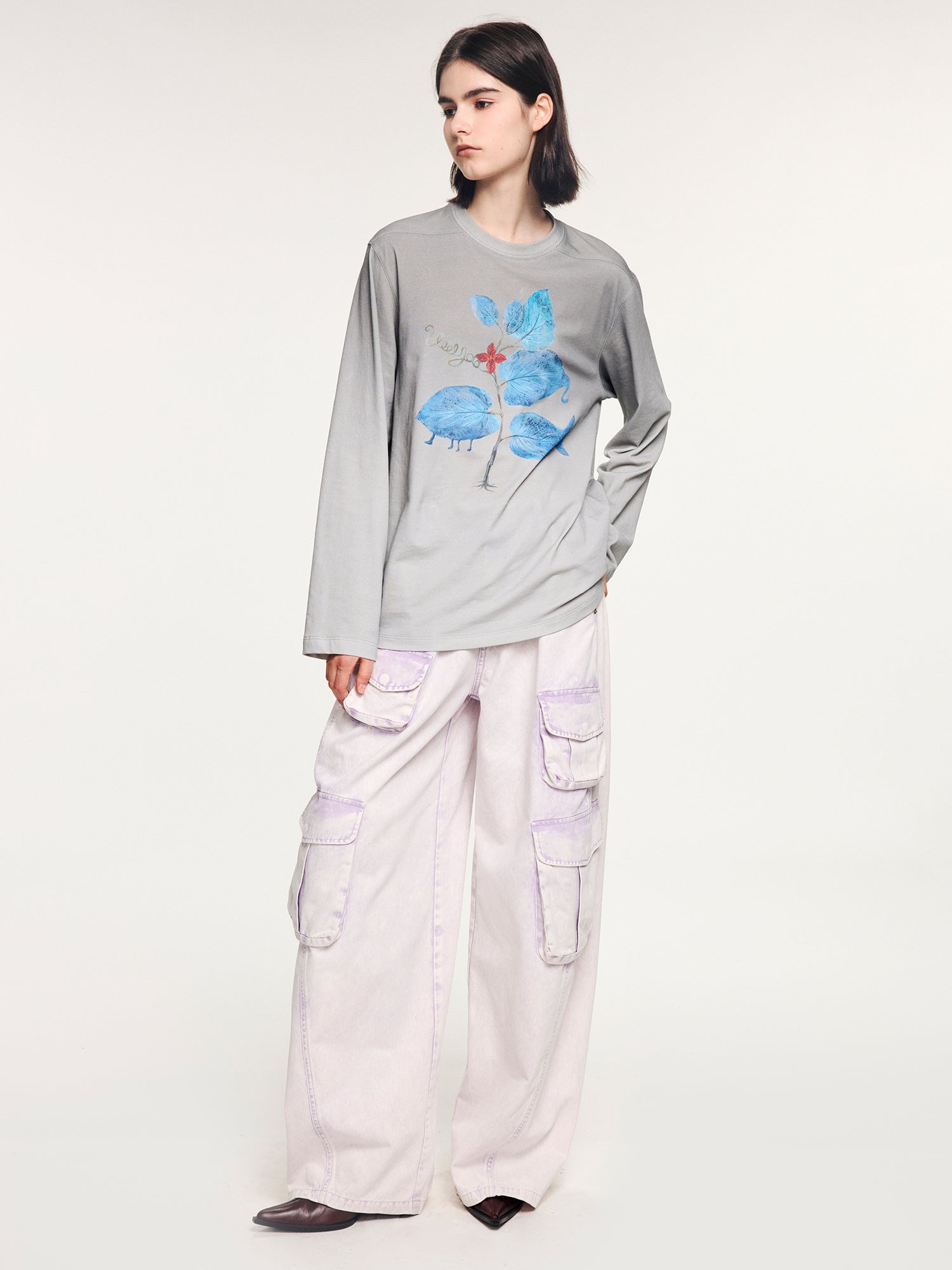 A simple long-sleeve tee with a gray gradient base, layered with surreal leaf prints that add a touch of fantasy and artistic flair.