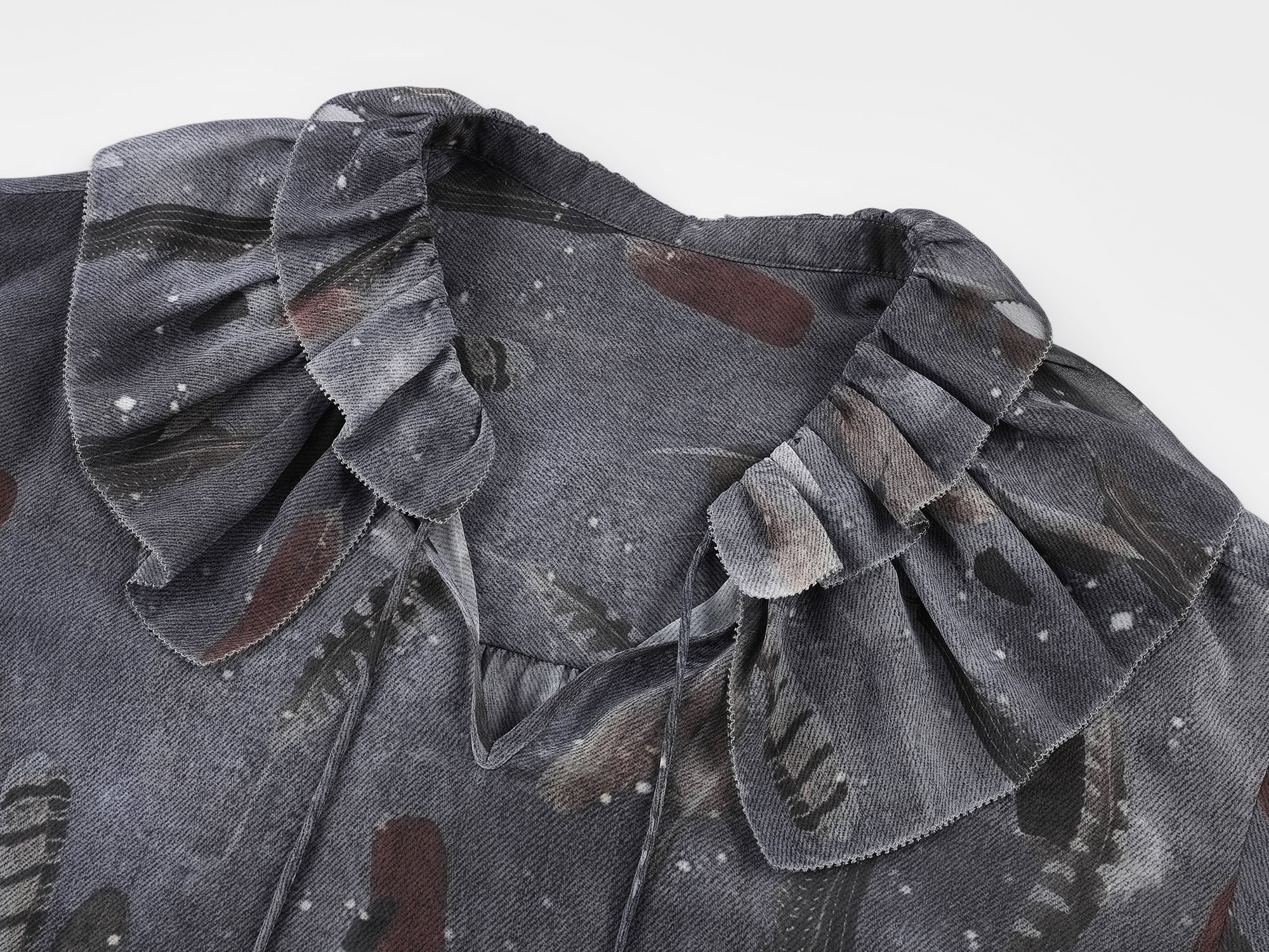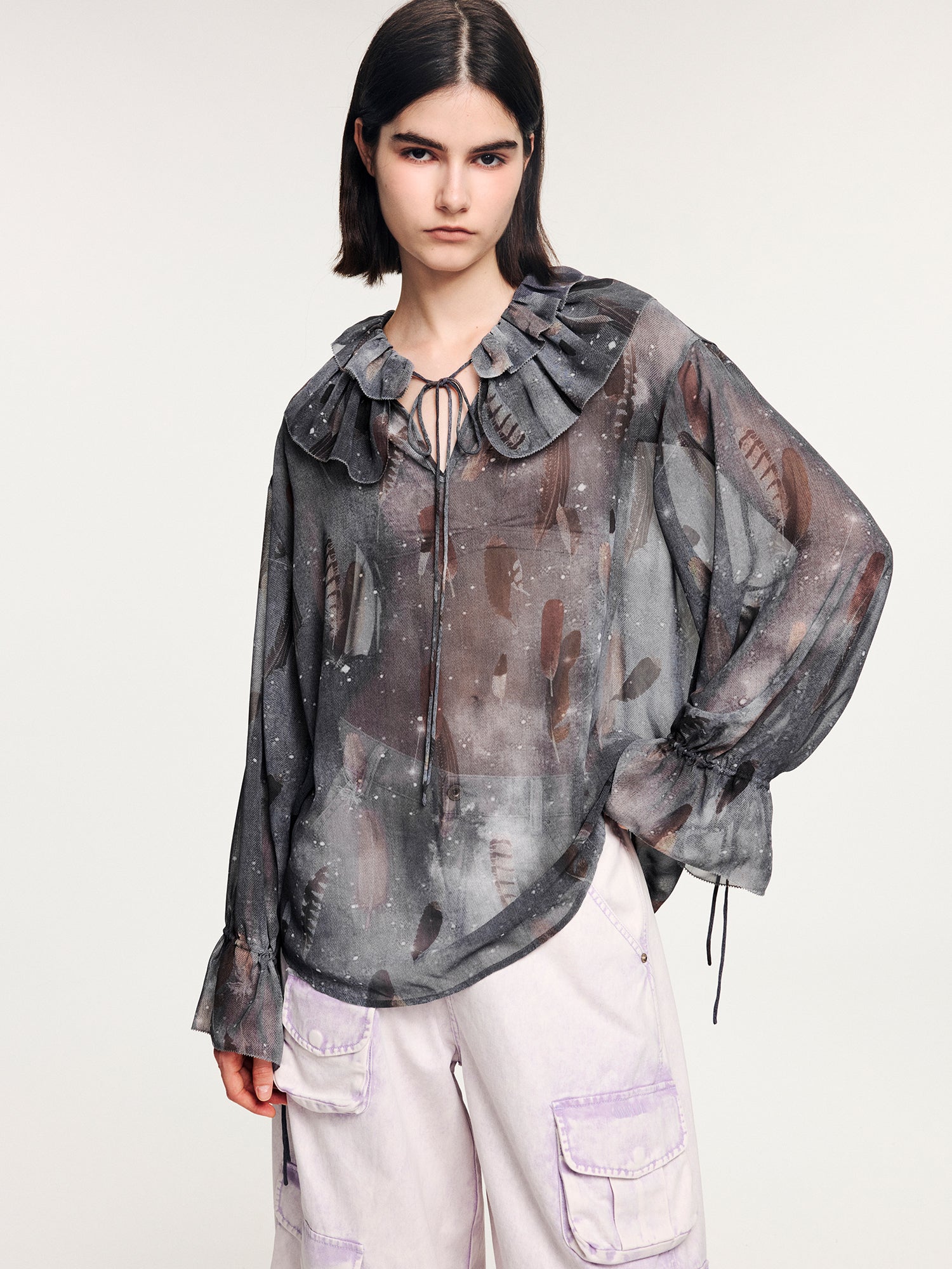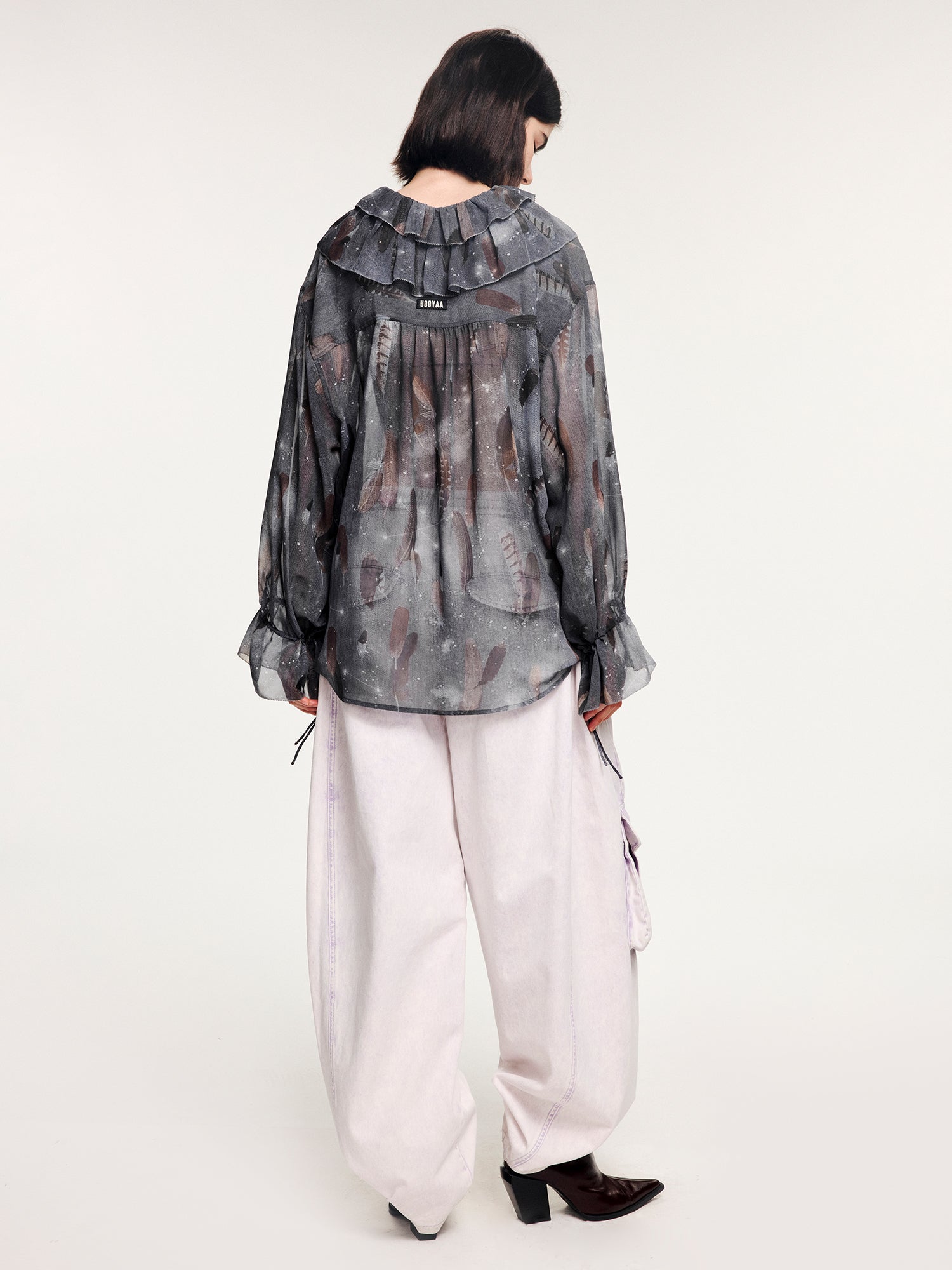 Surreal feathers meet vintage ruffles in a shirt that's steeped in a dreamy, mysterious mood.