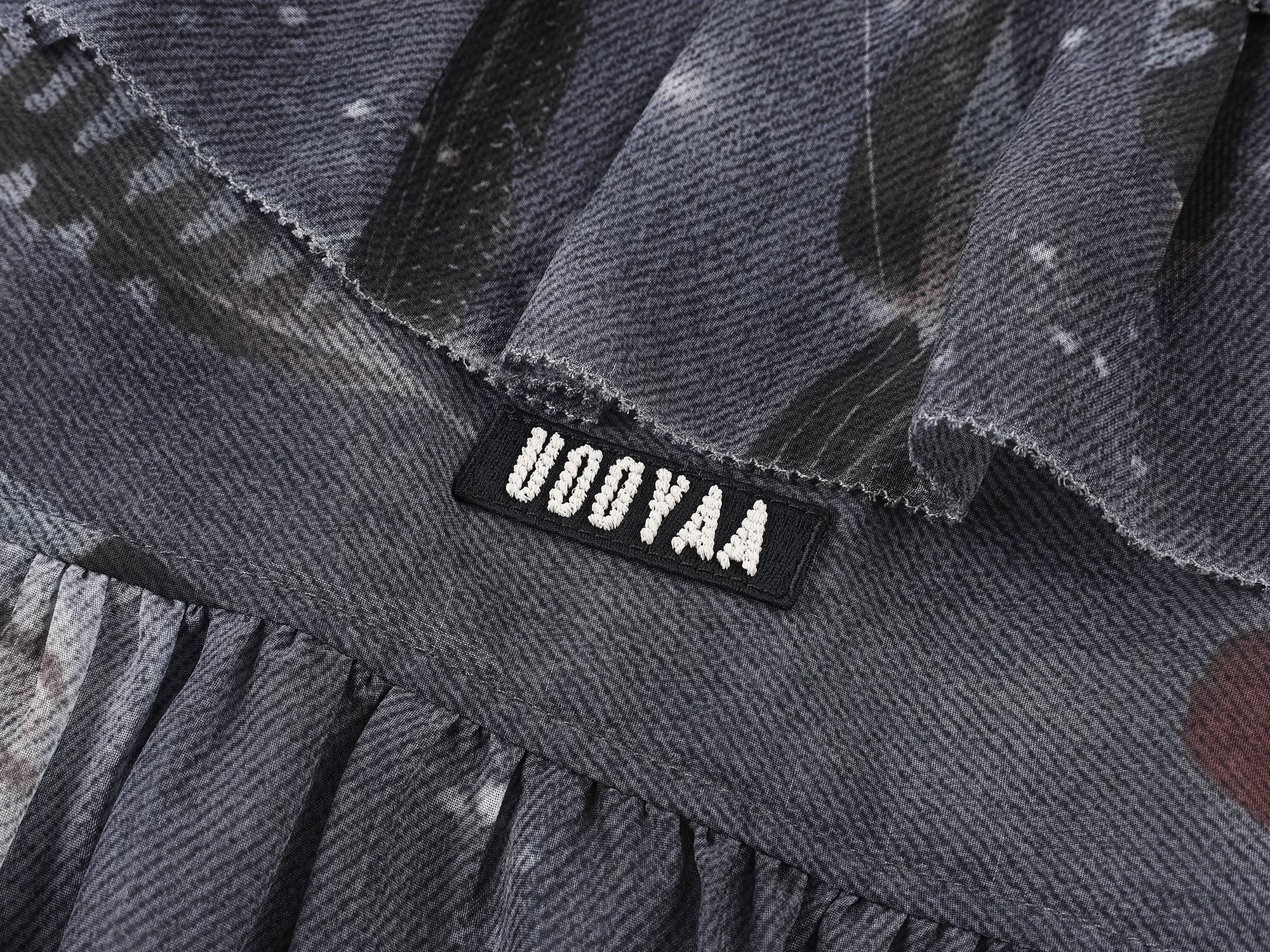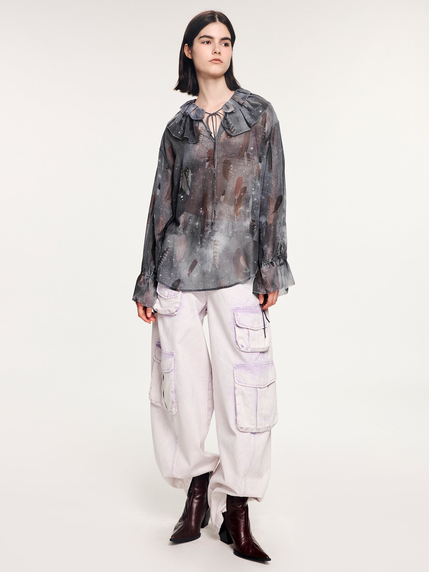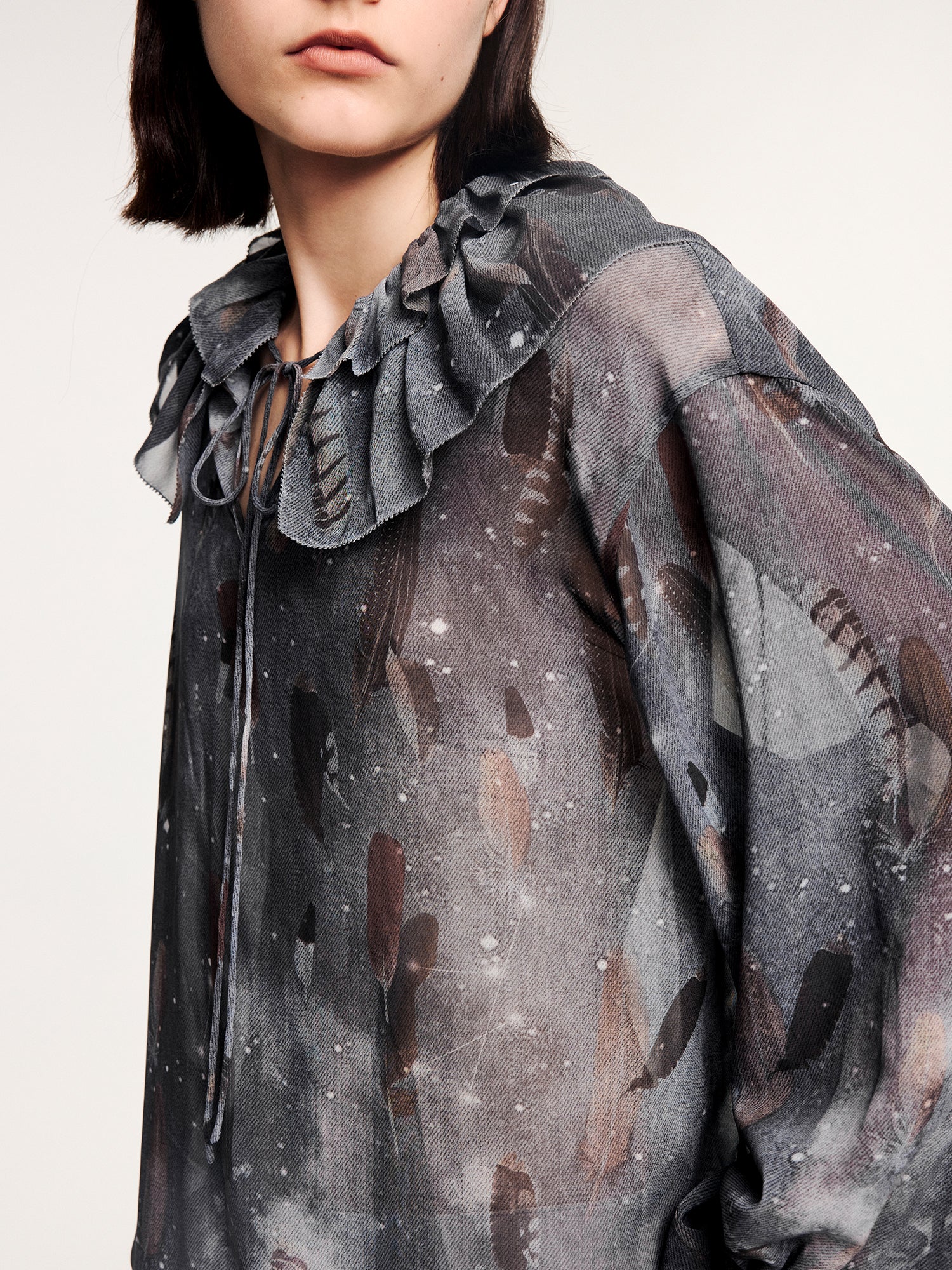 Surreal feathers meet vintage ruffles in a shirt that's steeped in a dreamy, mysterious mood.