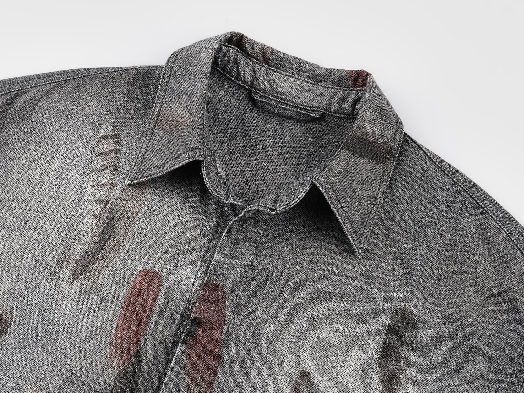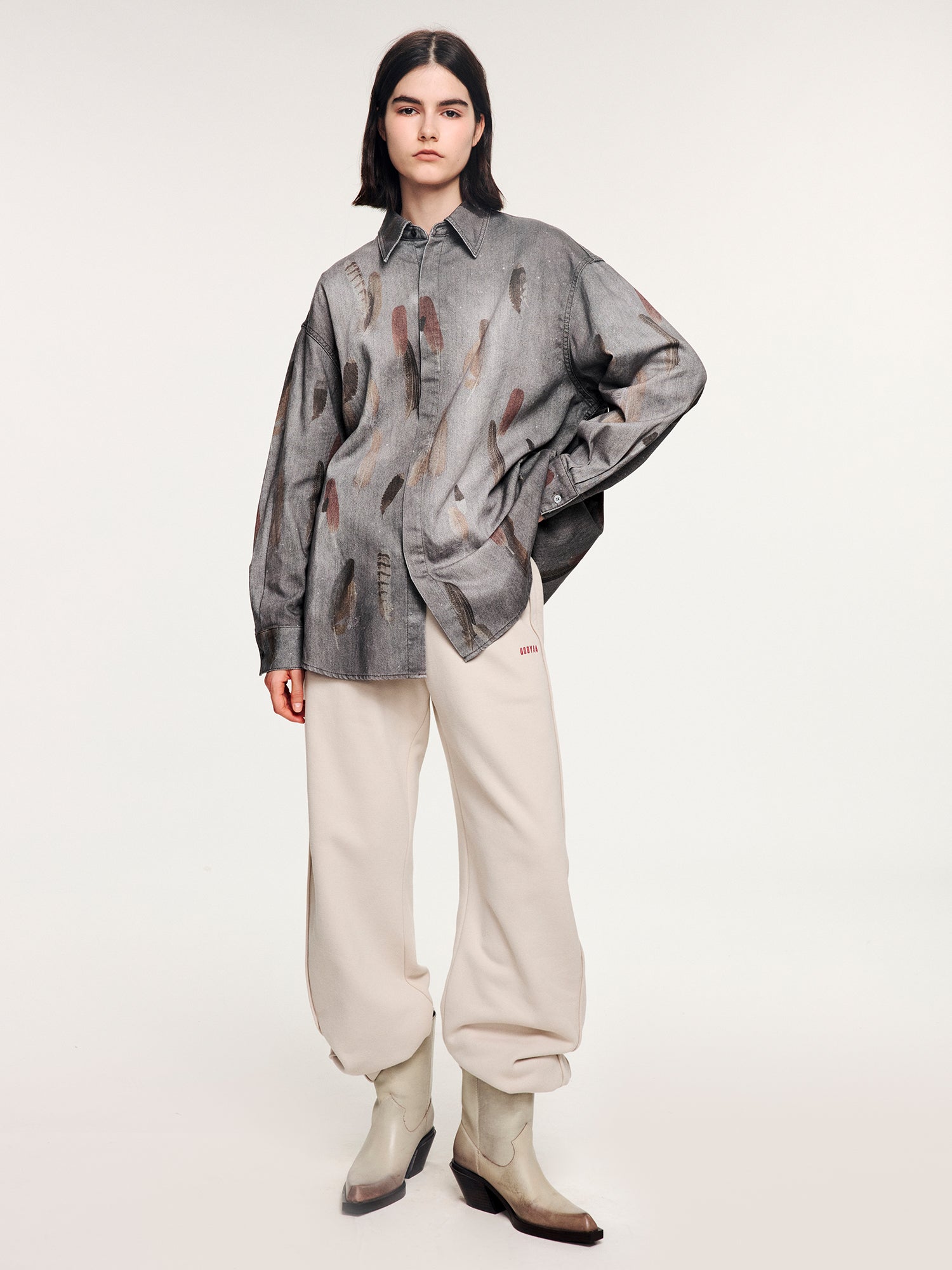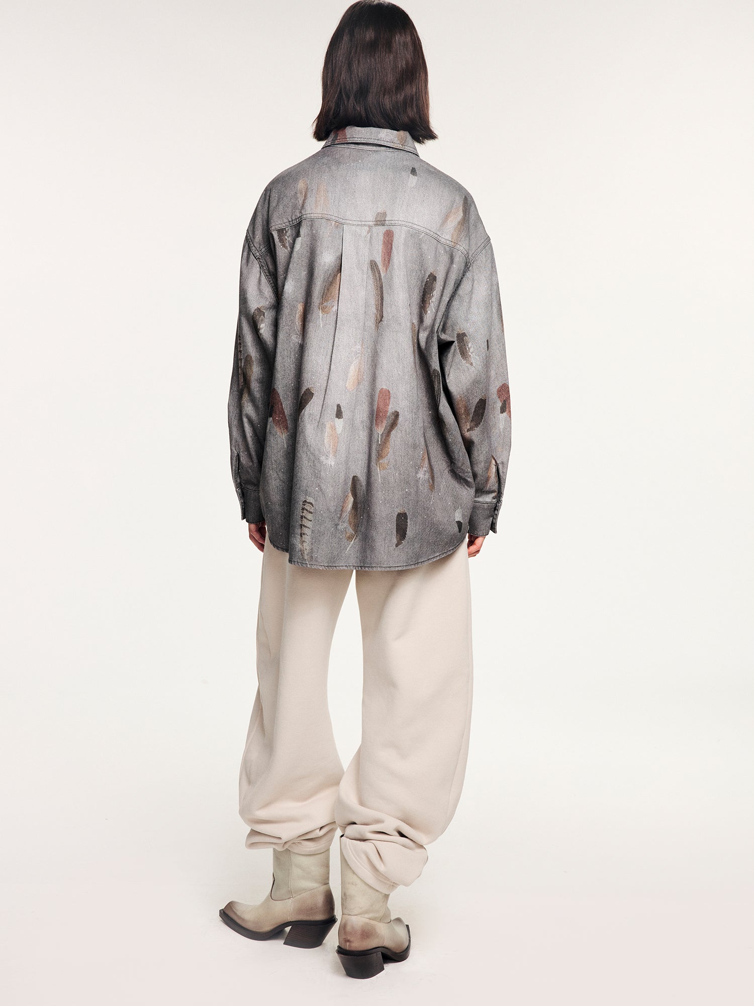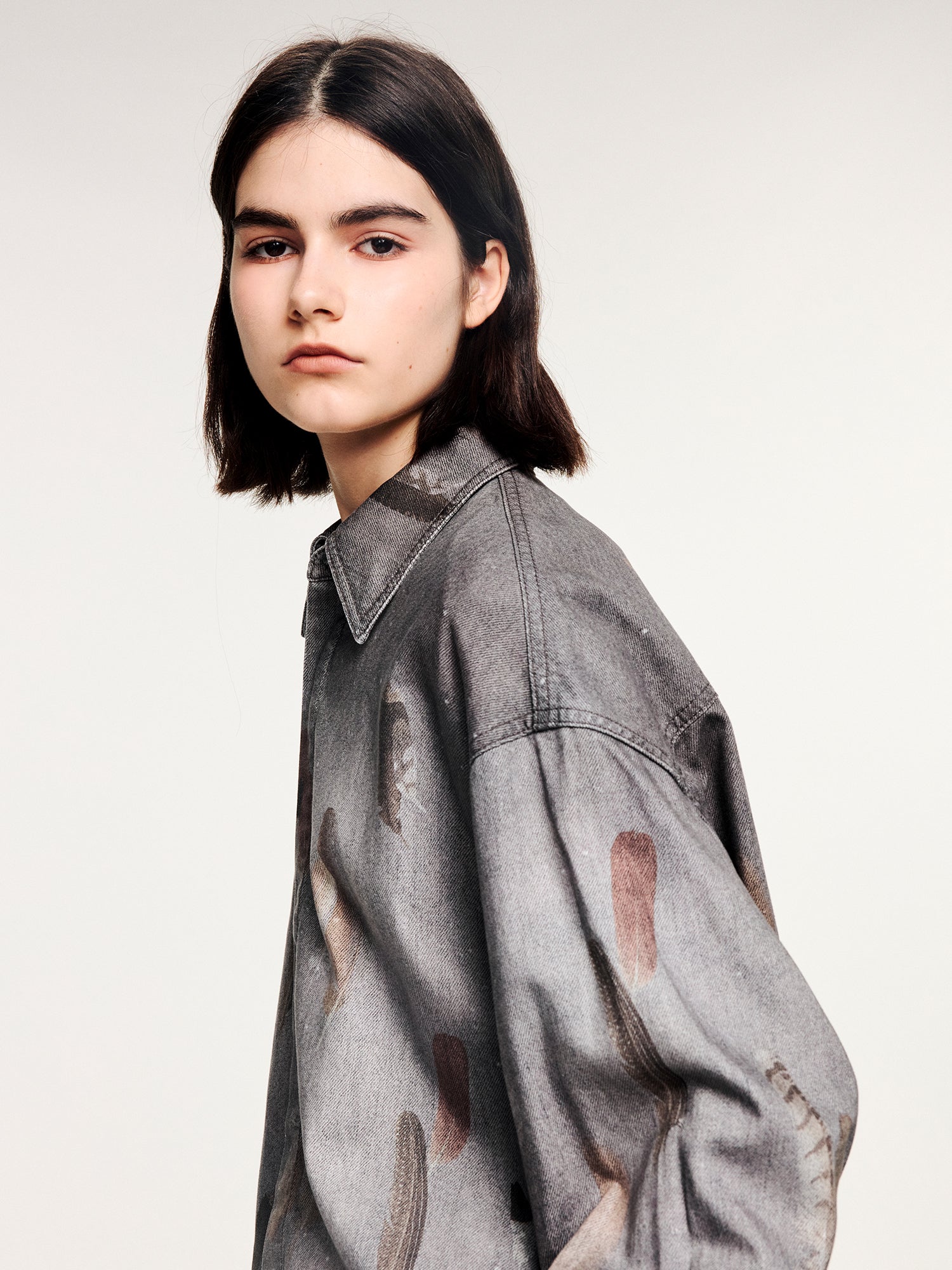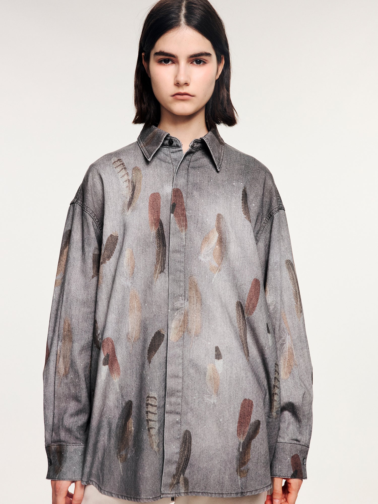 Surreal feather prints meet washed denim in a shirt that blends fantasy with laid-back cool.