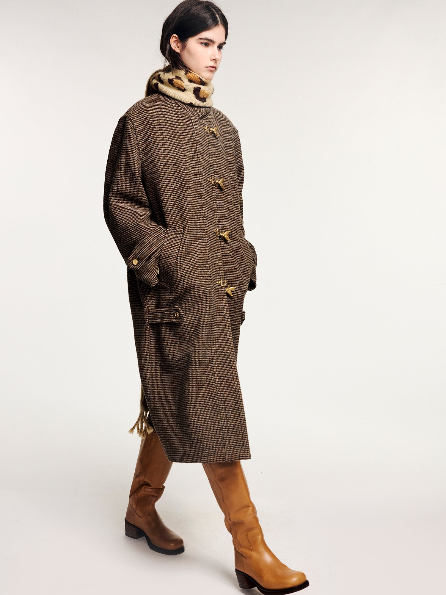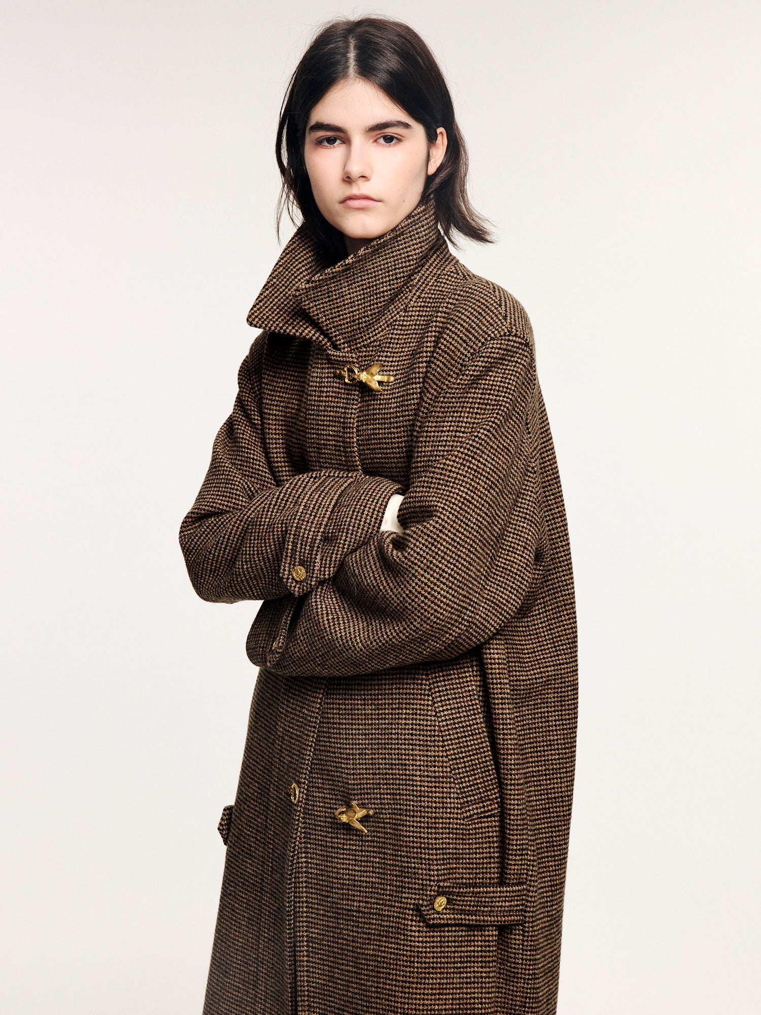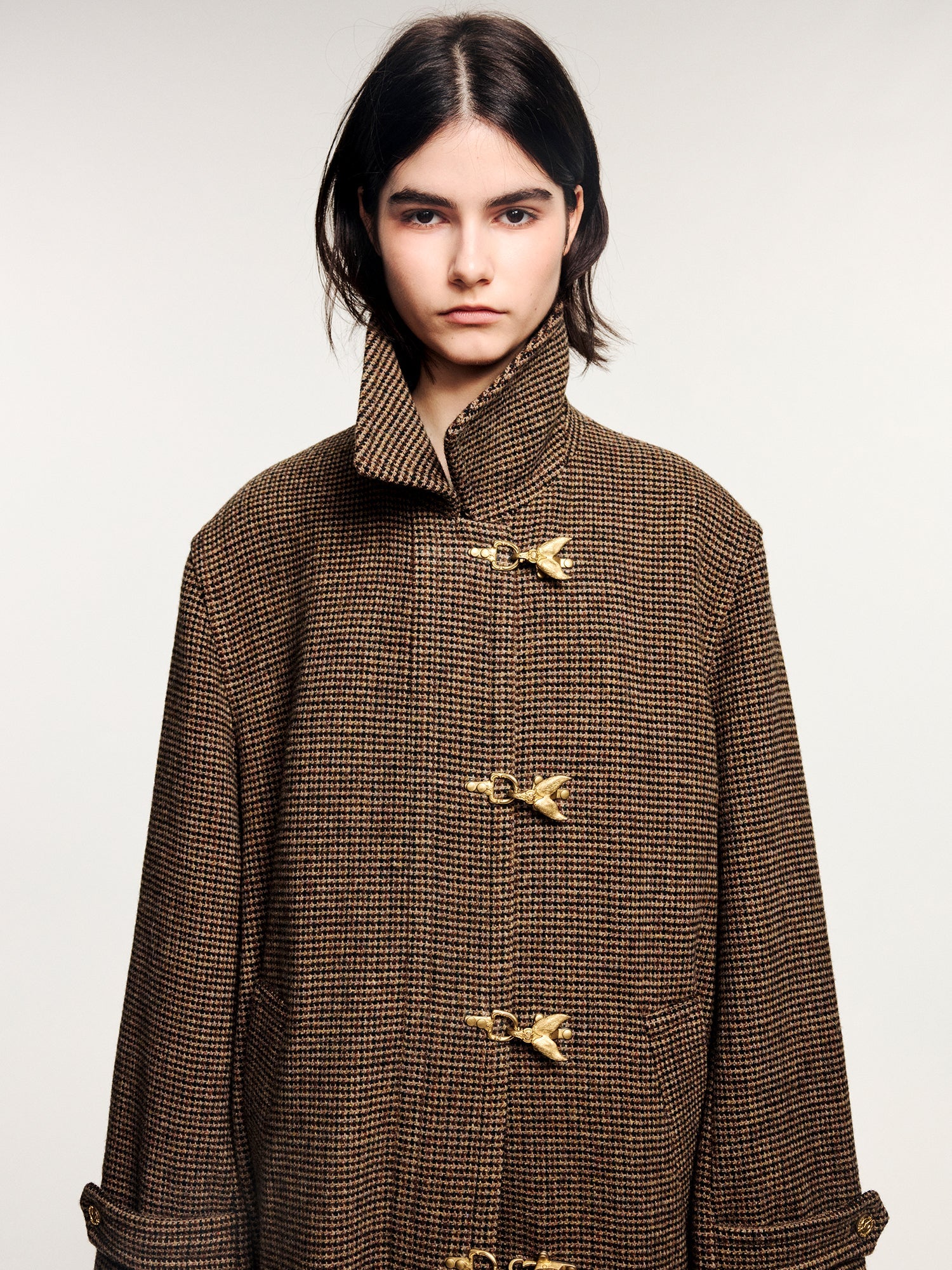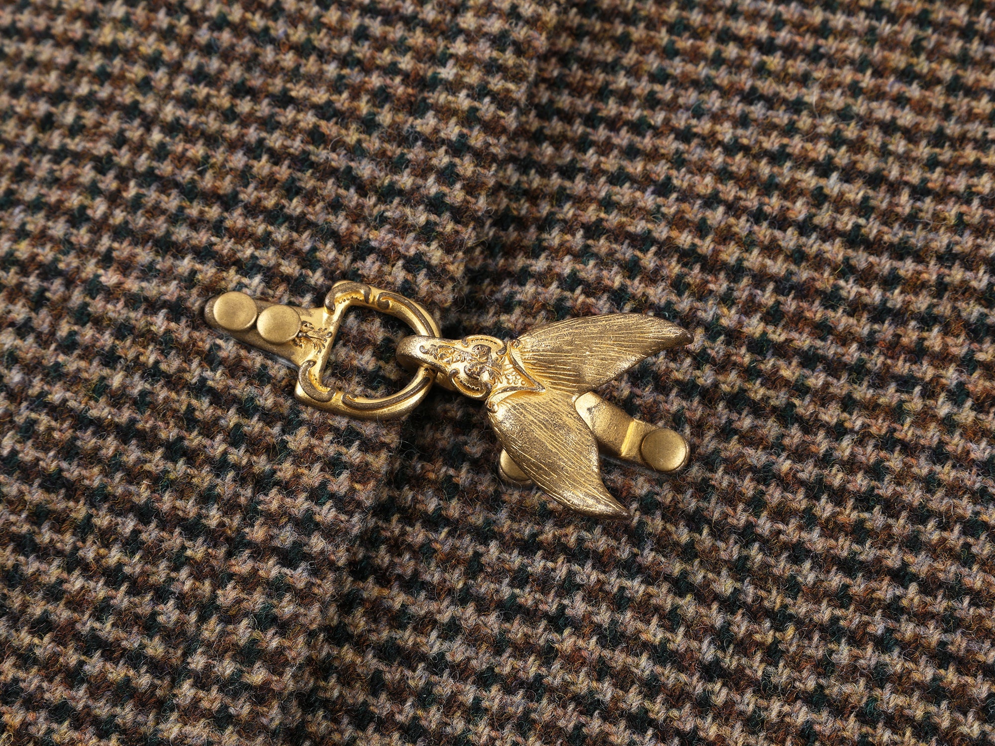 90s vintage-style coat with an inverted trapezoid silhouette, embellished with custom antique gold bird-shaped buttons.